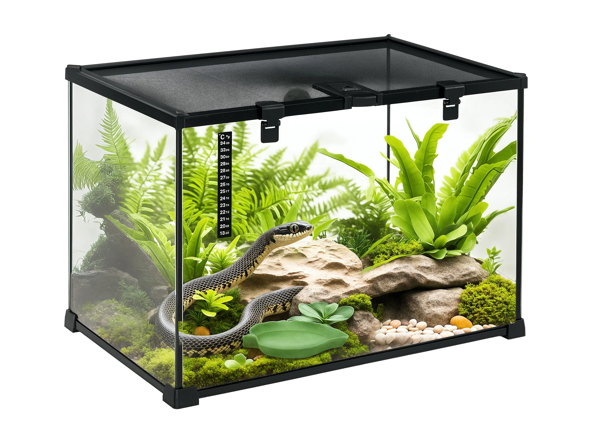 Terrarium en verre - vivarium reptile & batracien - habitat tortue - couvercle grillagé couliant verrouillable - ditributeur eau, thermomètre - métal noir verre