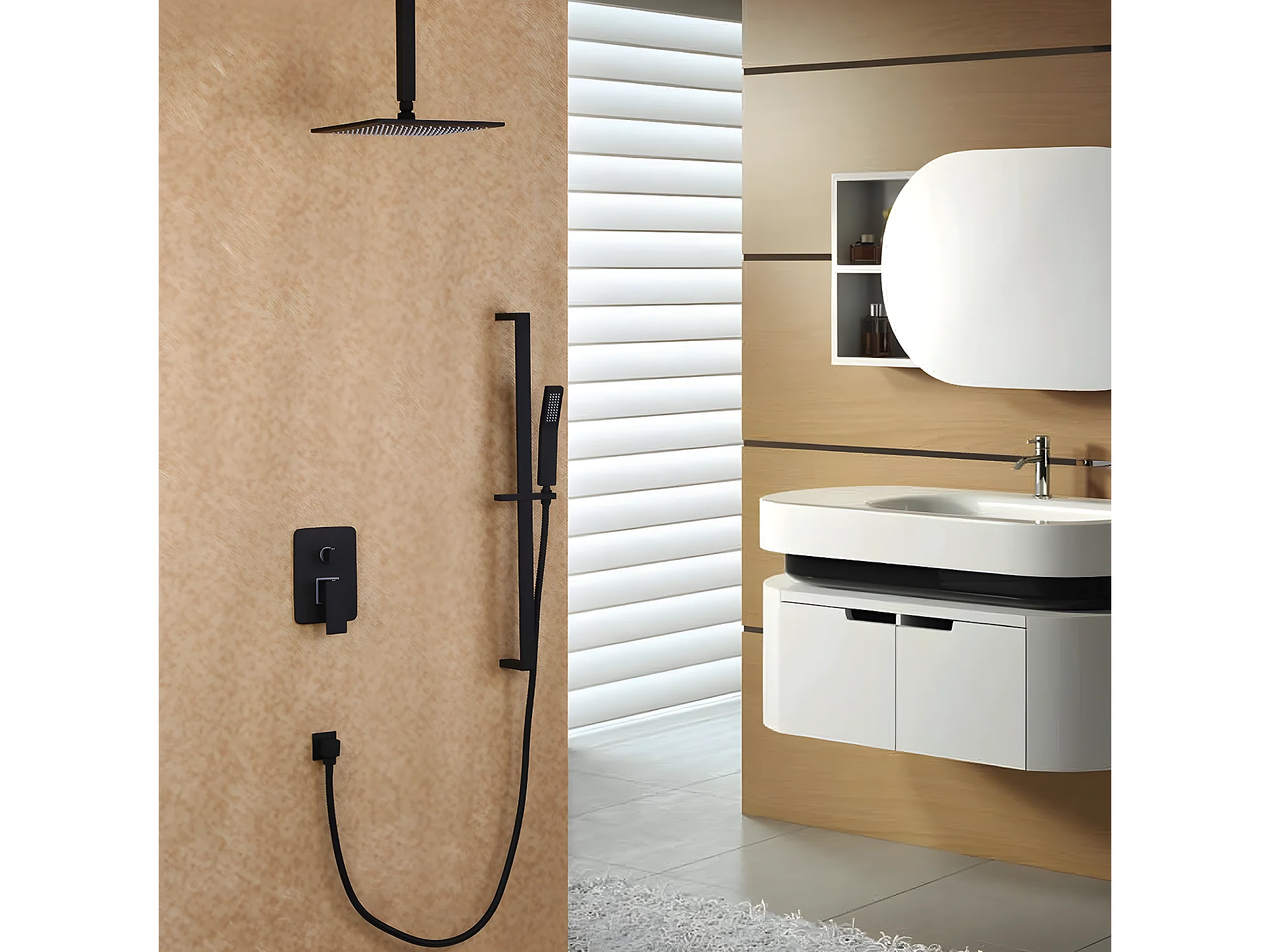 Tête de douche à fixation au plafond et système de douchette à glissière en noir 250 mm