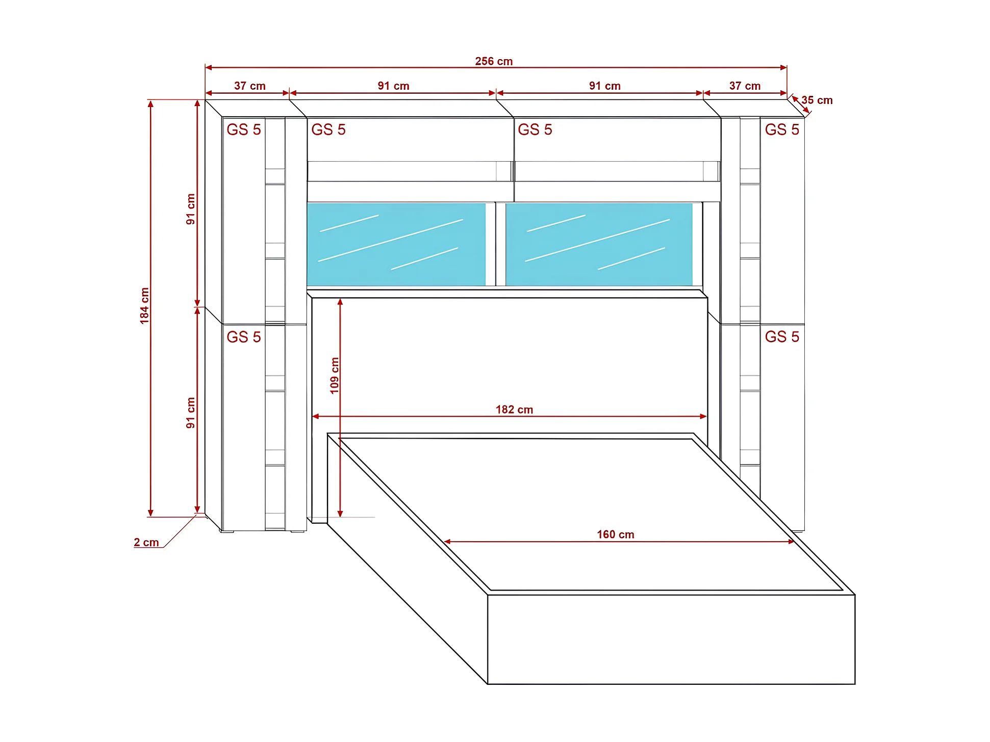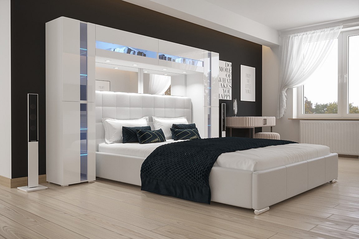 Tête de lit avec rangement Armoire - pont de lit PANAMA 14/HG/W/2-1A blanc/blanc brillant 256x184x35cm