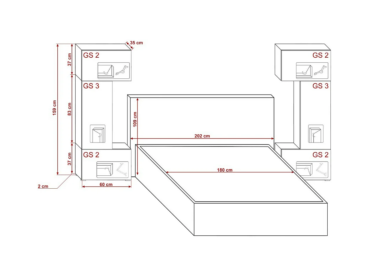 Tête de lit avec rangement Armoire - pont de lit PANAMA 3/21B/HG1 noir/noir brillant 282-322x159x35cm