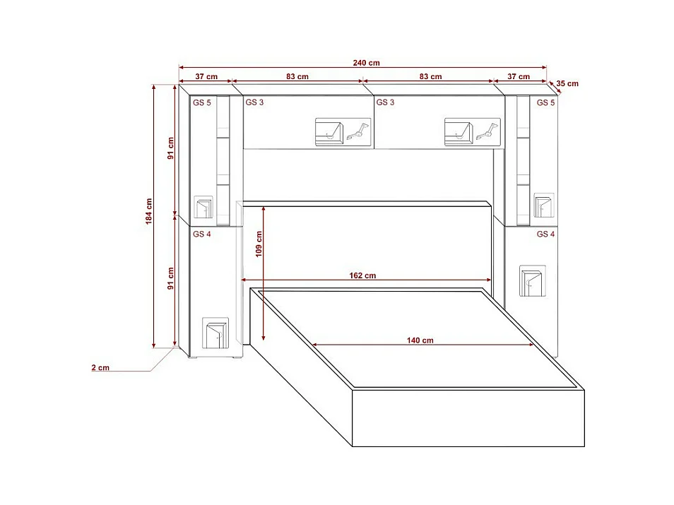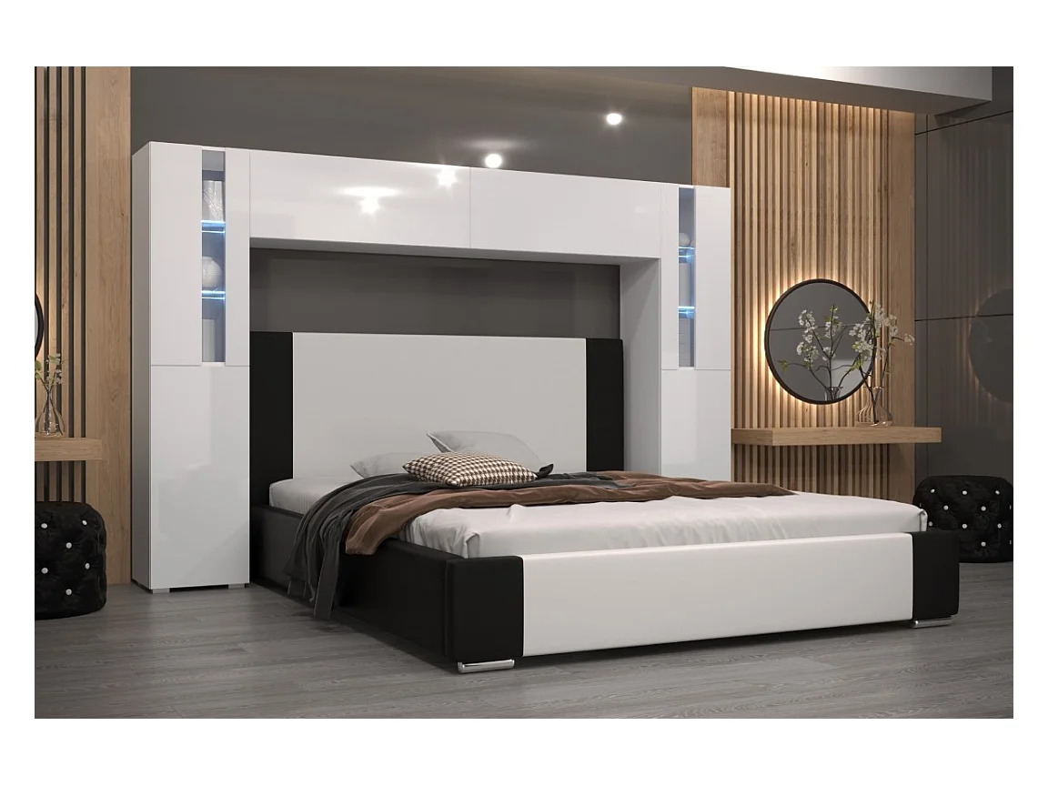 Tête de lit avec rangement Armoire - pont de lit PANAMA 8/21W/HG2-1B blanc/blanc brillant 240x184x35cm