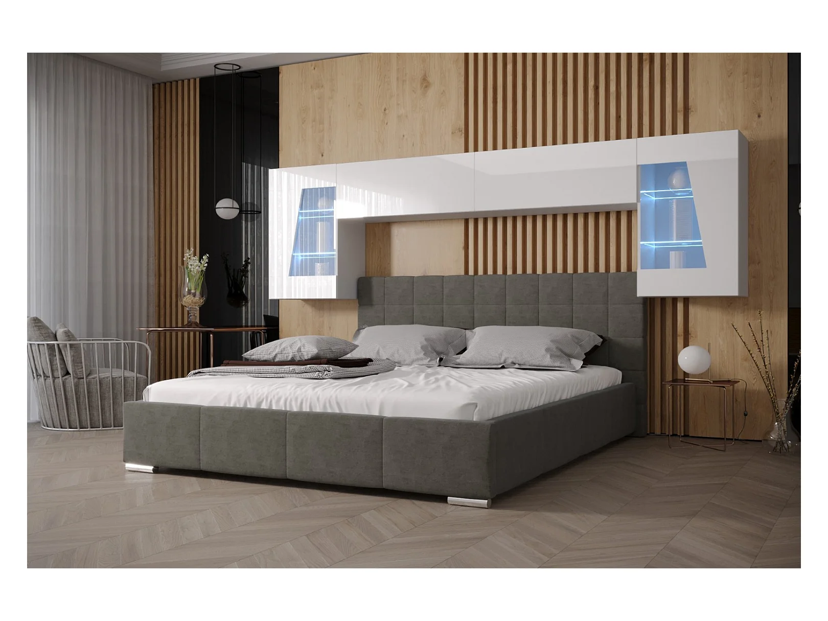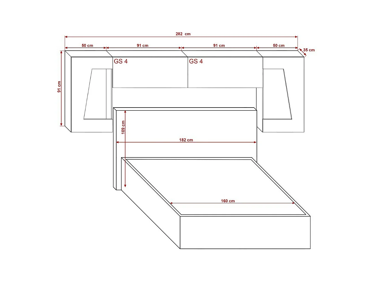 Tête de lit avec rangement Armoire - pont de lit PANAMA 10/HG/W/1-1A blanc/blanc brillant 282x91x35cm