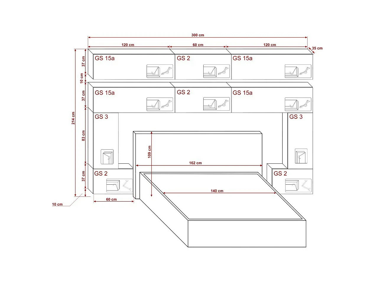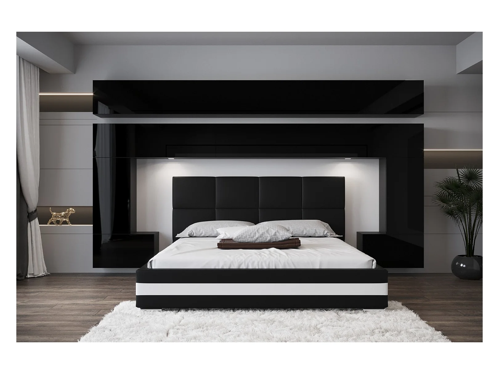 Tête de lit avec rangement Armoire - pont de lit PANAMA 5/HG/B/1-1C noir/noir brillant 300x214x35cm