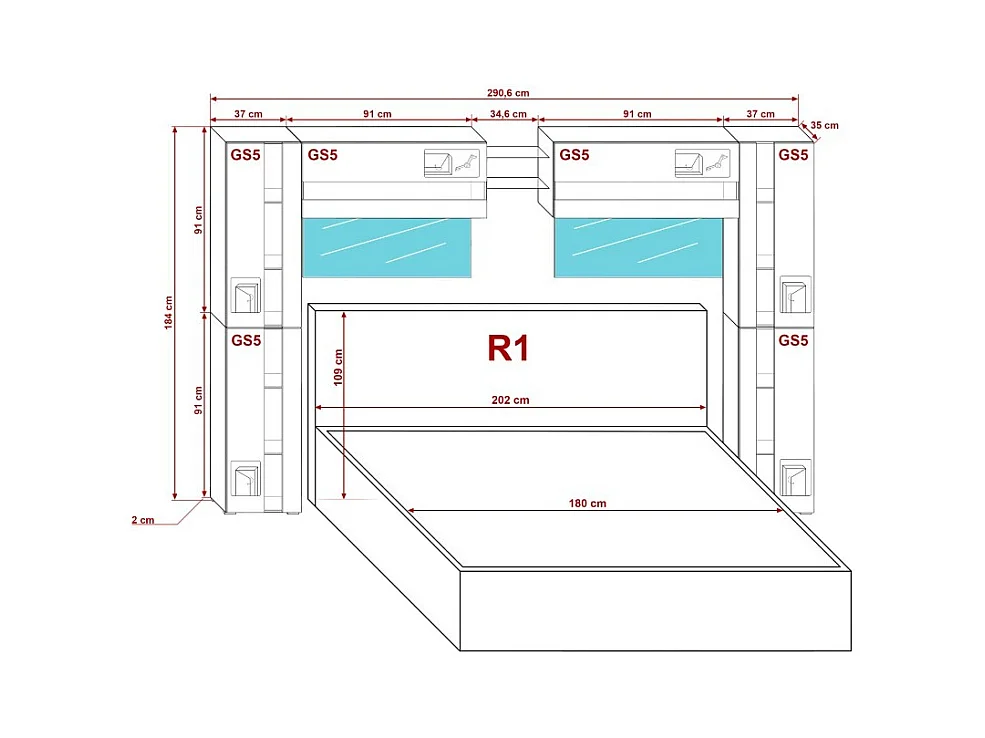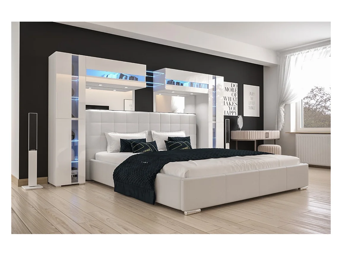 Tête de lit avec rangement Armoire - pont de lit PANAMA 14/HG/W/2-1C blanc/blanc brillant 290x184x35cm