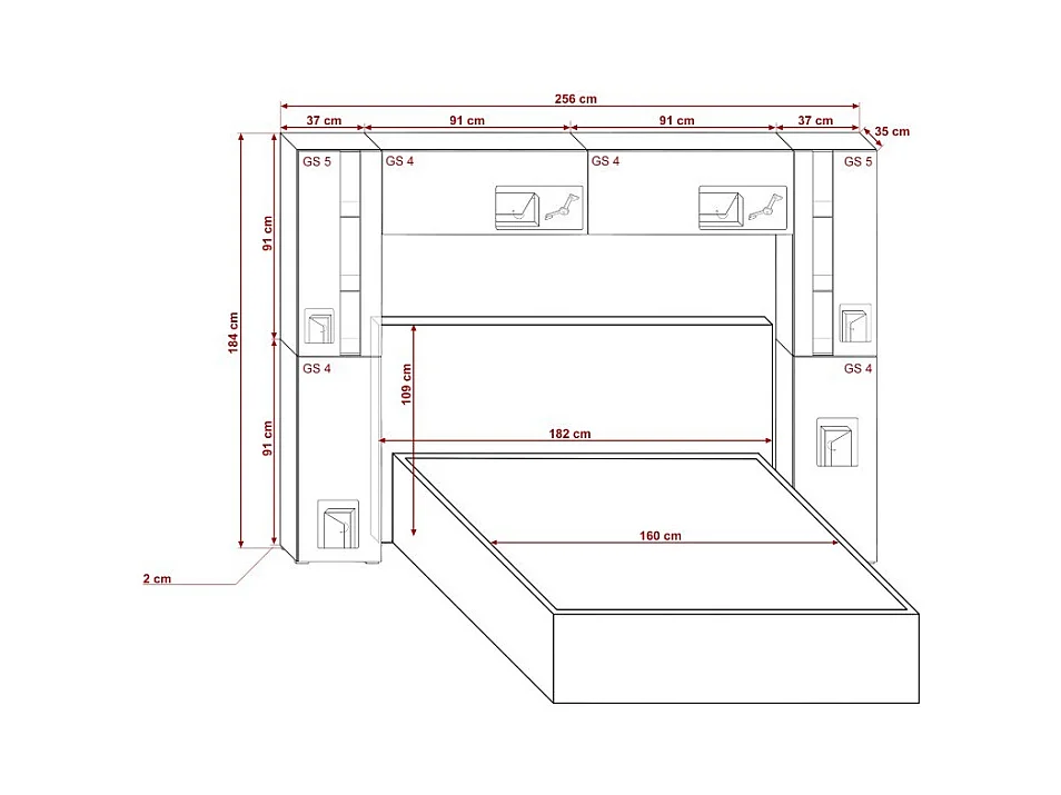 Tête de lit avec rangement Armoire - pont de lit PANAMA 8/21W/HG2-1A blanc/blanc brillant 256x184x35cm