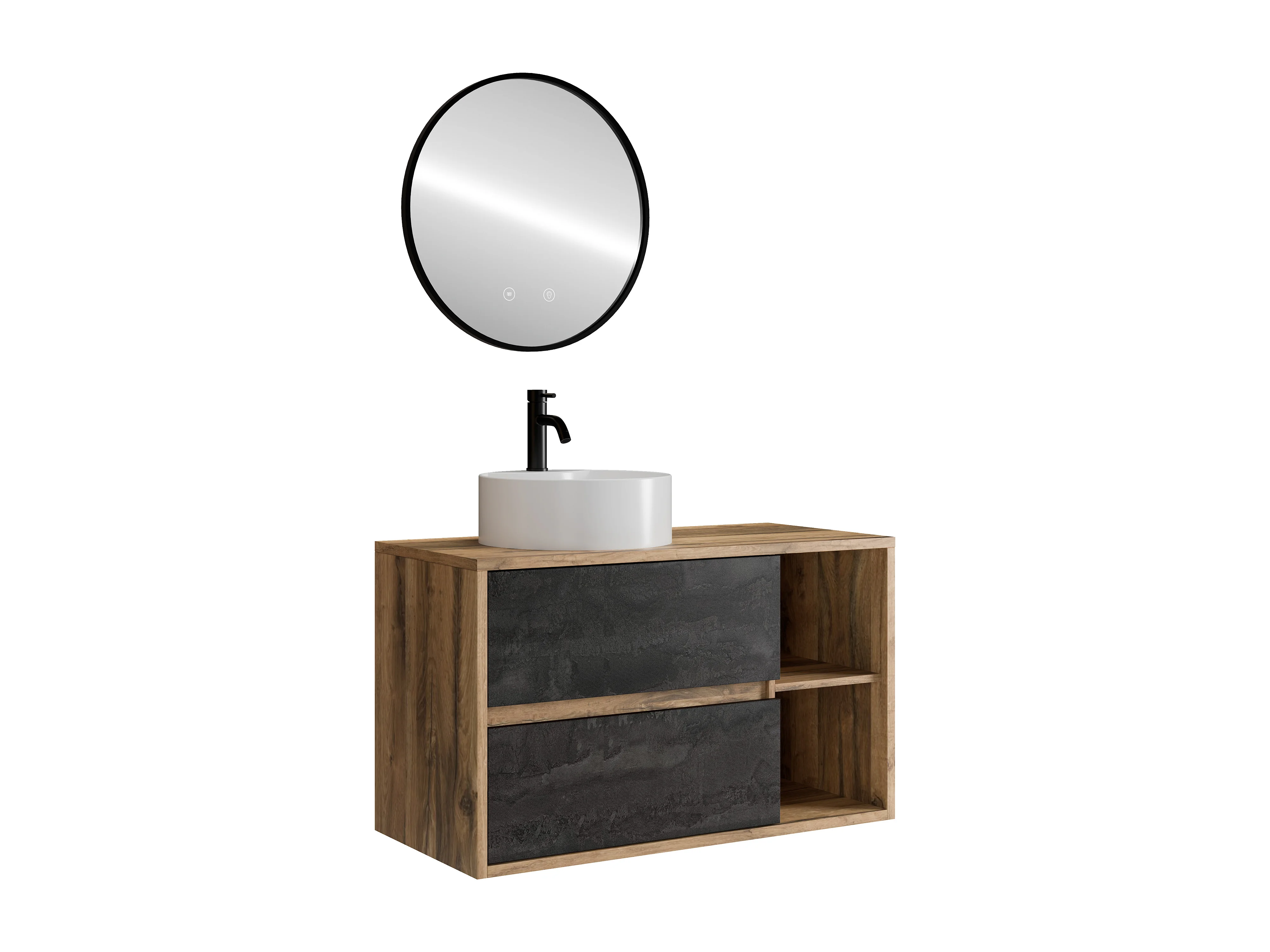 Meuble de salle de bain suspendu avec vasque ronde, robinet et miroir - Coloris naturel et anthracite - 100 cm - TIKITIKI