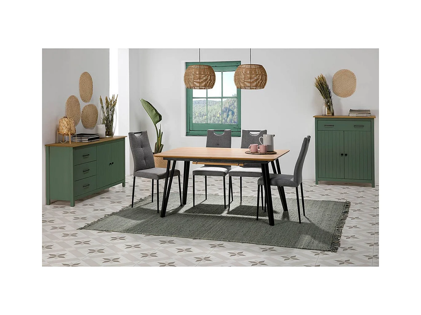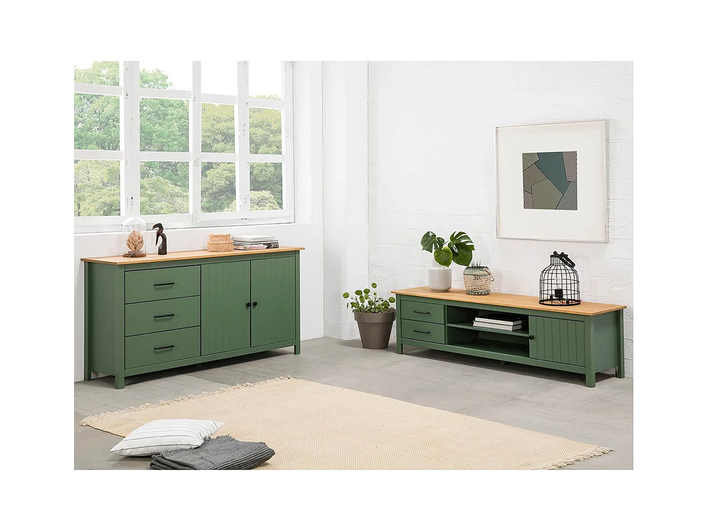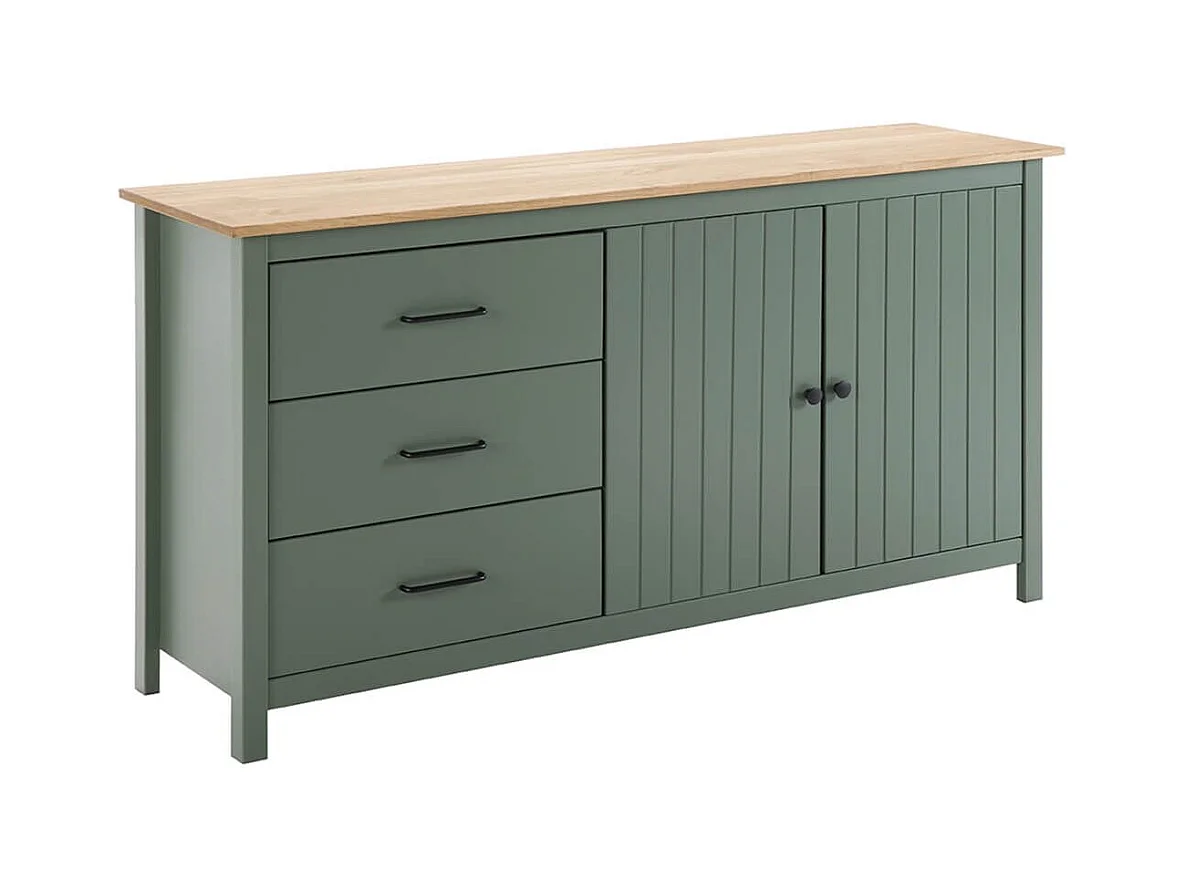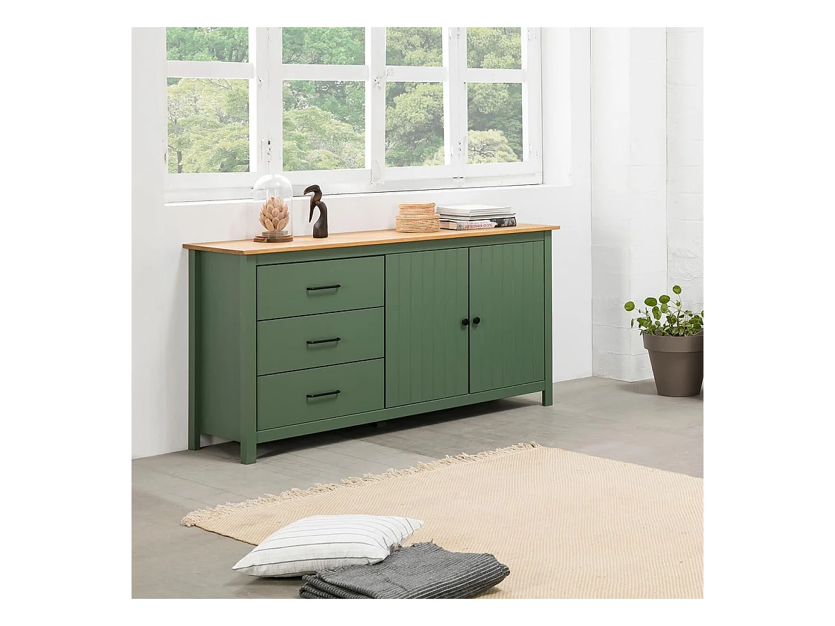 TINA - Buffet Bas 2 Portes 3 Tiroirs Bois Ciré et Vert