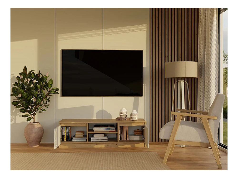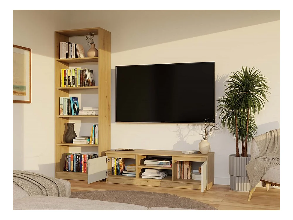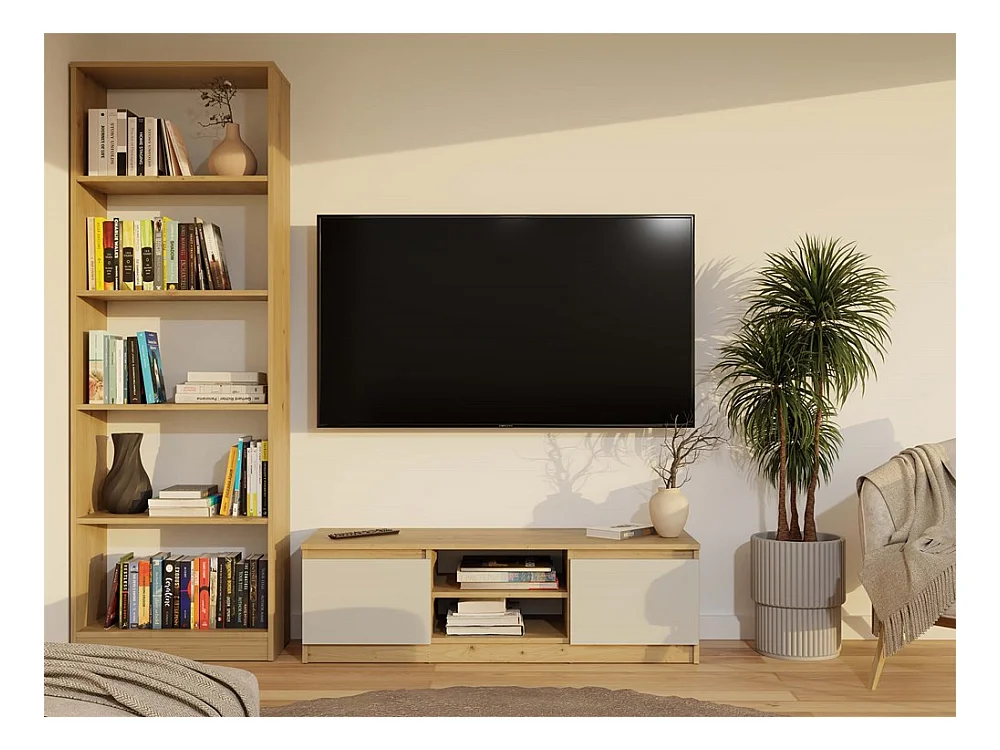 LOWAN - Meuble TV 2 Niches 2 Portes Effet Tasseaux Teinté Chêne Clair