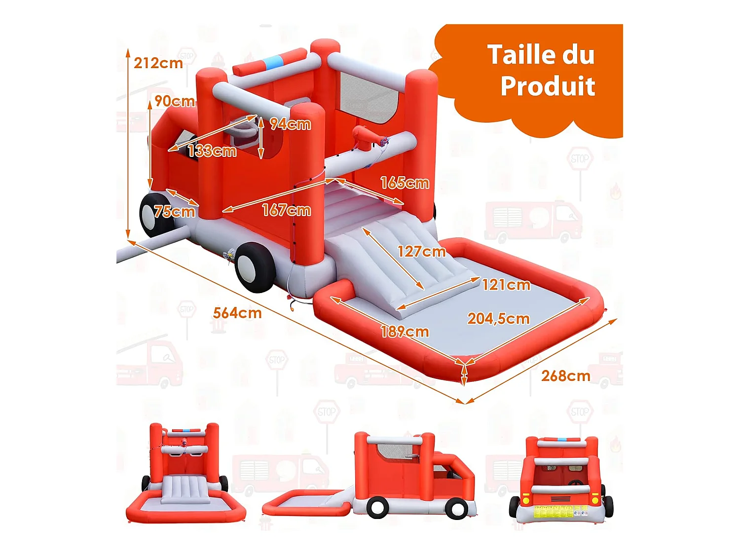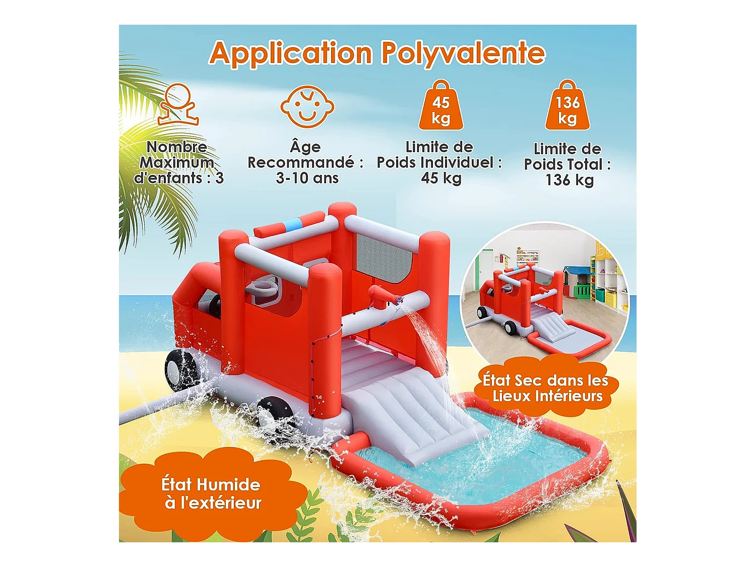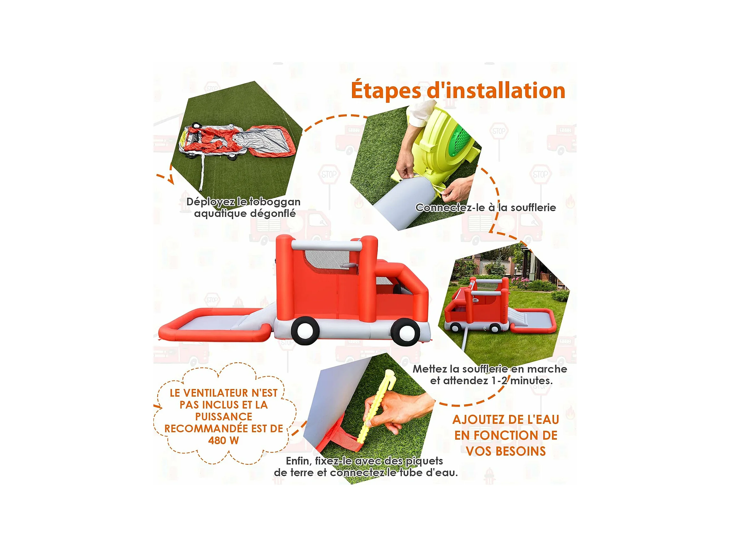 Toboggan Aquatique Gonflable pour Enfants sur Le Thème Voiture de Pompiers avec Piscine à Eclaboussures, Zone de Rebond,Ballon de Basket(sans Gonfleur)