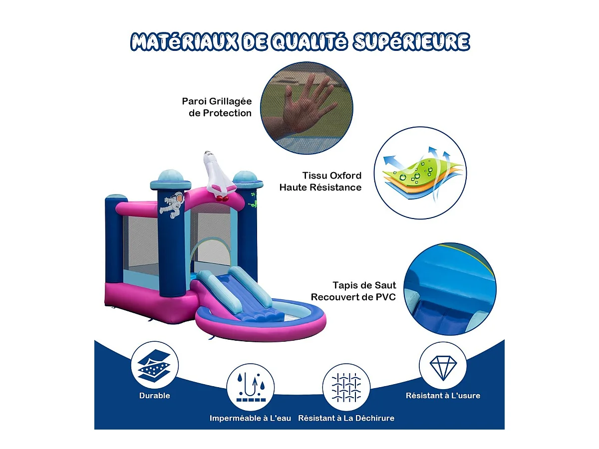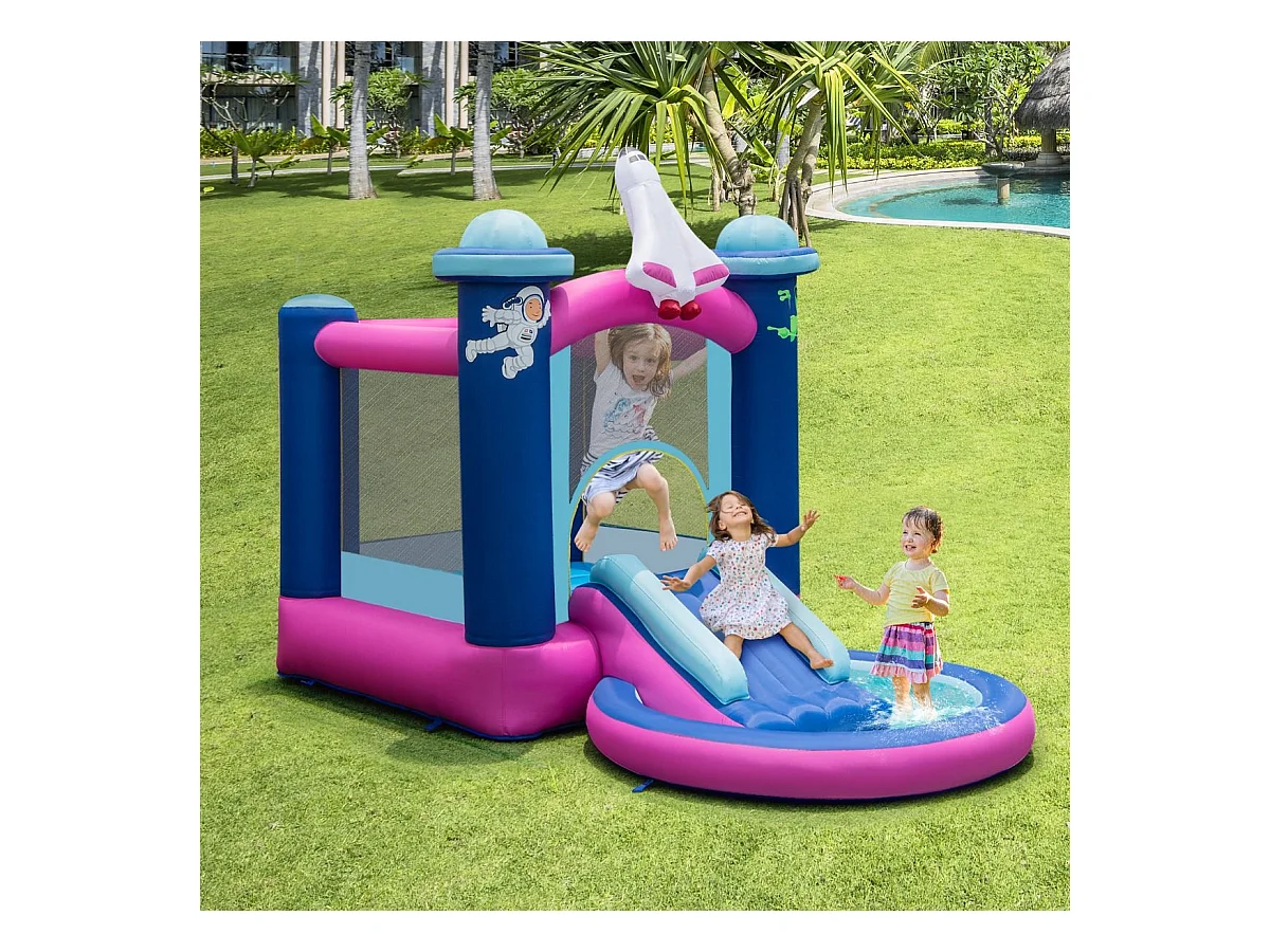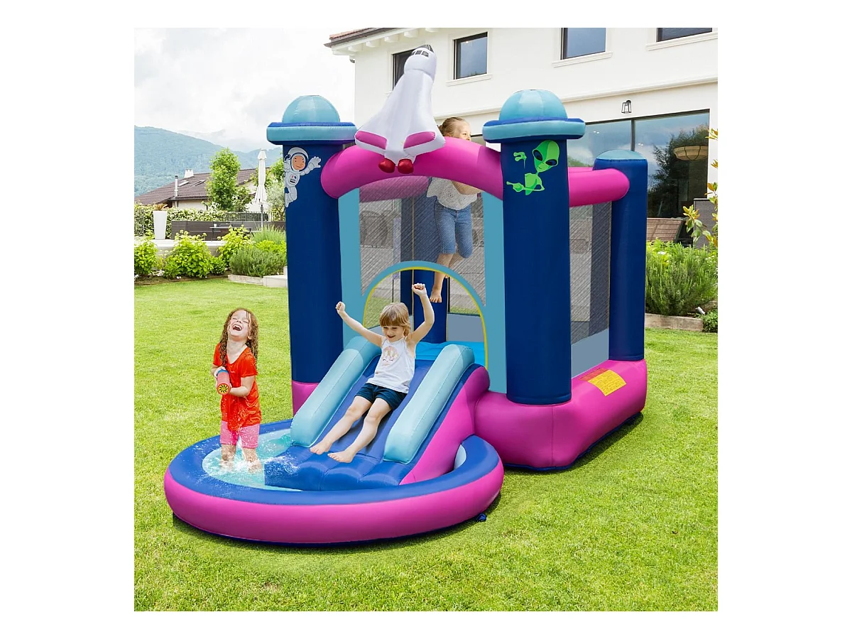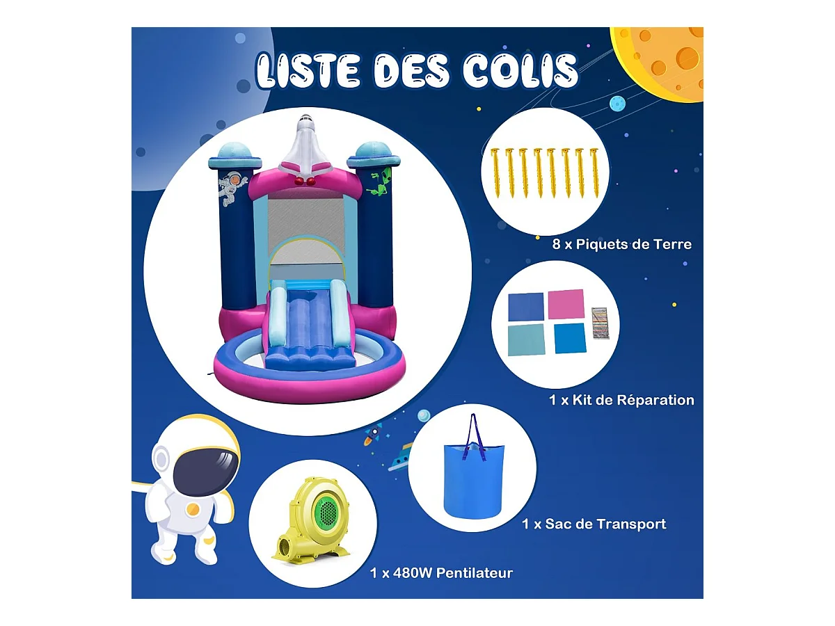 Toboggan Aquatique Gonflable Thème de l'espace avec Gonfleur 480 W Piscine à Eclaboussures Toboggan Portable,Sac de Transport et Piquets