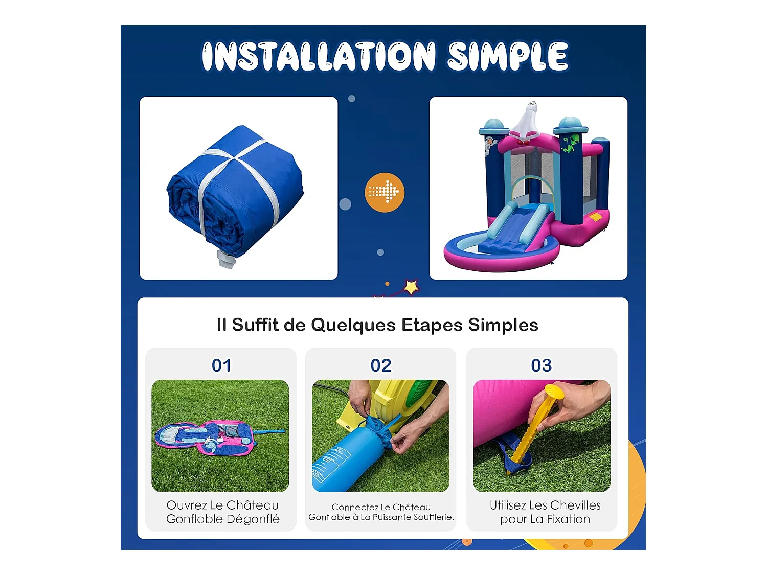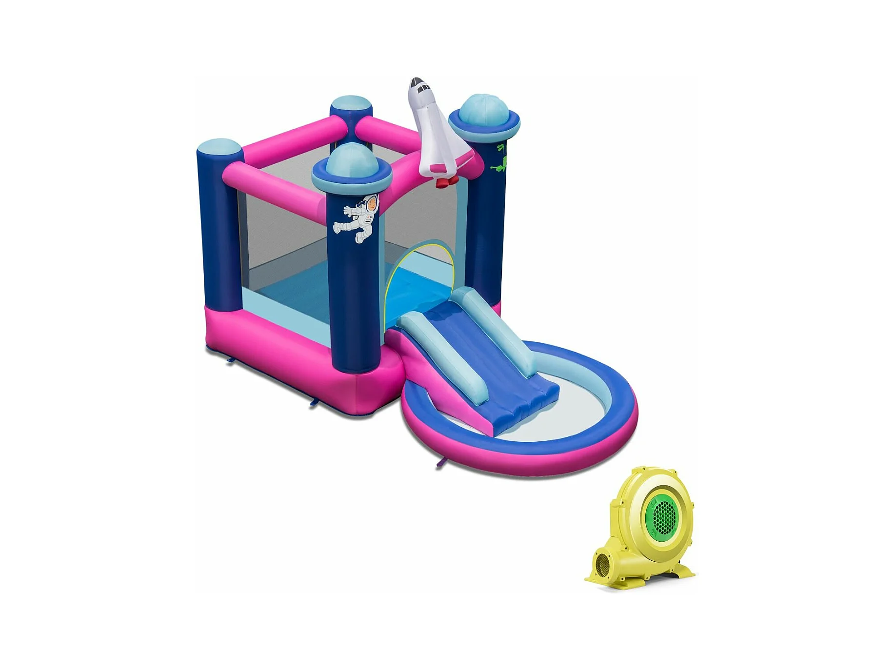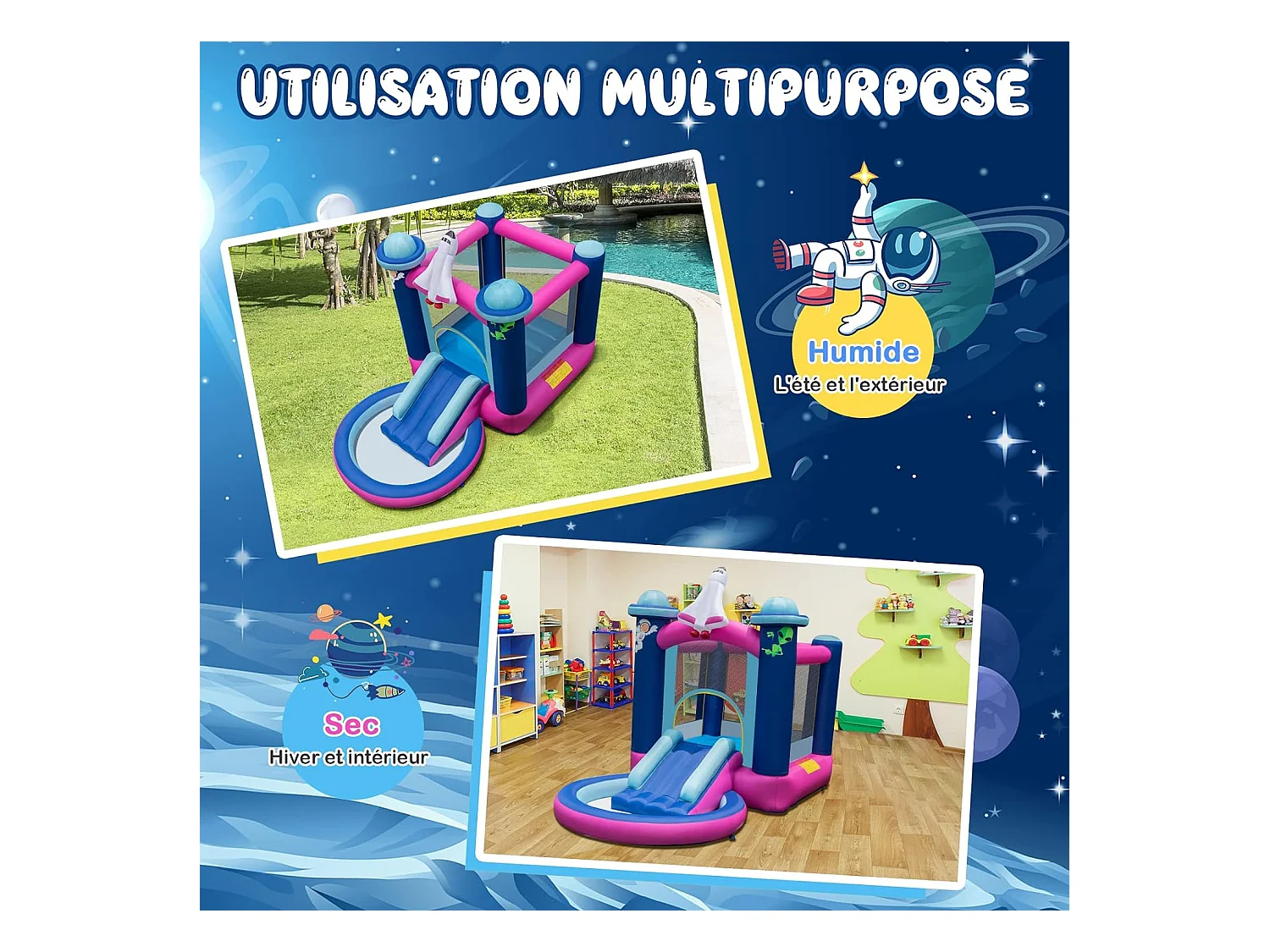 Toboggan Aquatique Gonflable Thème de l'espace avec Gonfleur 480 W Piscine à Eclaboussures Toboggan Portable,Sac de Transport et Piquets