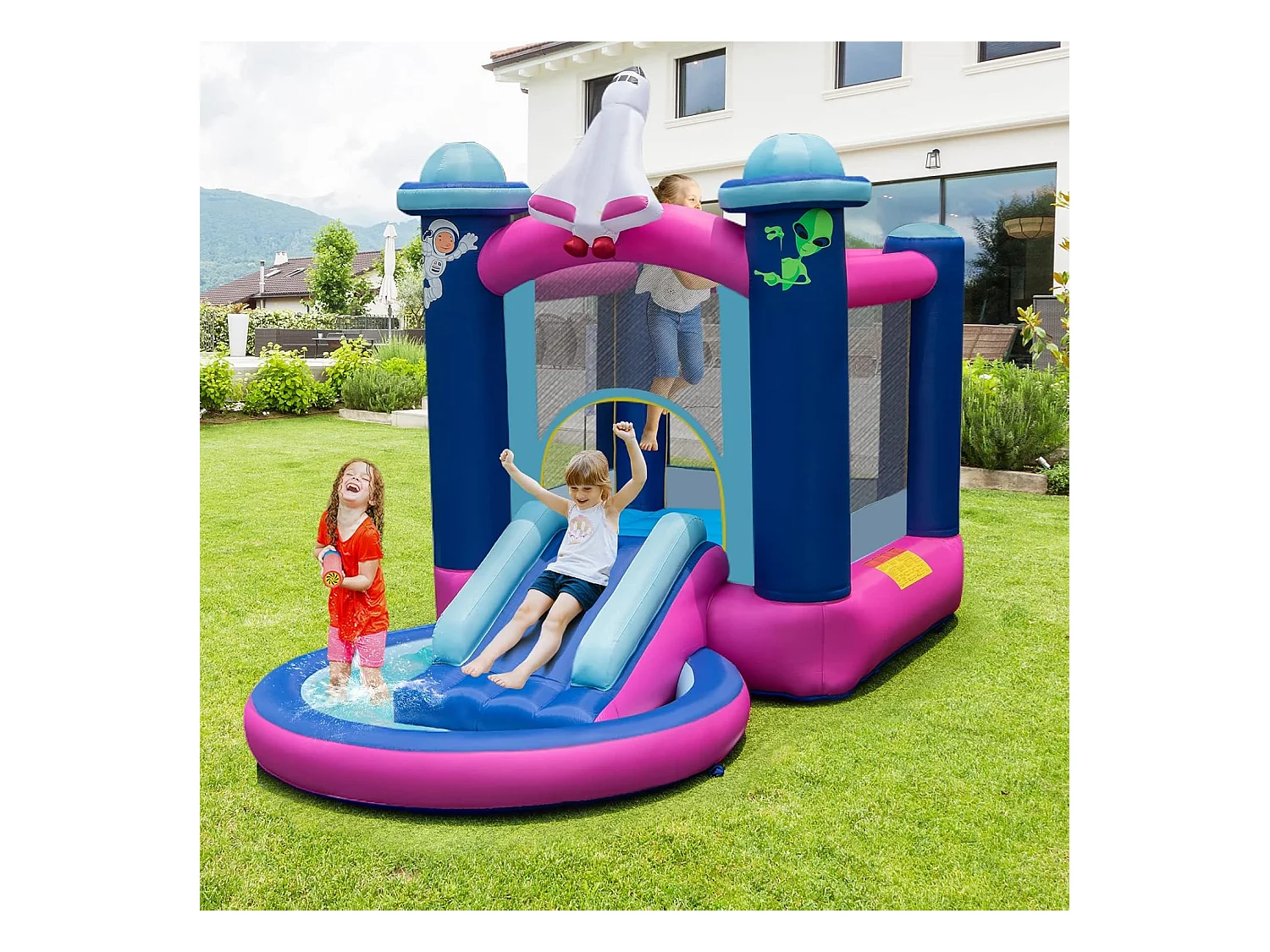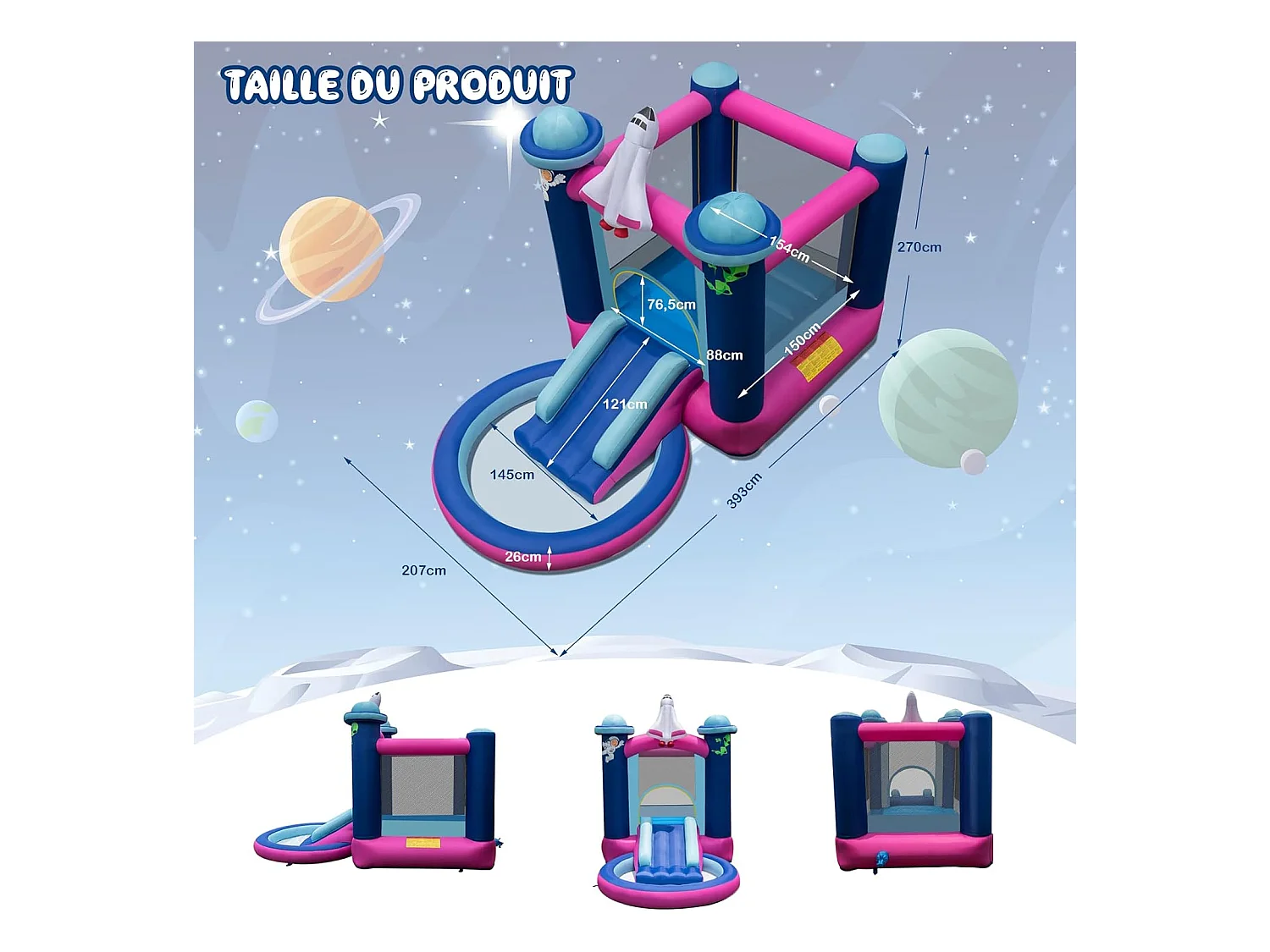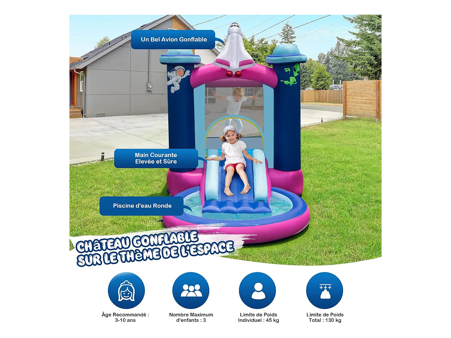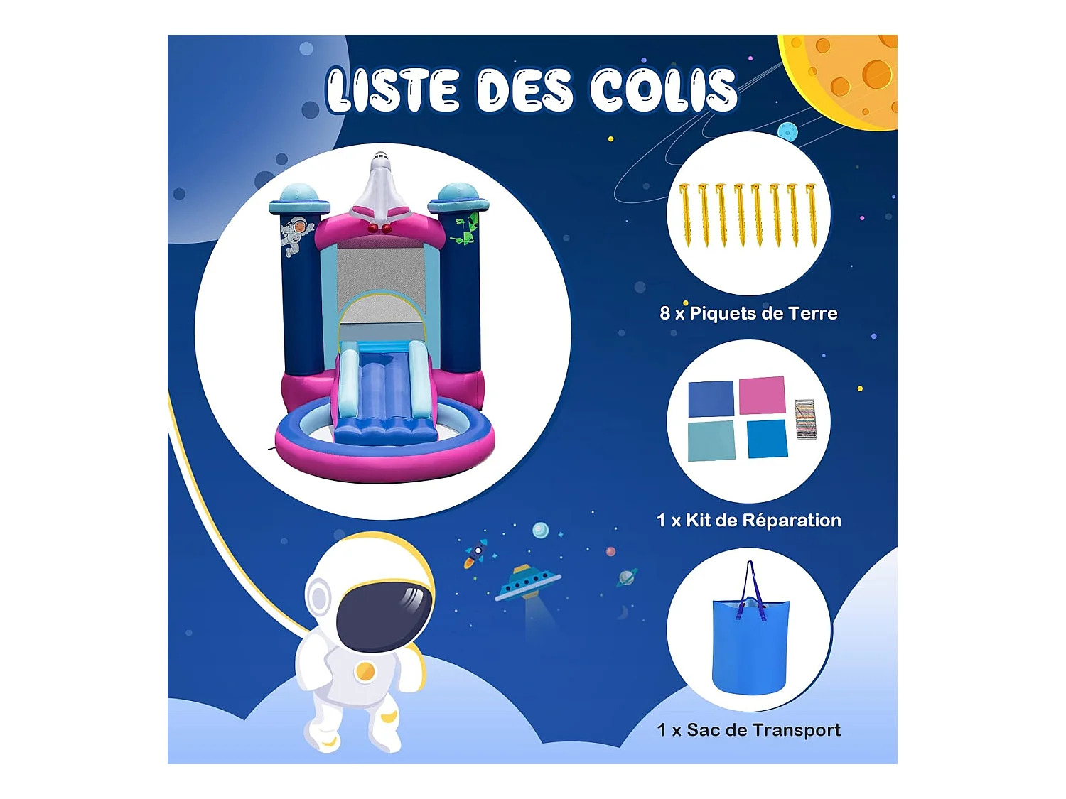 Toboggan Aquatique Gonflable Thème de l'espace avec Piscine à Eclaboussures Toboggan Portable,Sac de Transport et Piquets(sans Gonfleur)