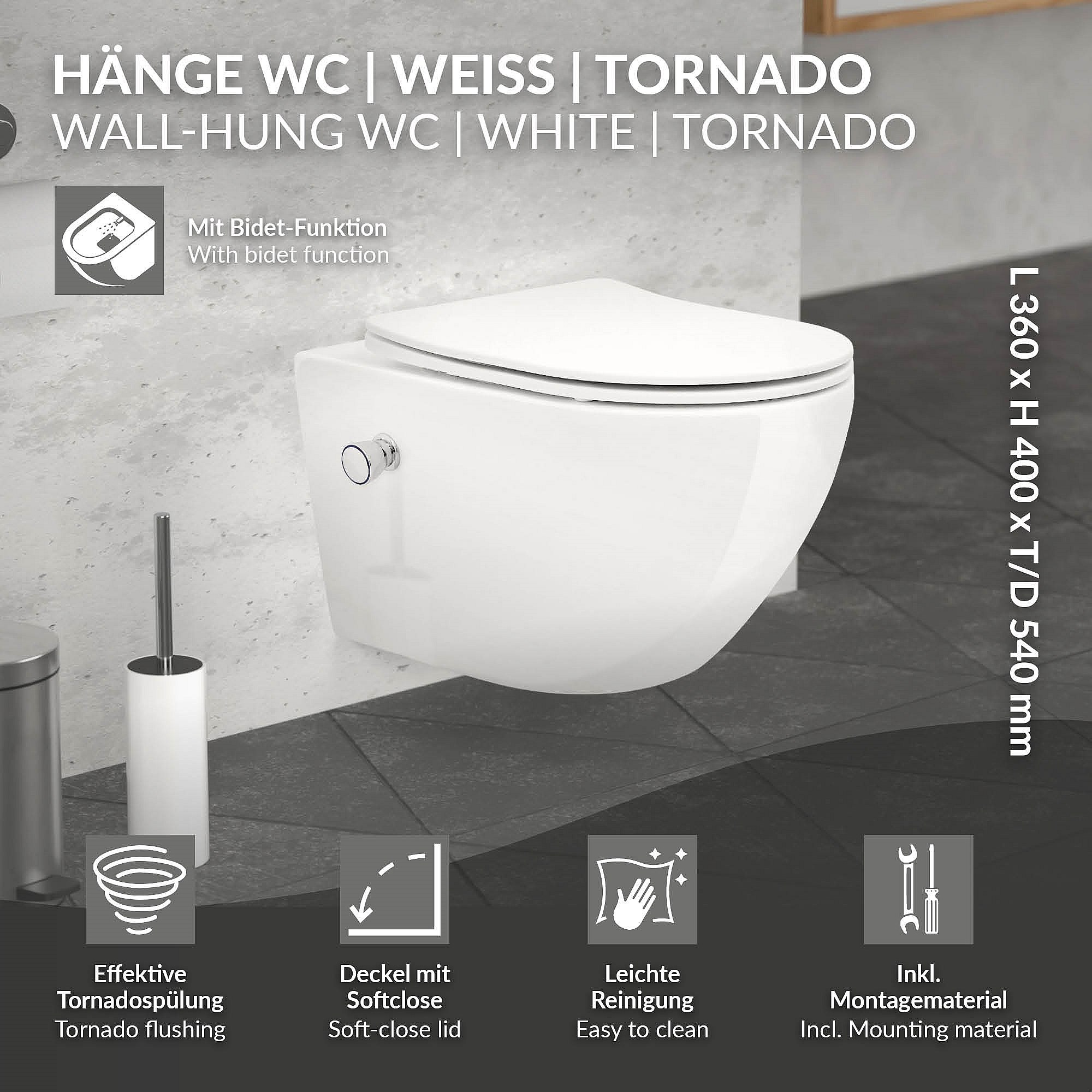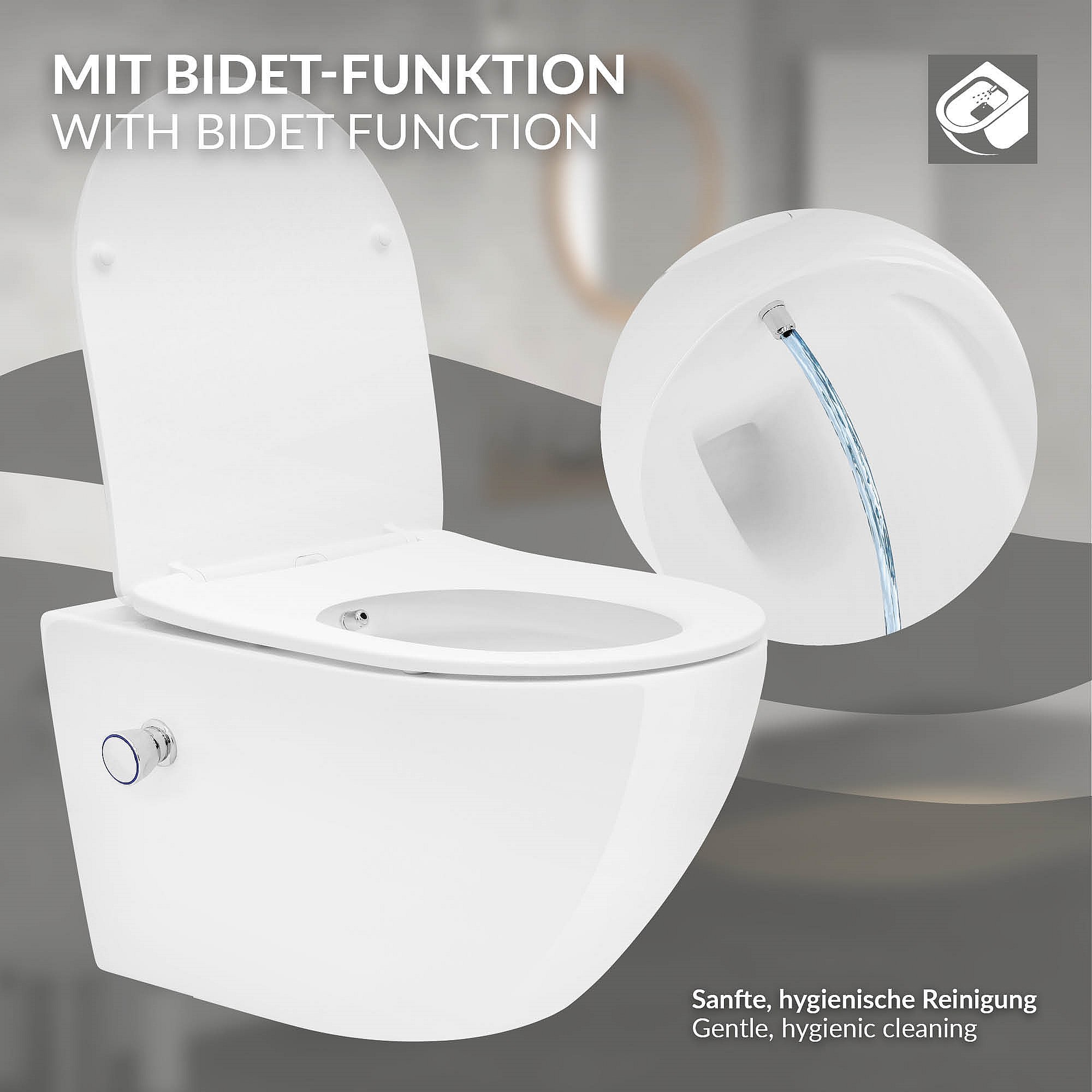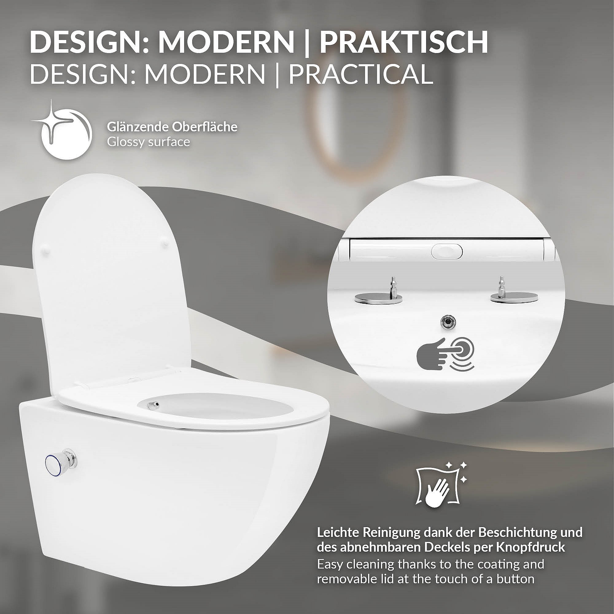 Toilette suspendu sans rebord blanc WC Soft Close fonction bidet salle de bain