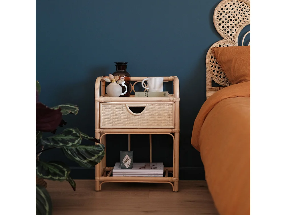Table de chevet Bali avec 1 tiroir en rotin et panneaux de particules - Beige