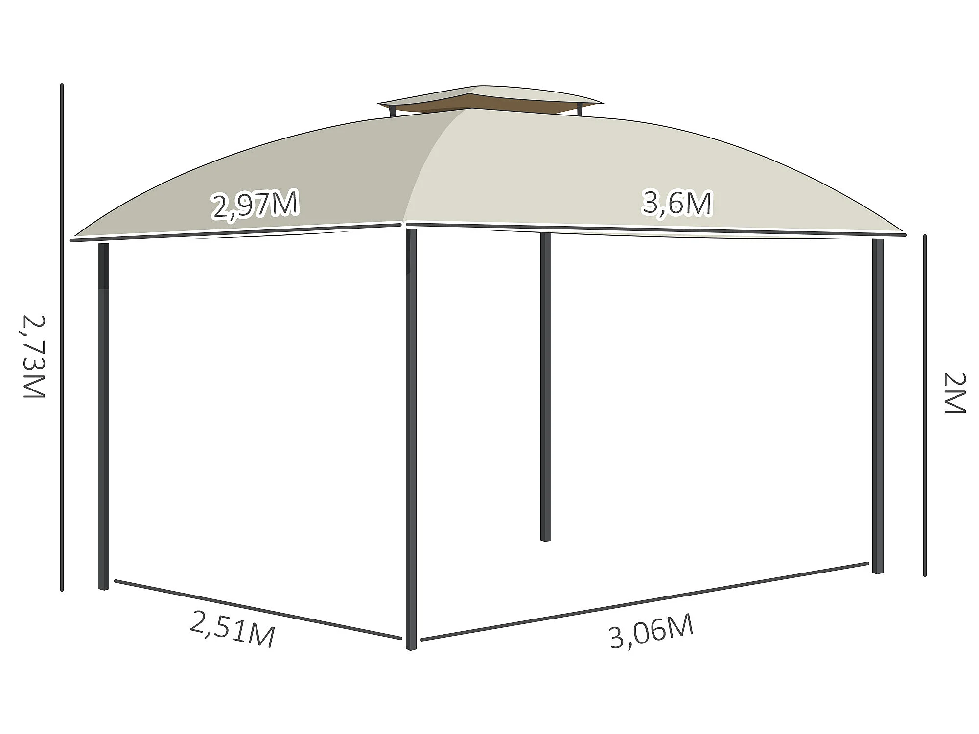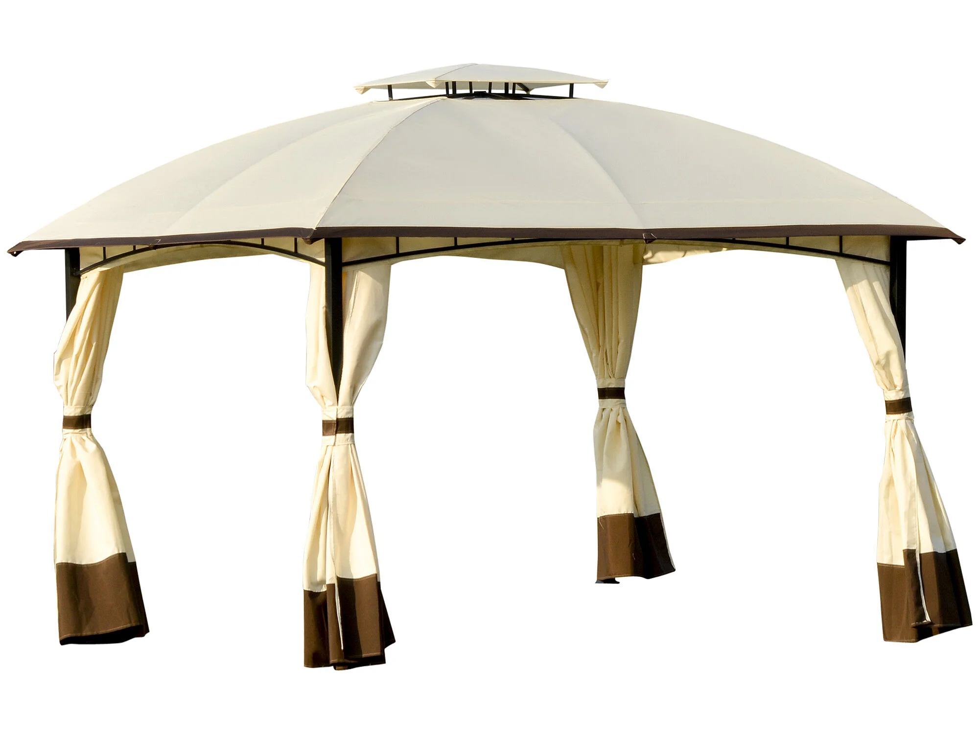 Tonnelle barnum pavillon de jardin style colonial double toit toiles latérales amovibles 3,6L x 2,97l x 2,73H m polyester crème café