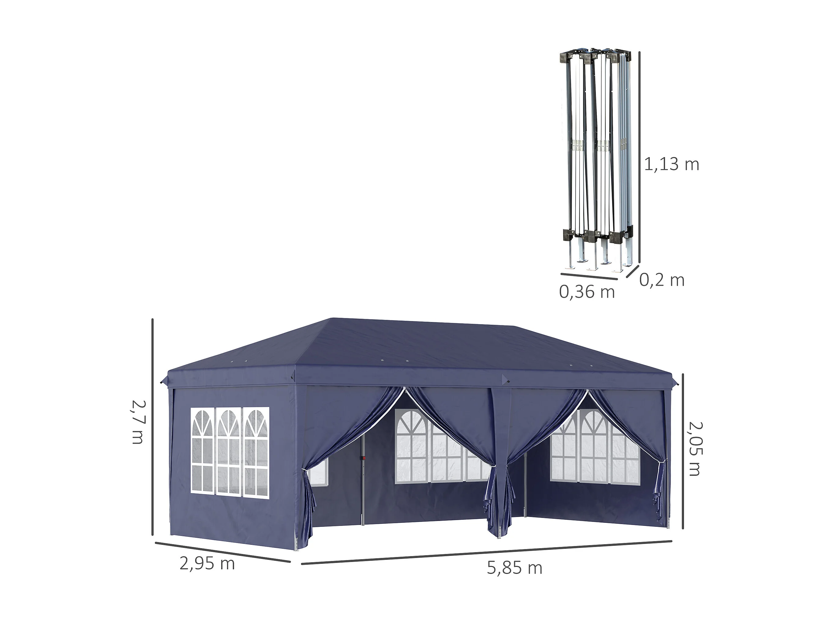 Tonnelle barnum pliant pop-up imperméabilisé 5,85L x 2,95l x 2,7H m 6 parois latérales amovibles 4 fenêtres + sac de transport bleu