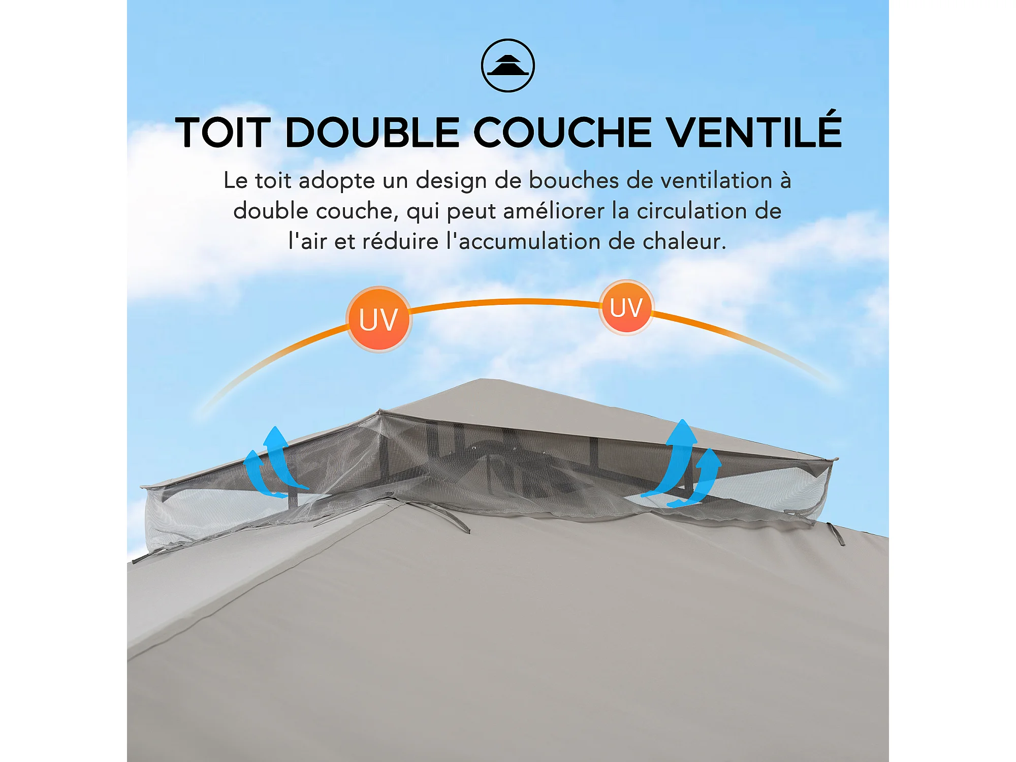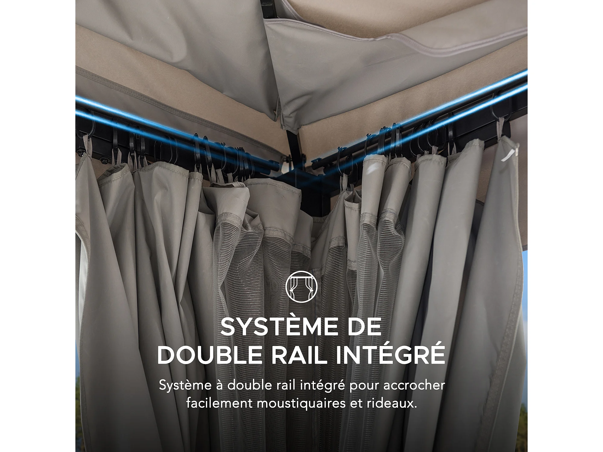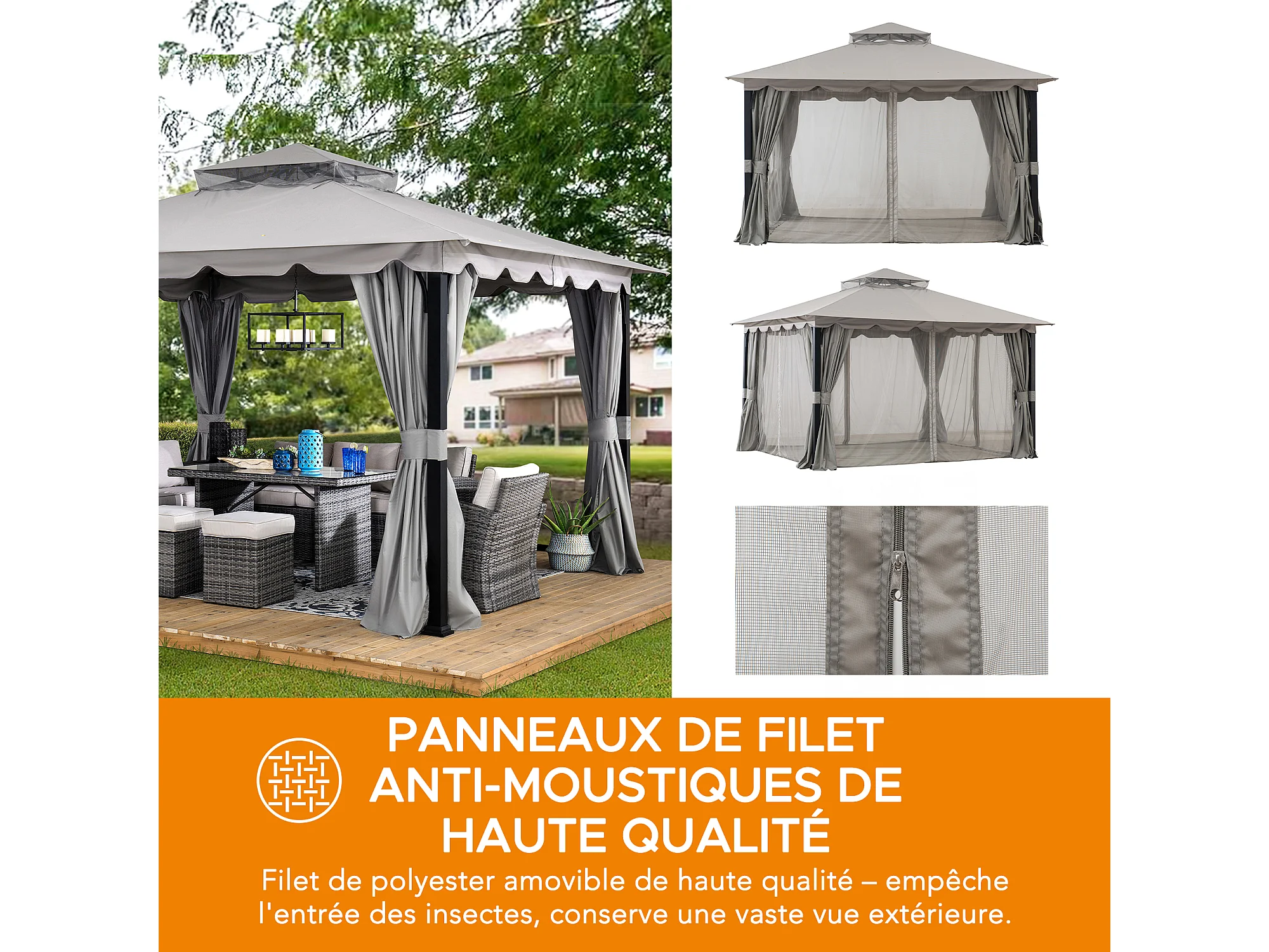 Tonnelle de jardin en acier STOJ 330cm x 396cm, toit à deux niveaux avec rideaux et moustiquaire, gris