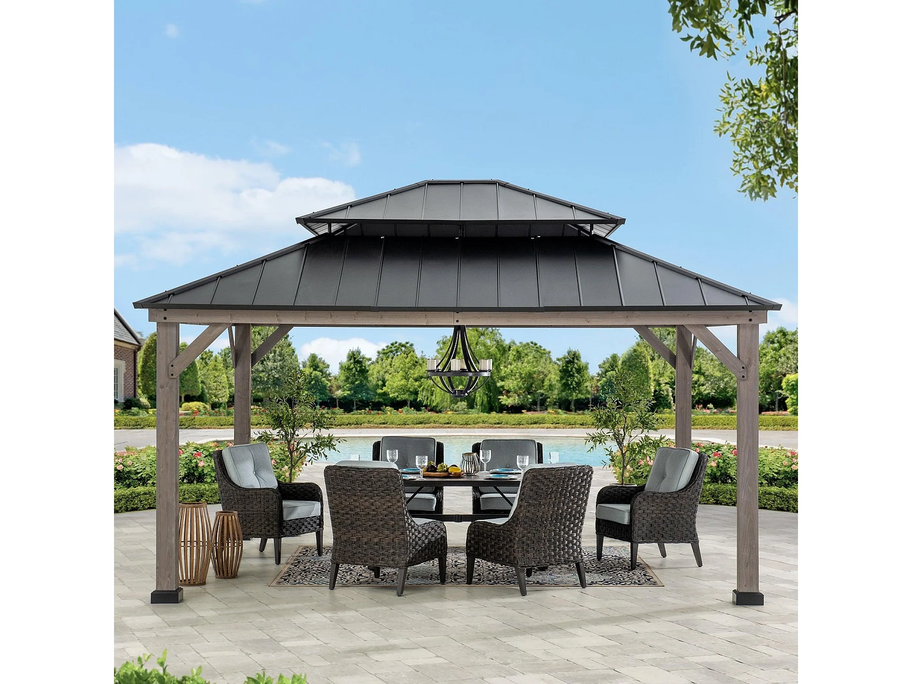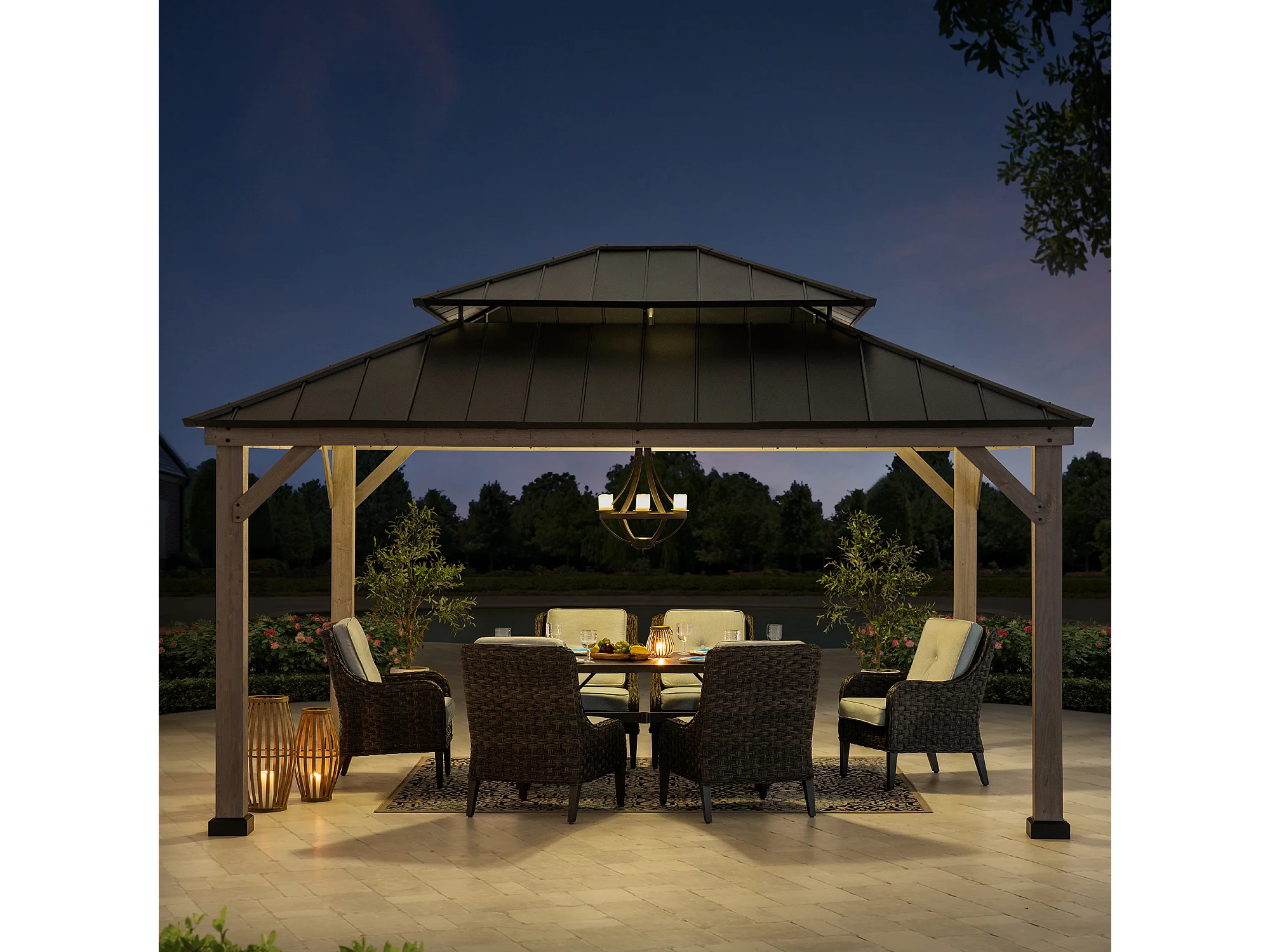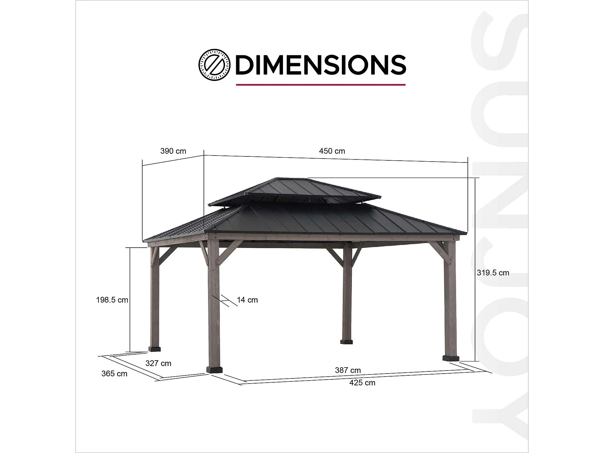 Tonnelle d'extérieur en bois avec toit métallique à 2 niveaux et crochet de plafond RYSY 390 cm x 450 cm