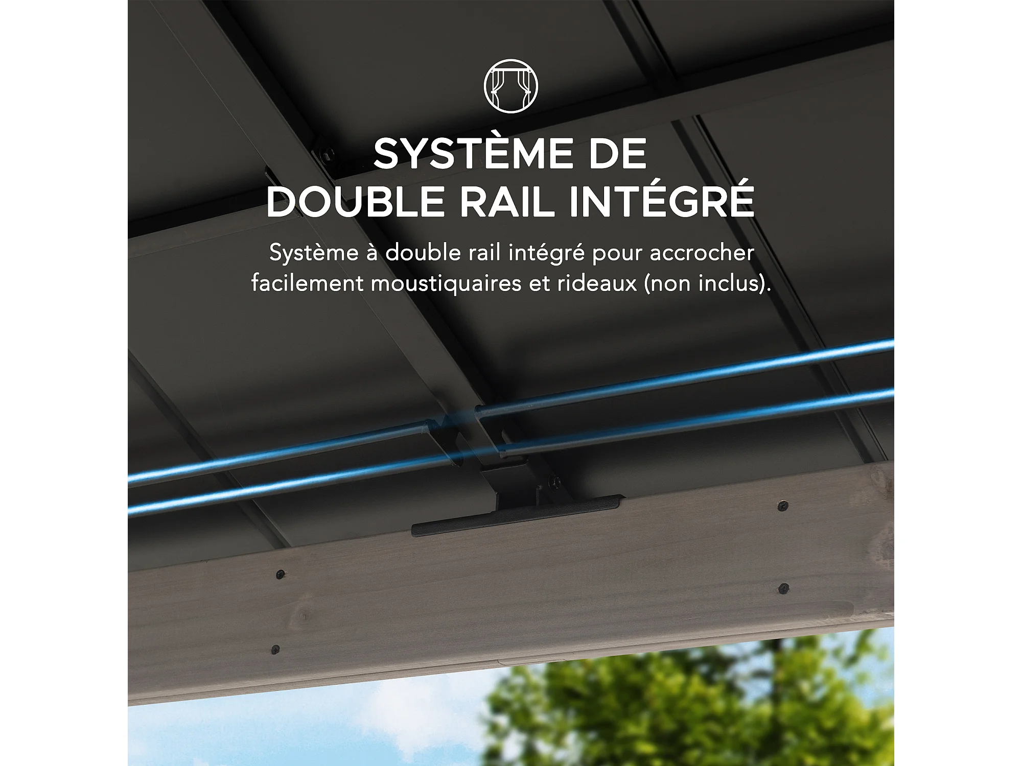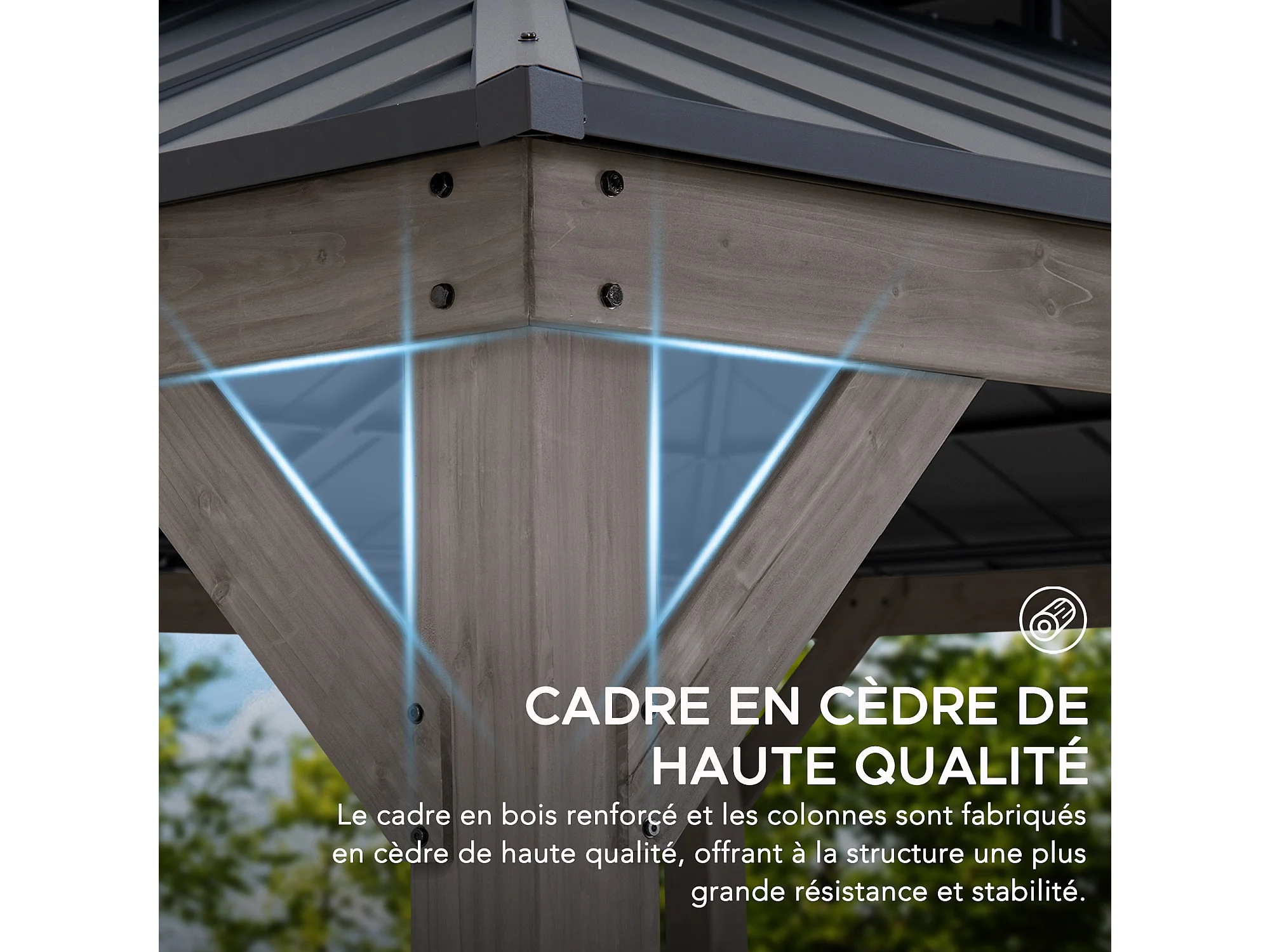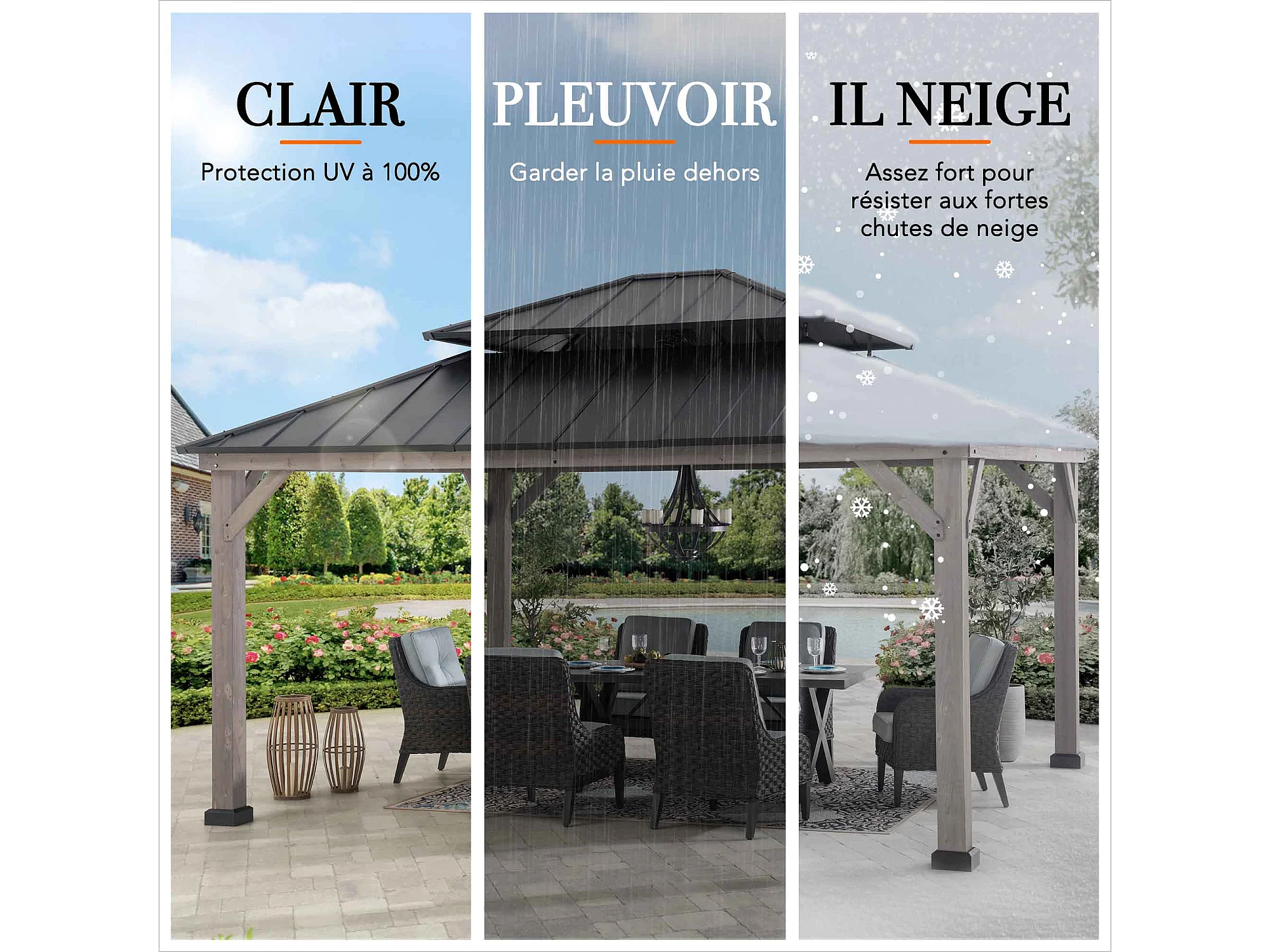 Tonnelle d'extérieur en bois avec toit métallique à 2 niveaux et crochet de plafond RYSY 390 cm x 450 cm