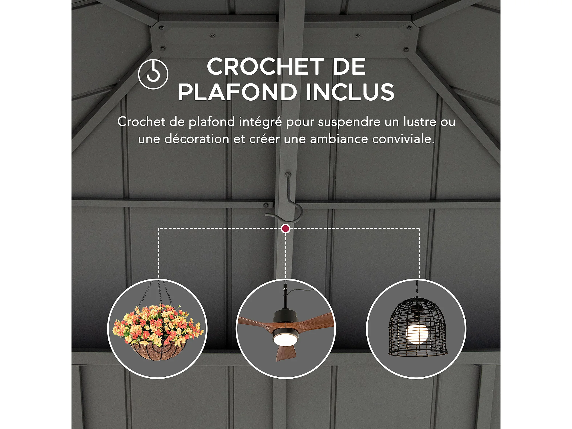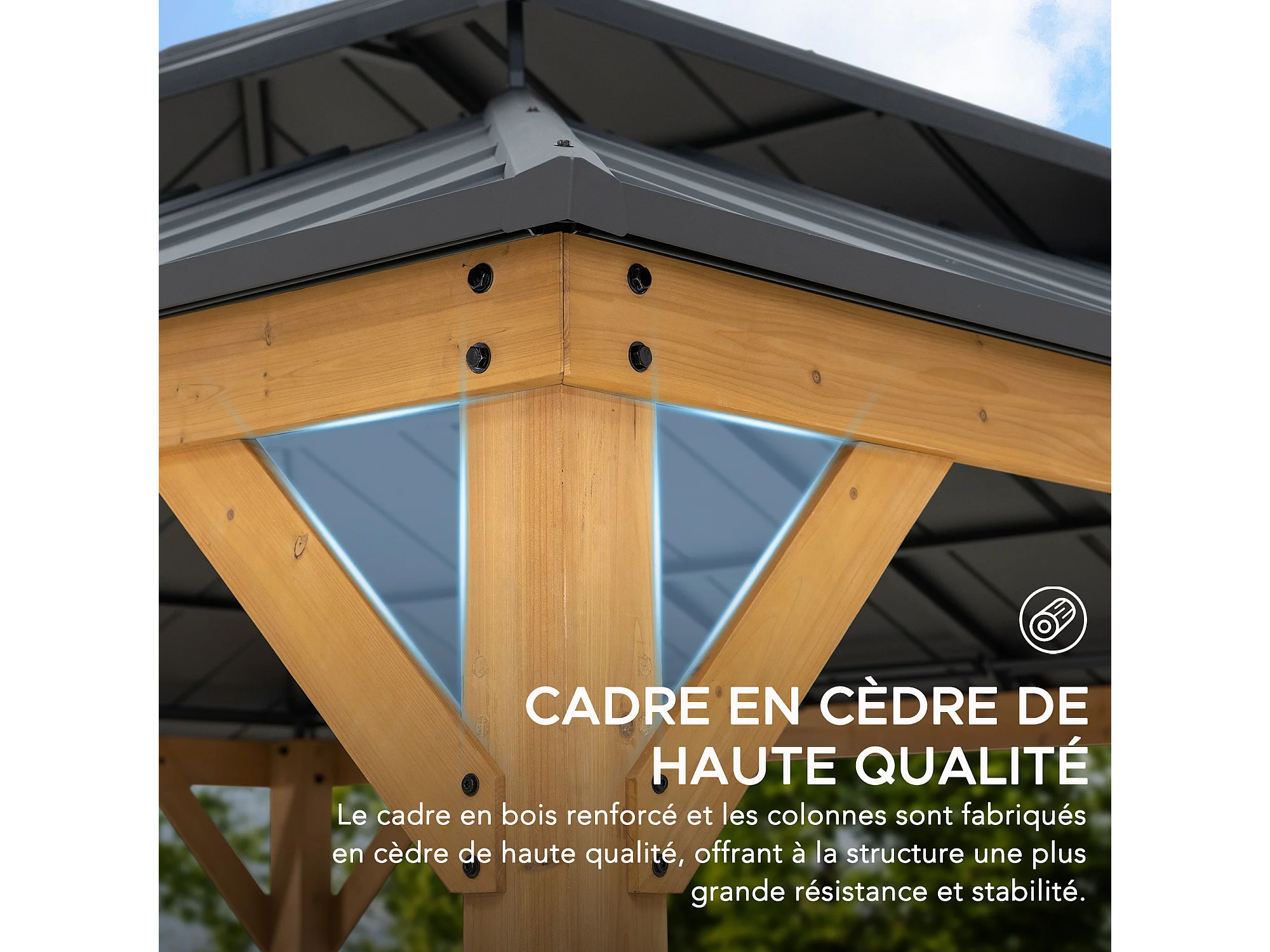 Tonnelle en bois avec toit rigide à deux niveaux en acier anthracite et avec rideau et filet Trivor 390 cm x 450 cm