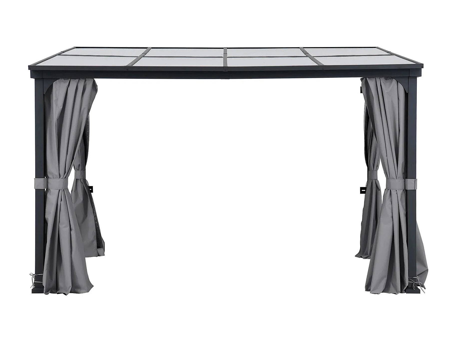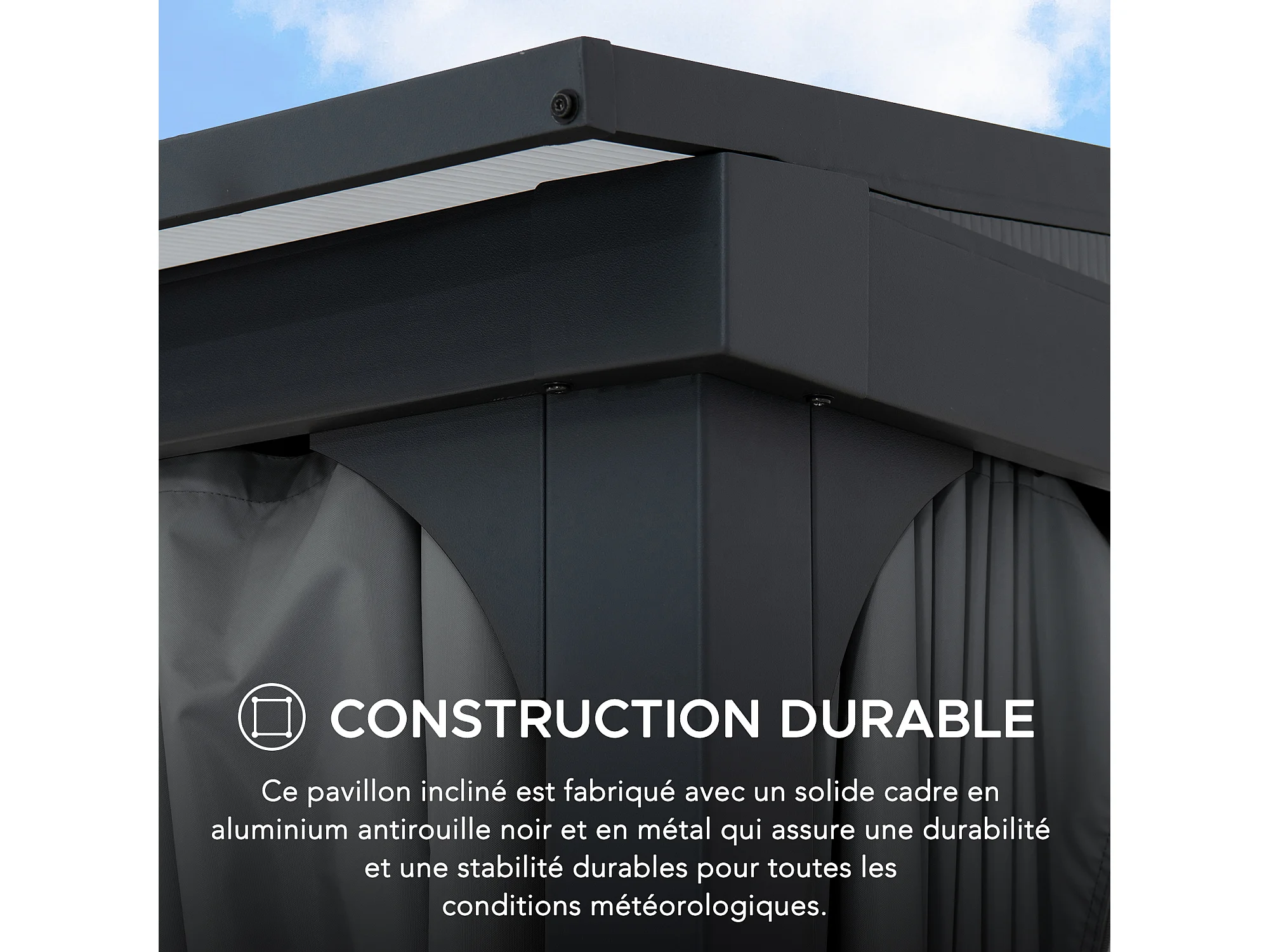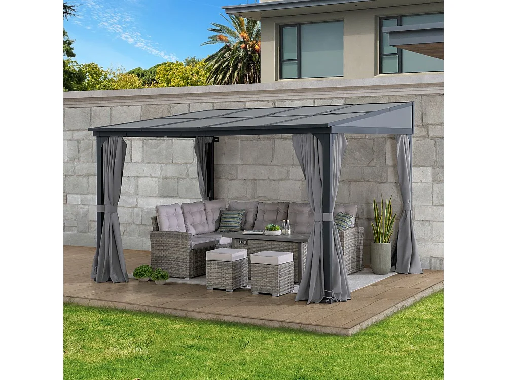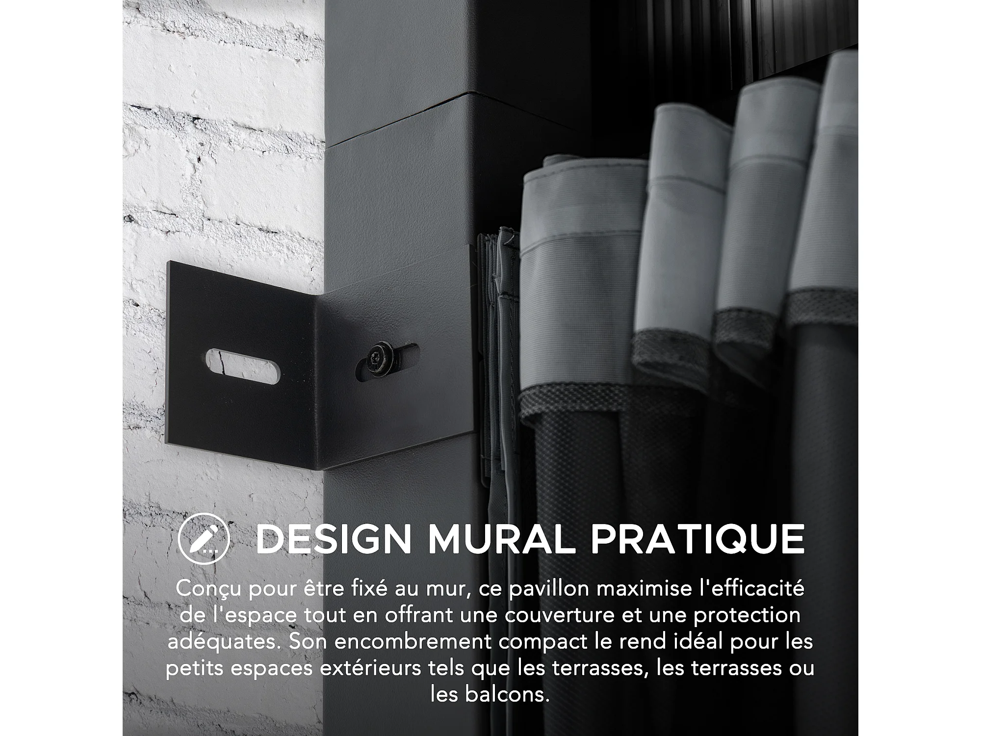 Tonnelle murale à toit métallique, tonnelle adossée avec rideau et filet MEIJE 360 cm x 300 cm