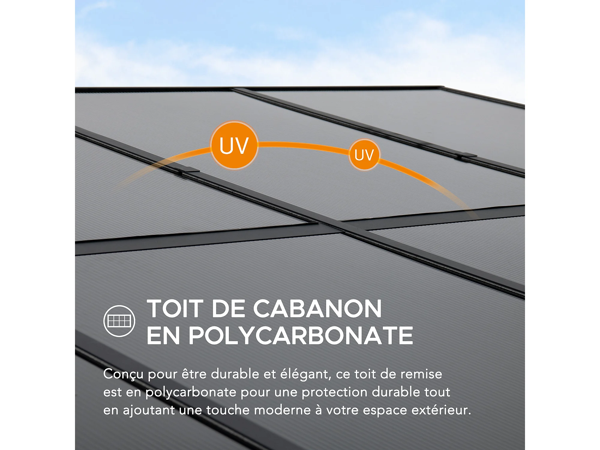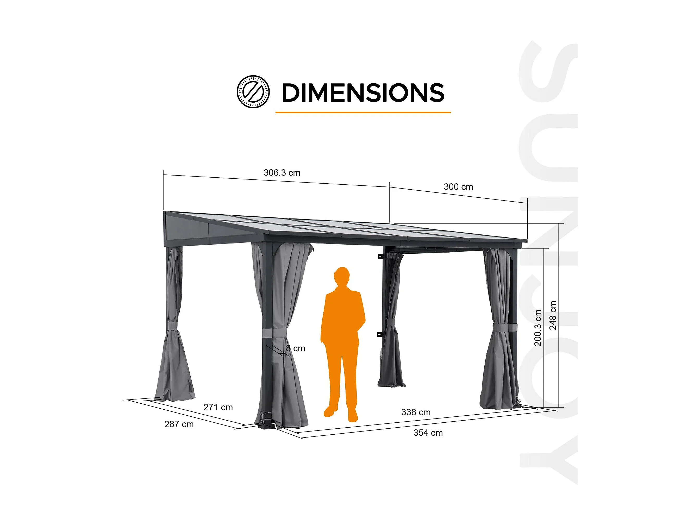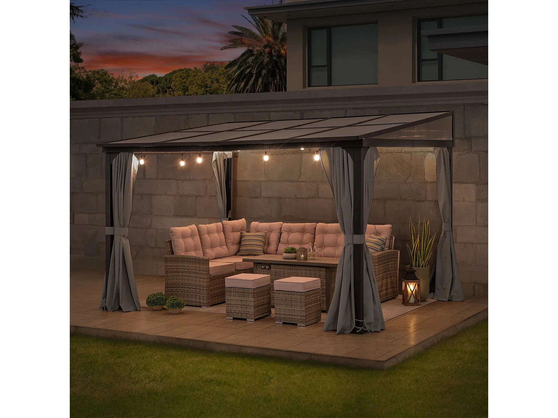 Tonnelle murale à toit métallique, tonnelle adossée avec rideau et filet MEIJE 360 cm x 300 cm