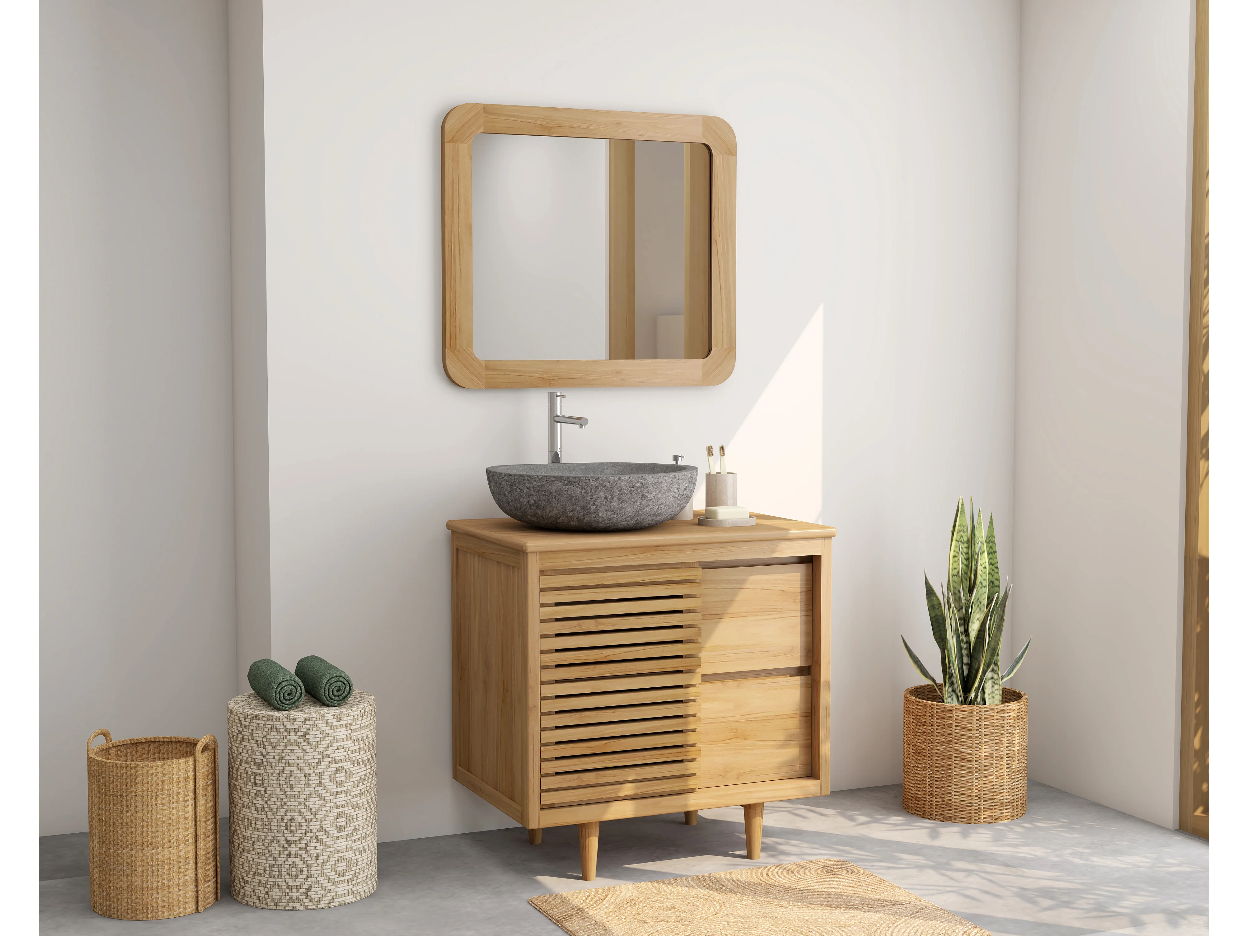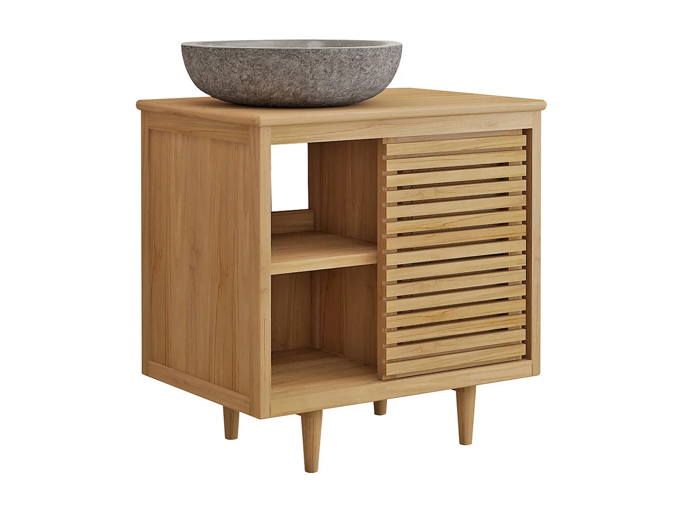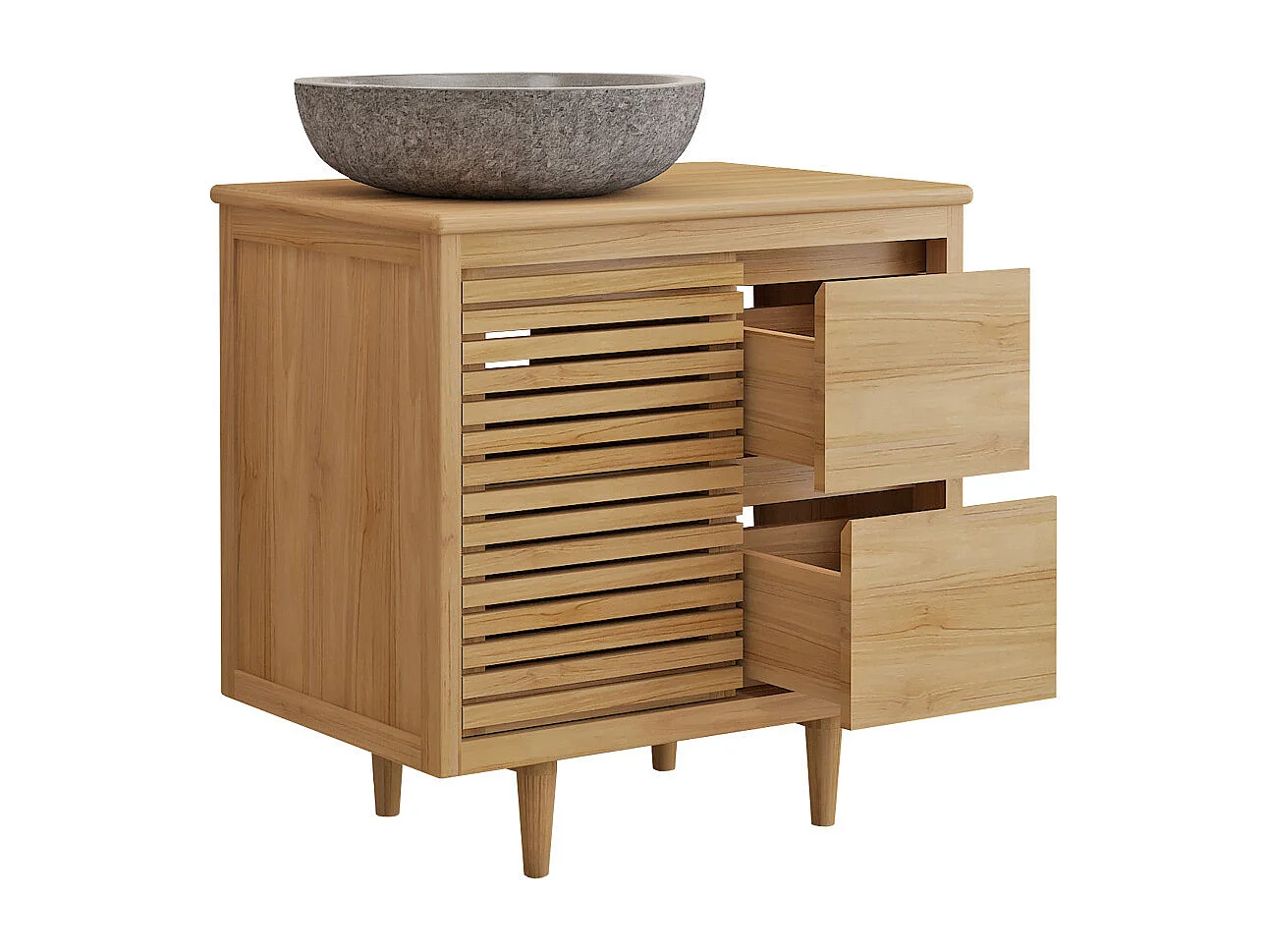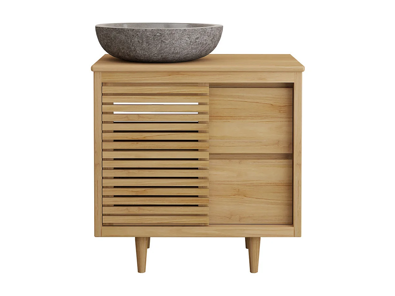 Meuble de salle de bain sur pieds en teck avec vasque à poser ronde en pierre de rivière grise – L80 cm - TORAJA