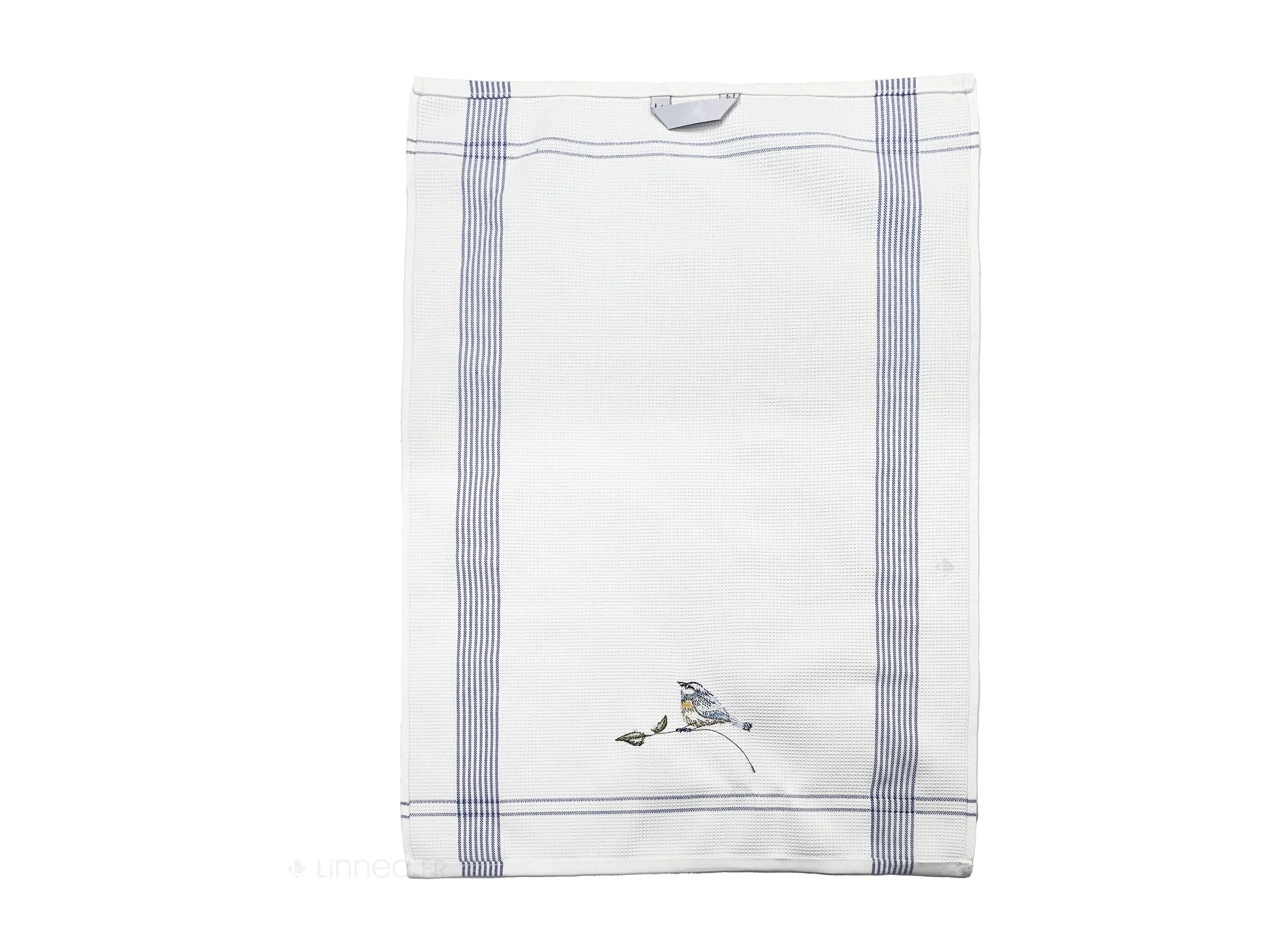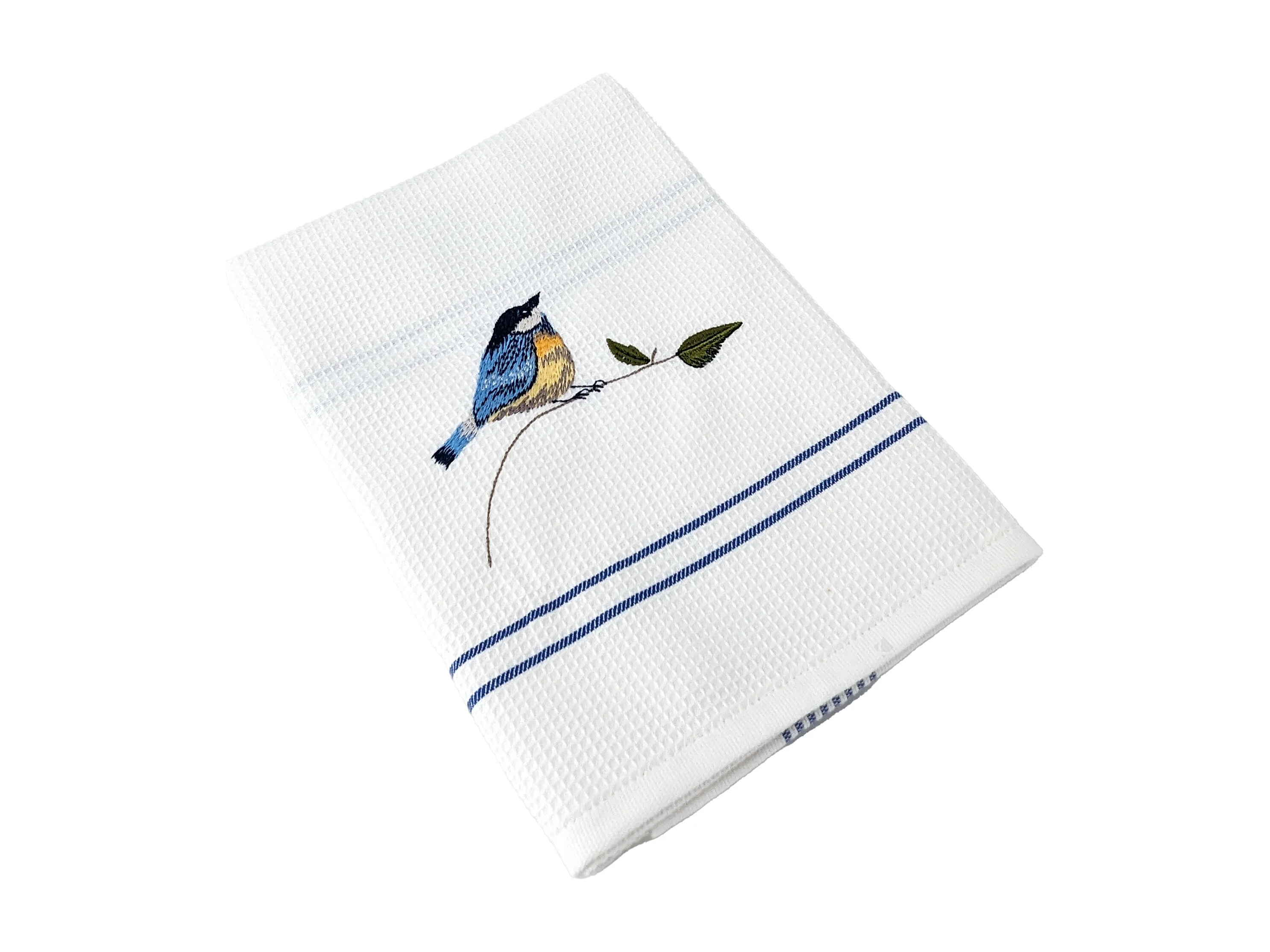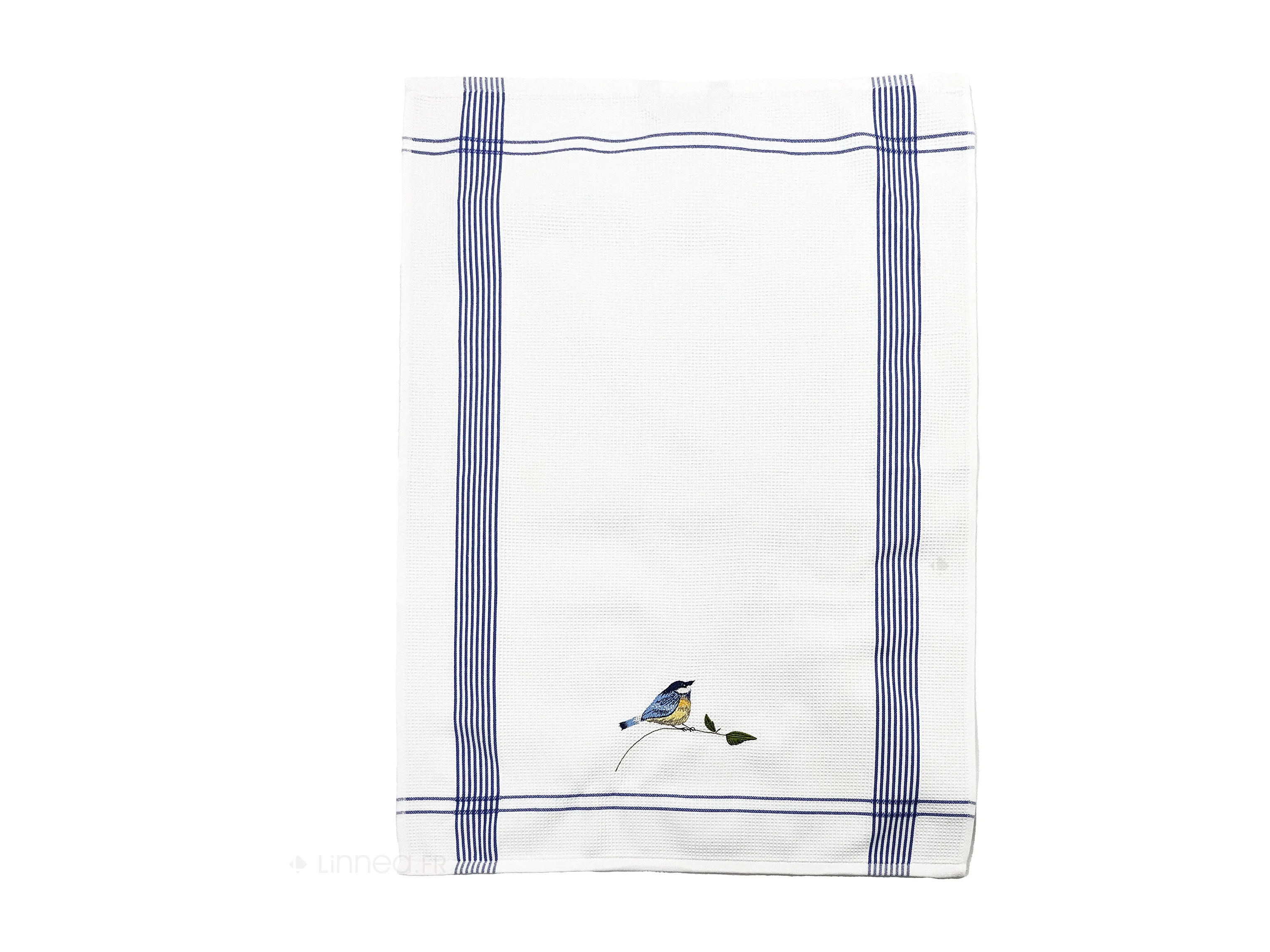 Torchon de cuisine 50x70 cm WAFFLE BRODÉ coton bleu broderie oiseaux