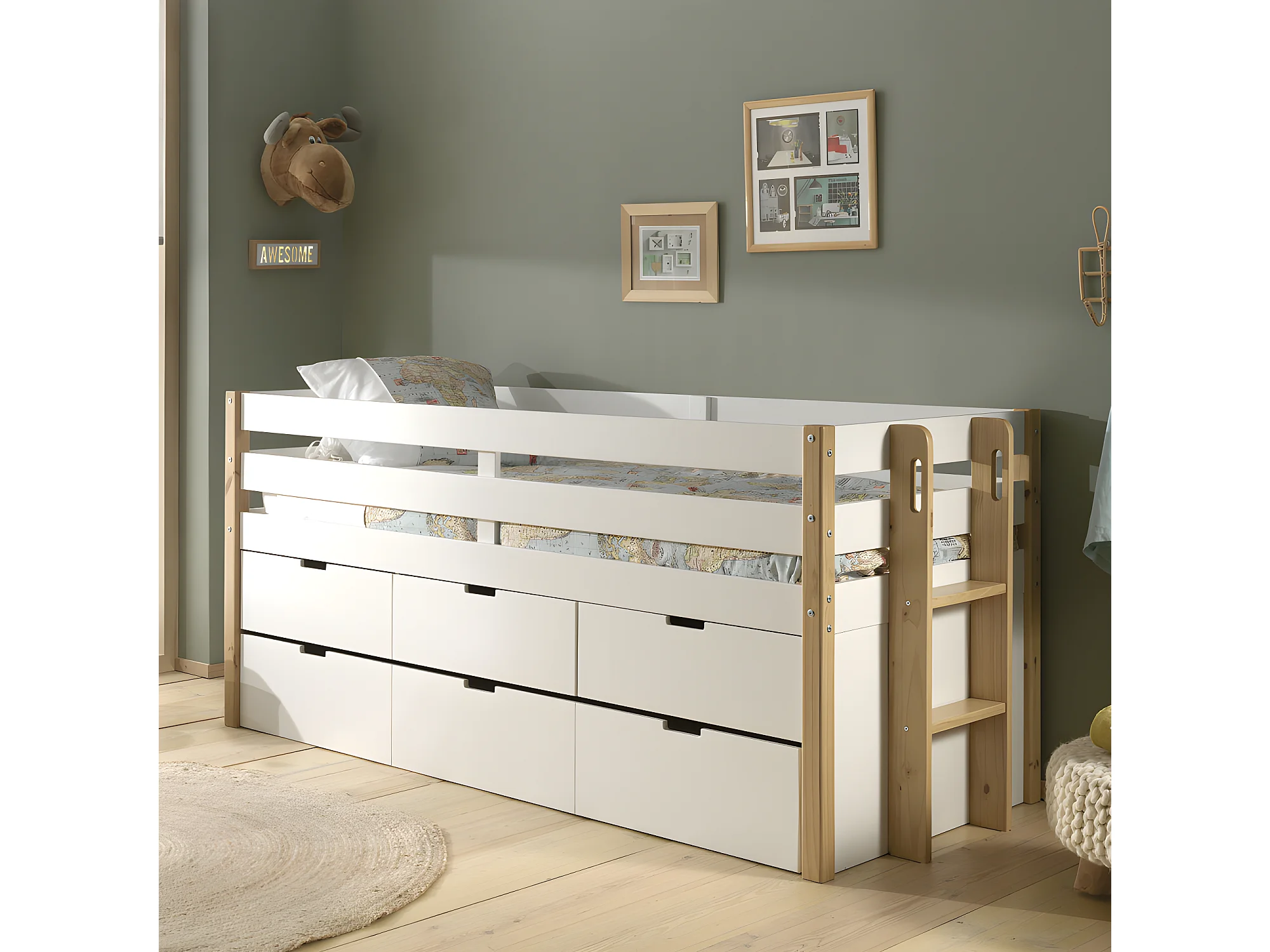 Tourco - Lit enfant banquette 4 tiroirs en bois 90x200cm - Blanc et bois clair