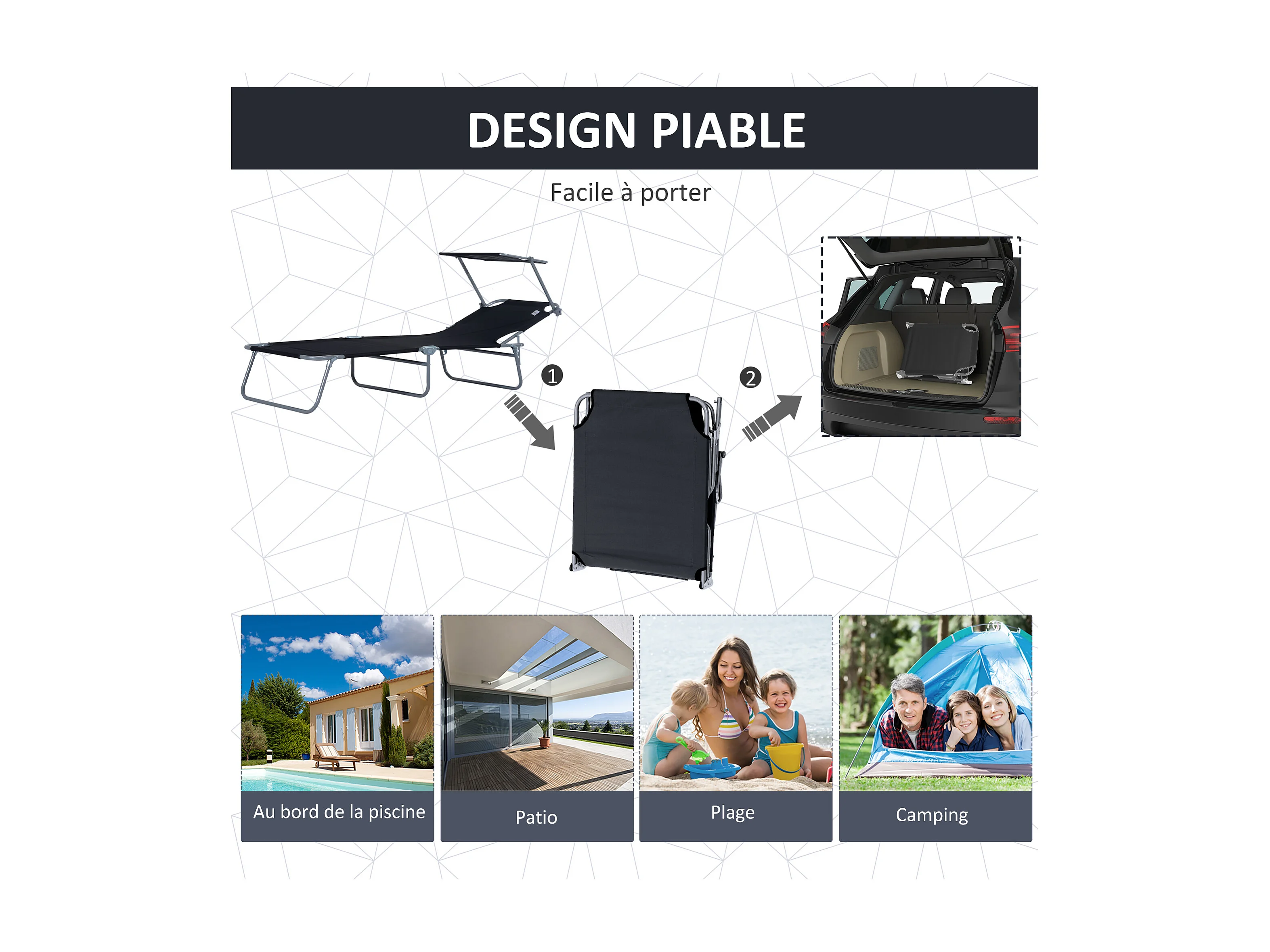Chaise longue pliable avec auvent acier et tissu noir