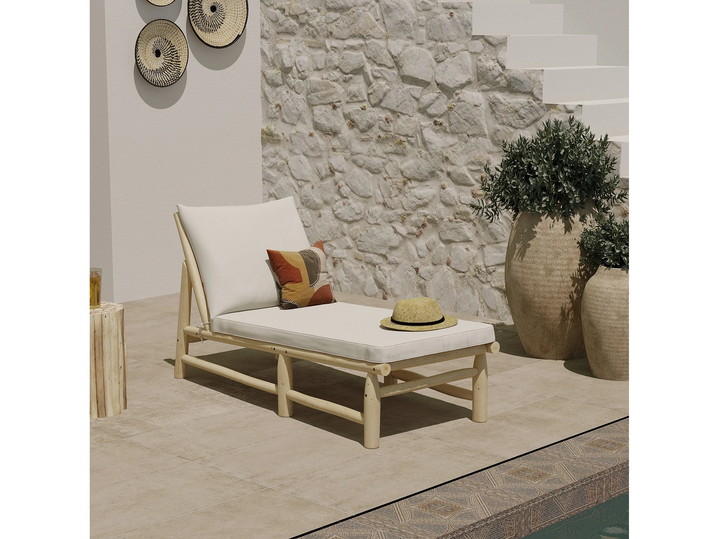Transat en branche de teck et matelas blanc cassé - Makam