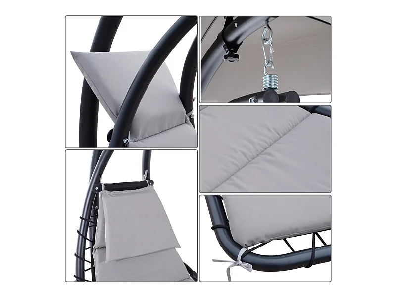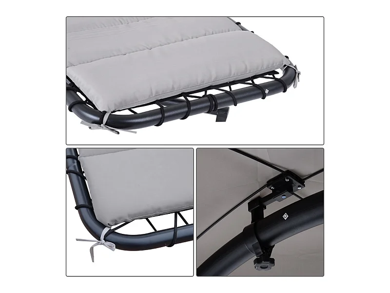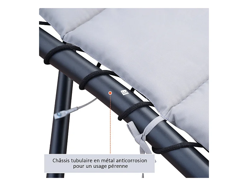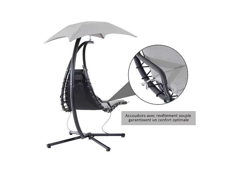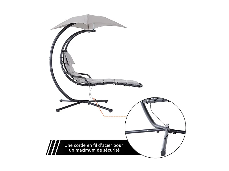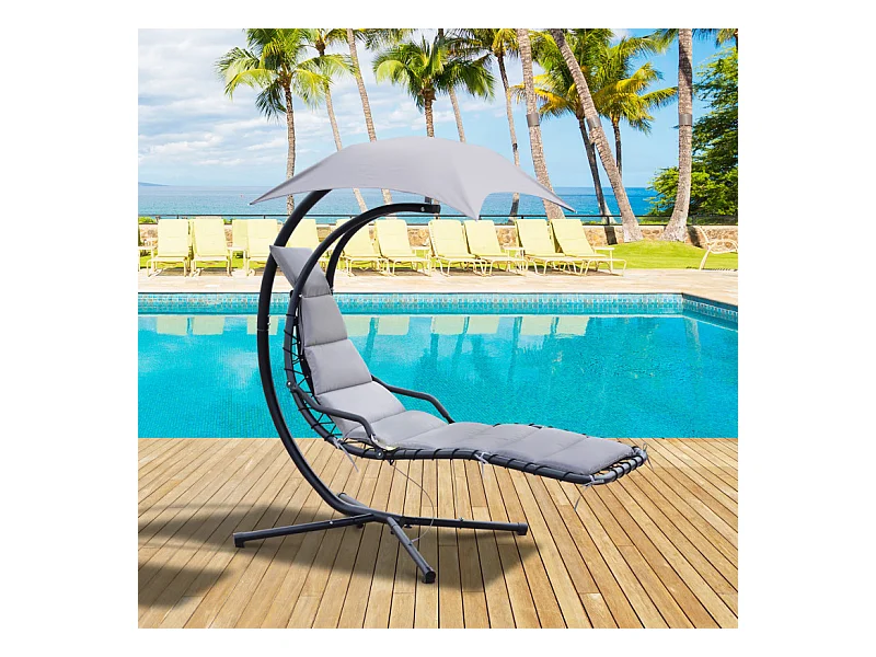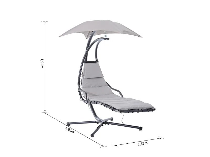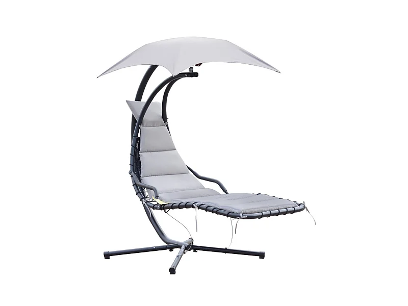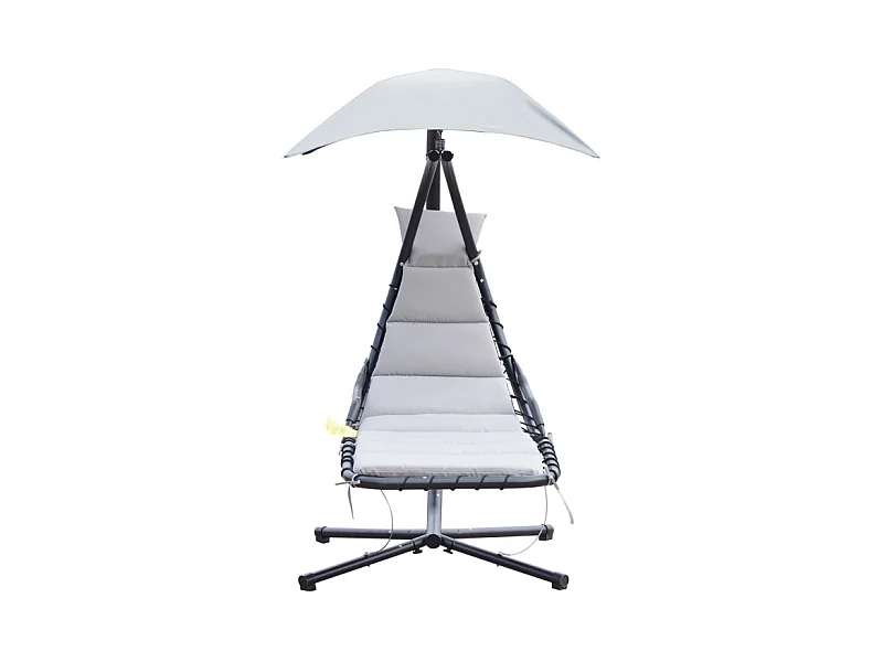 Transat d’extérieur avec matelas et pare-soleil gris.