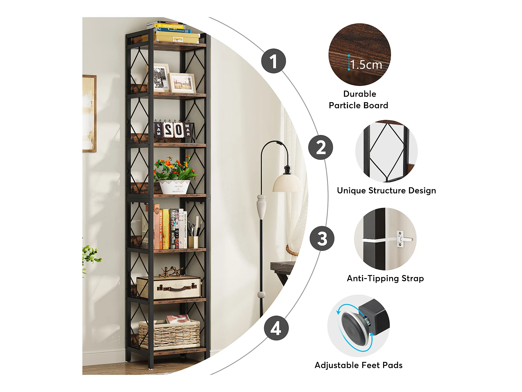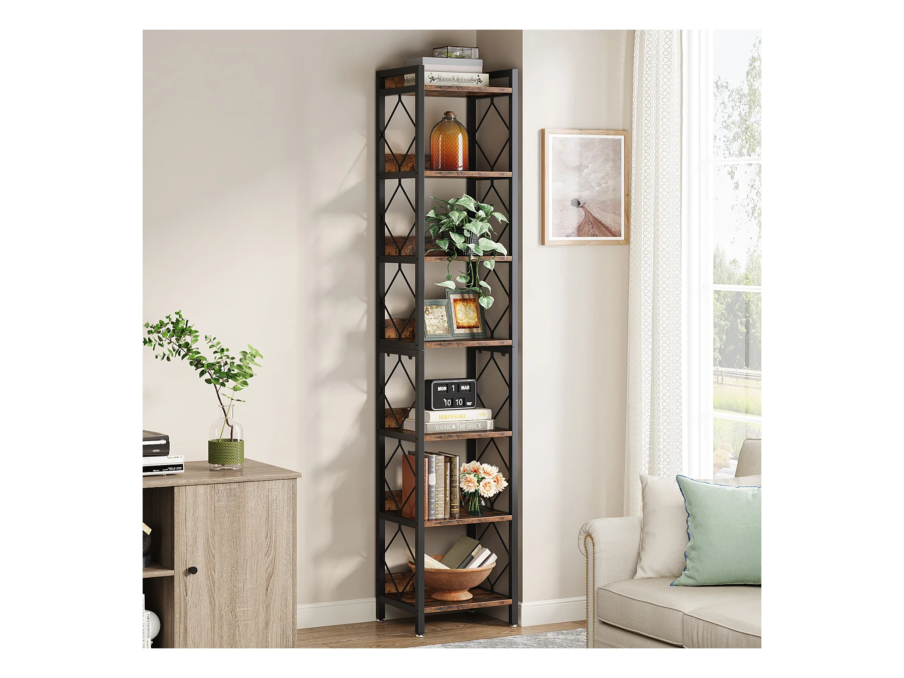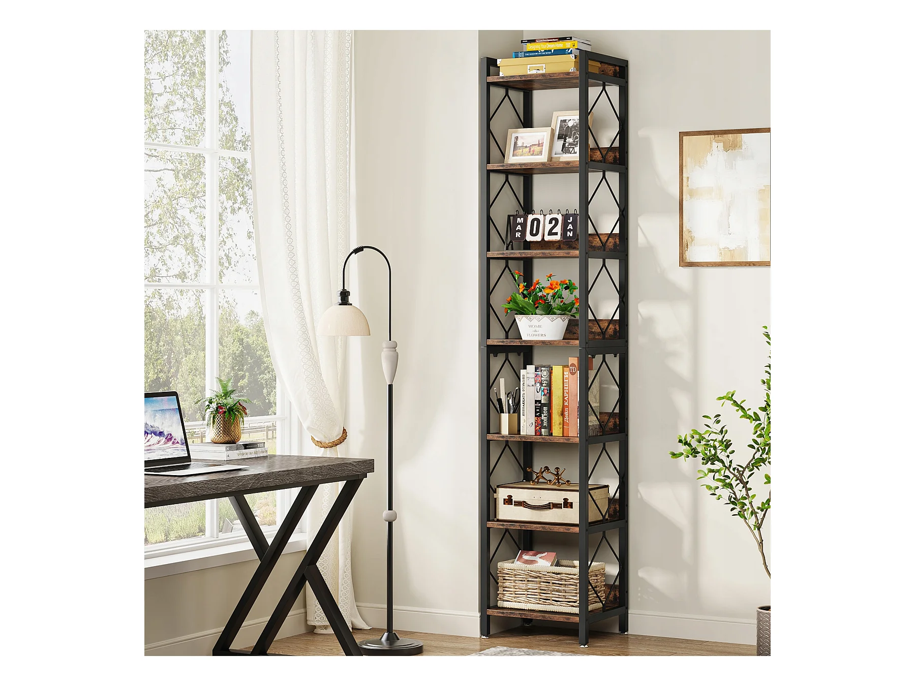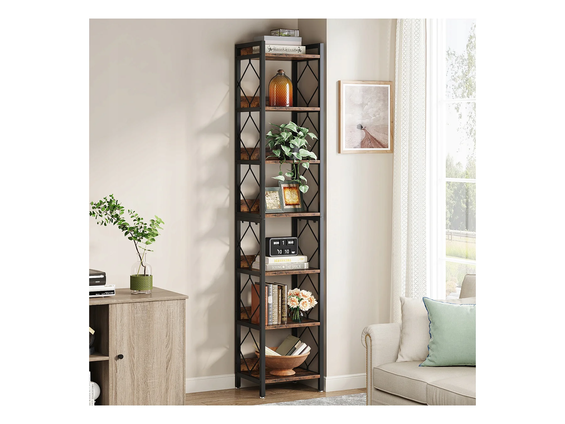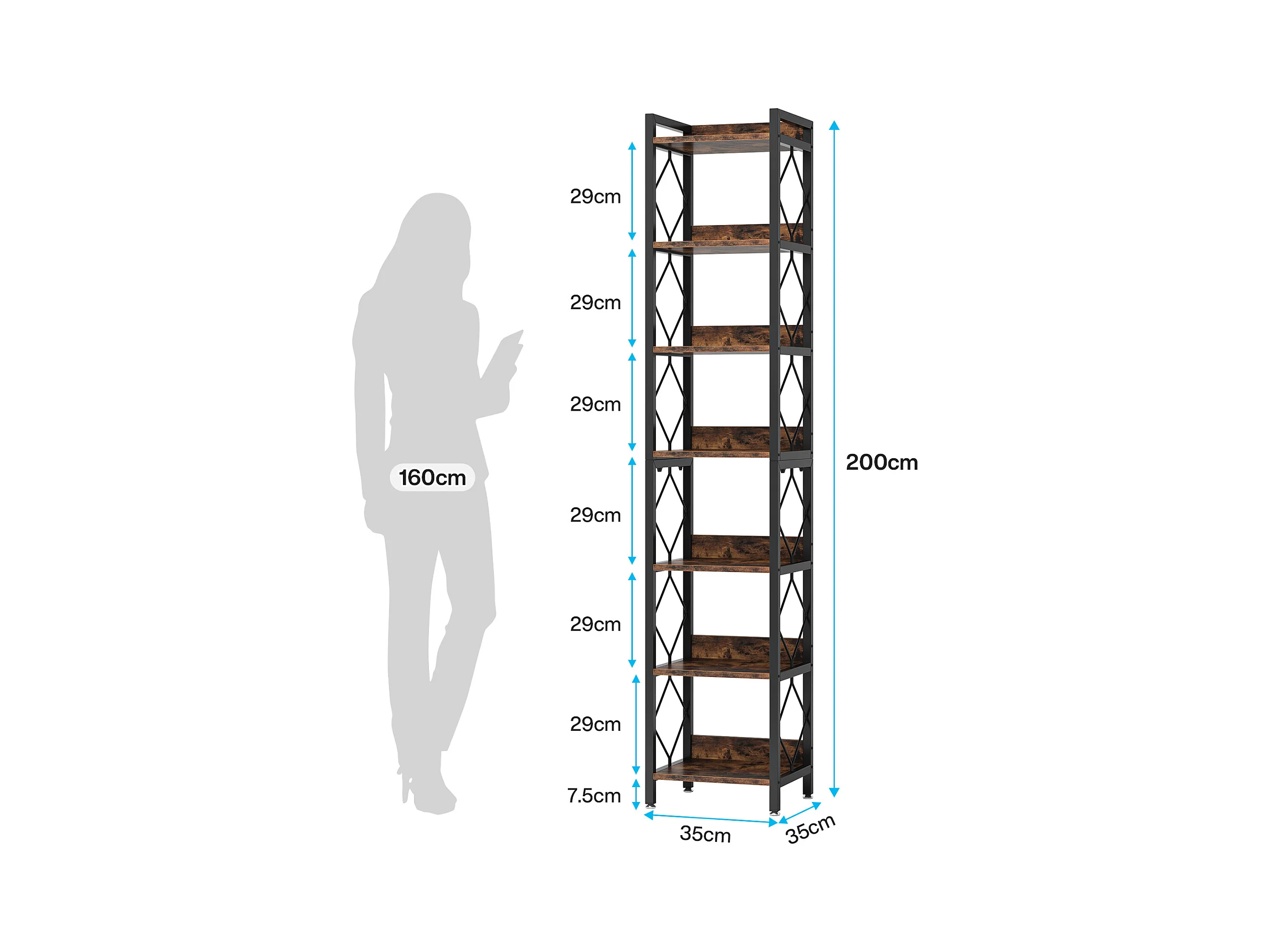 Bibliothèque étroite Extra Haute de 200 cm, bibliothèque Fine à 7 Niveaux pour Petits espaces, étagères autonomes, Marron Rustique