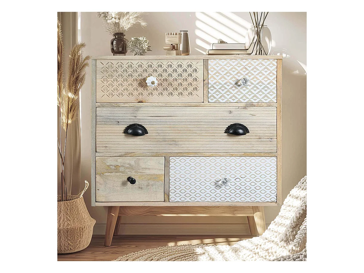 TROMSO - Commode 5 Tiroirs en Manguier Massif Clair