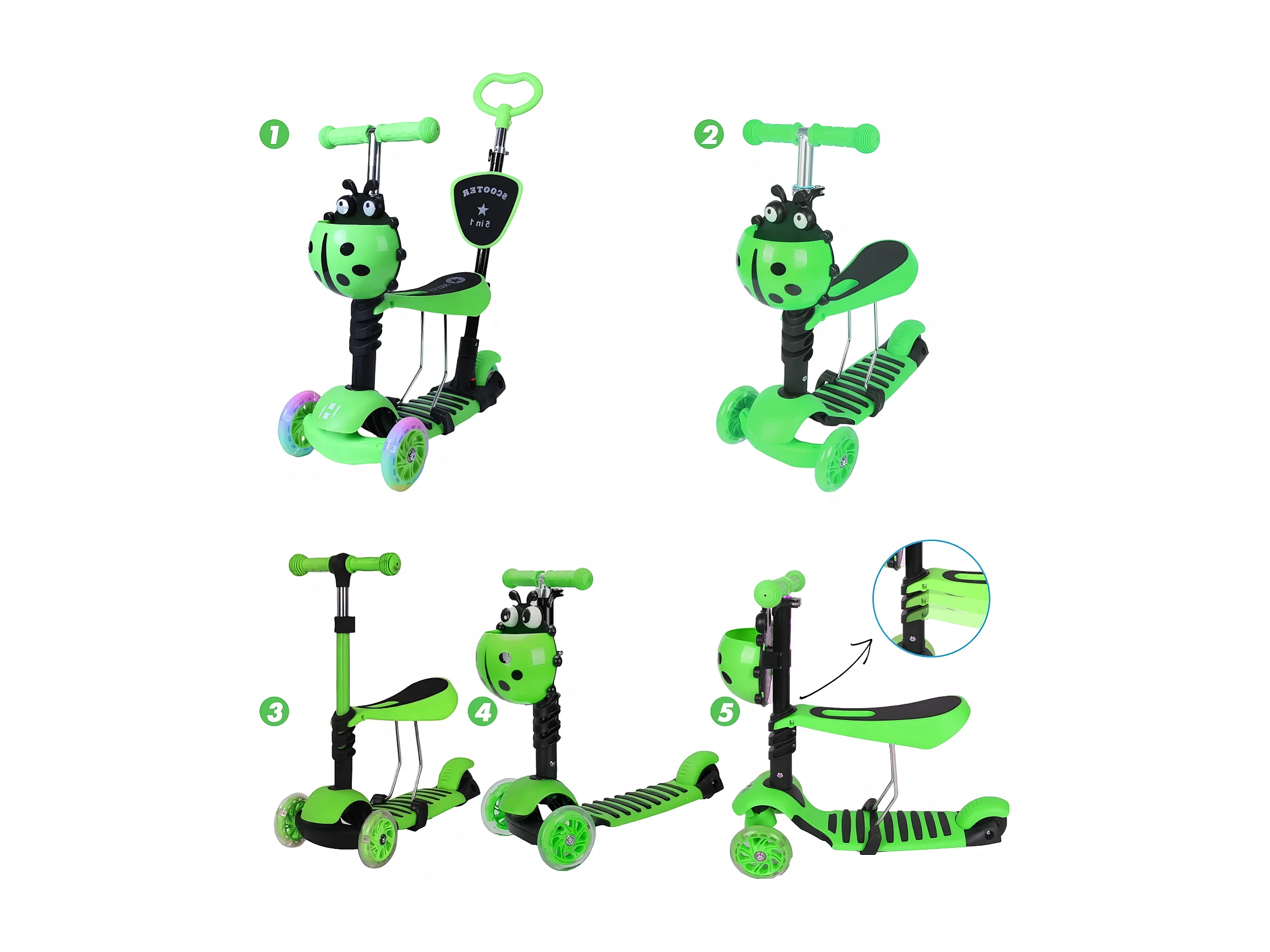 Trottinette enfant 5 en 1, 3 roues lumineuses LED, avec panier dessin animé amovible, réglable en hauteur, pour enfants de 2 à 8 ans