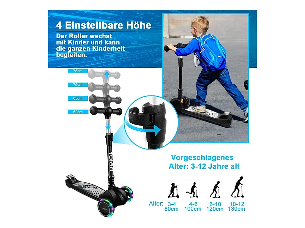 Trottinette Enfant YOLEO avec 4 Hauteurs Réglables, Roues Lumineuses LED, pour 3-12 Ans