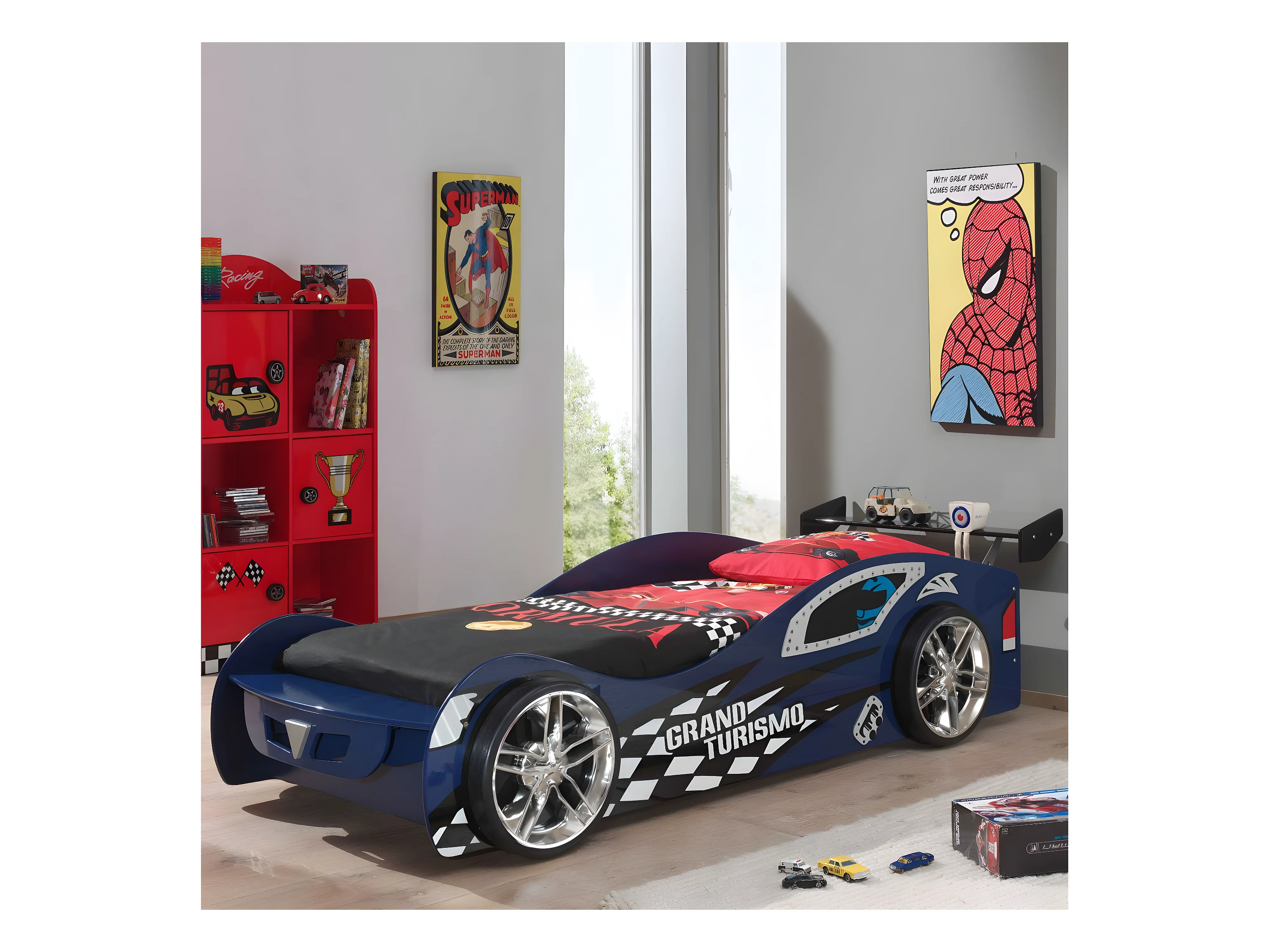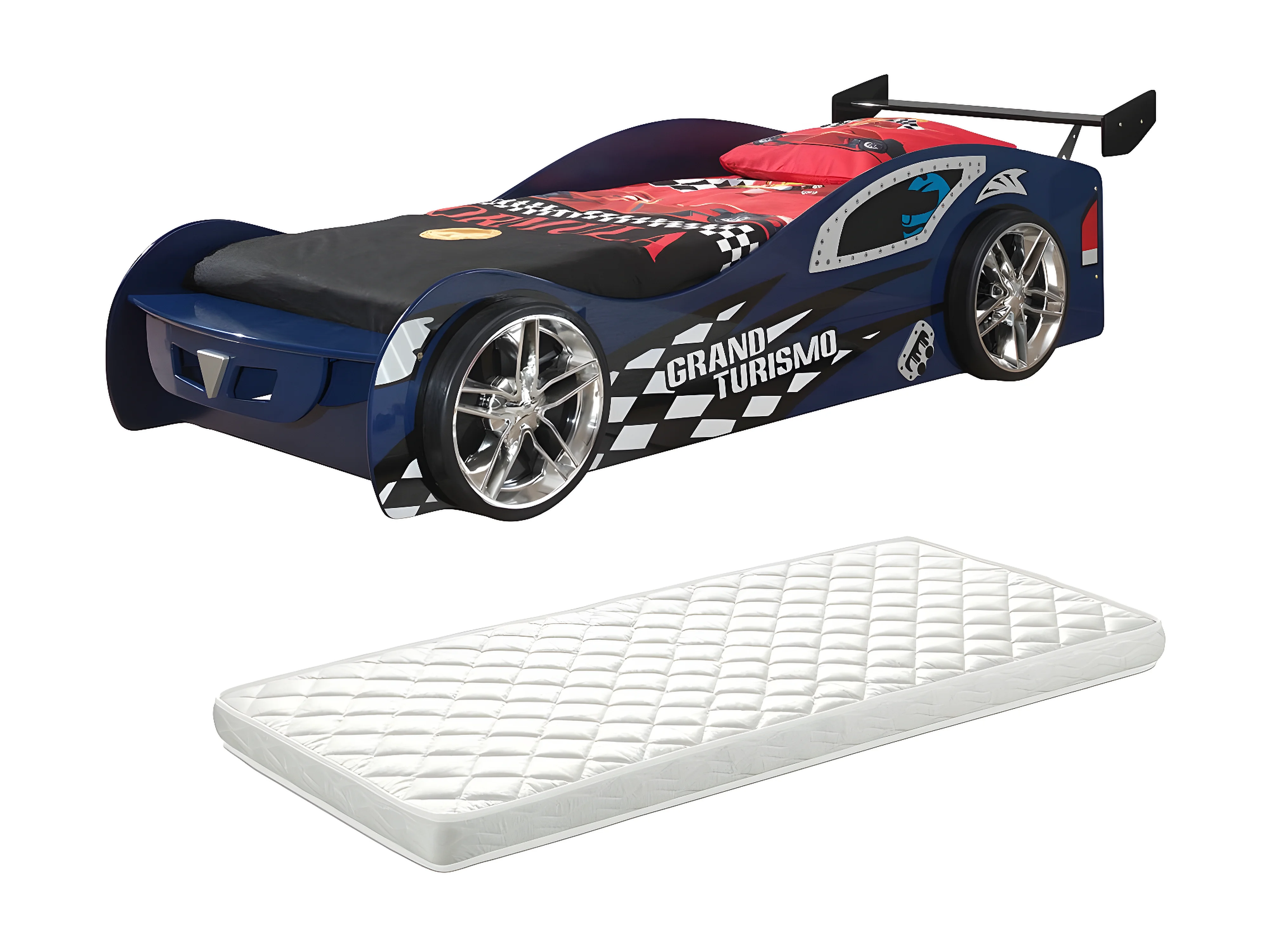 TURBO - Lit Voiture 90x200cm Bleu Style Racing avec Matelas