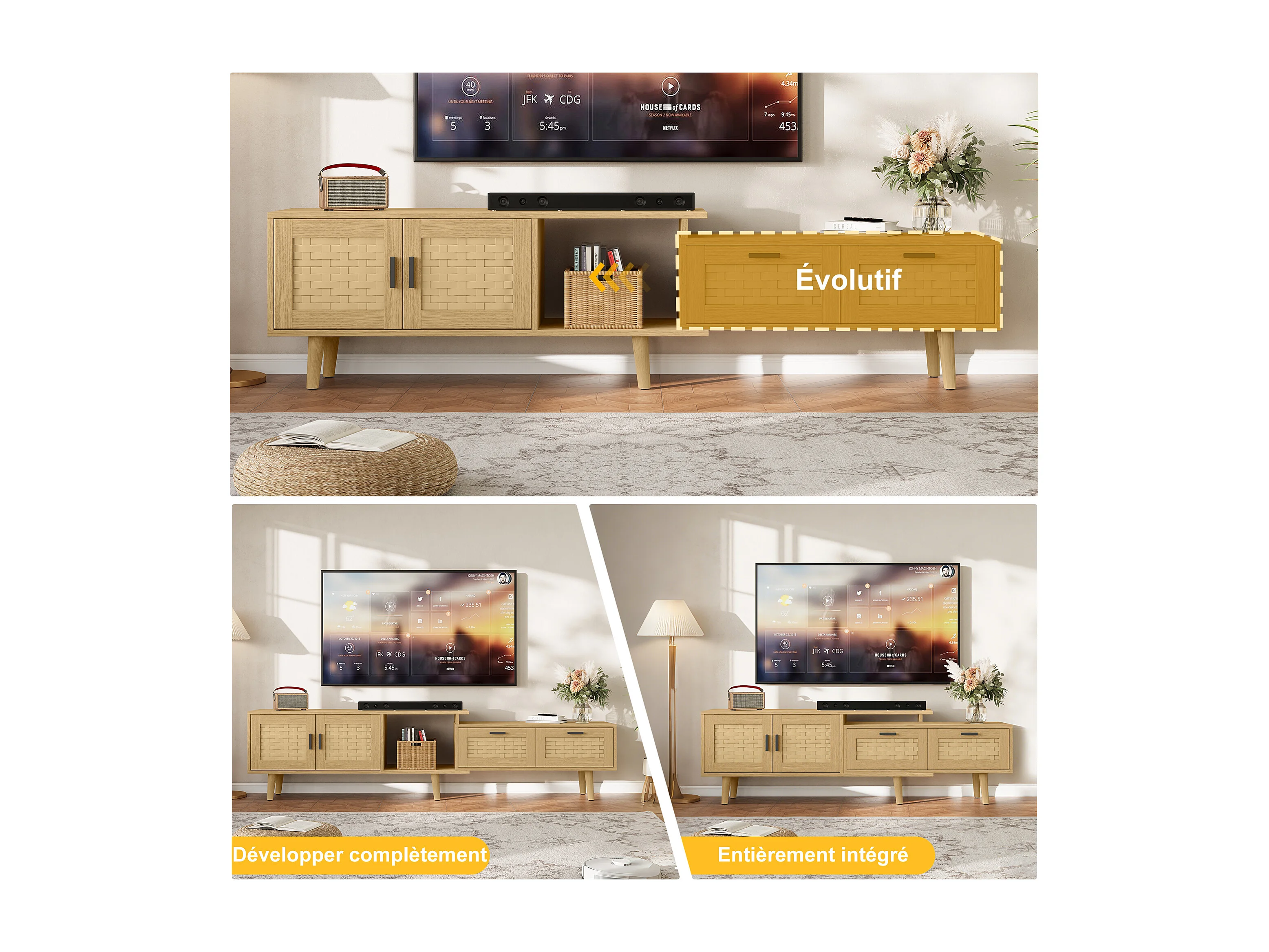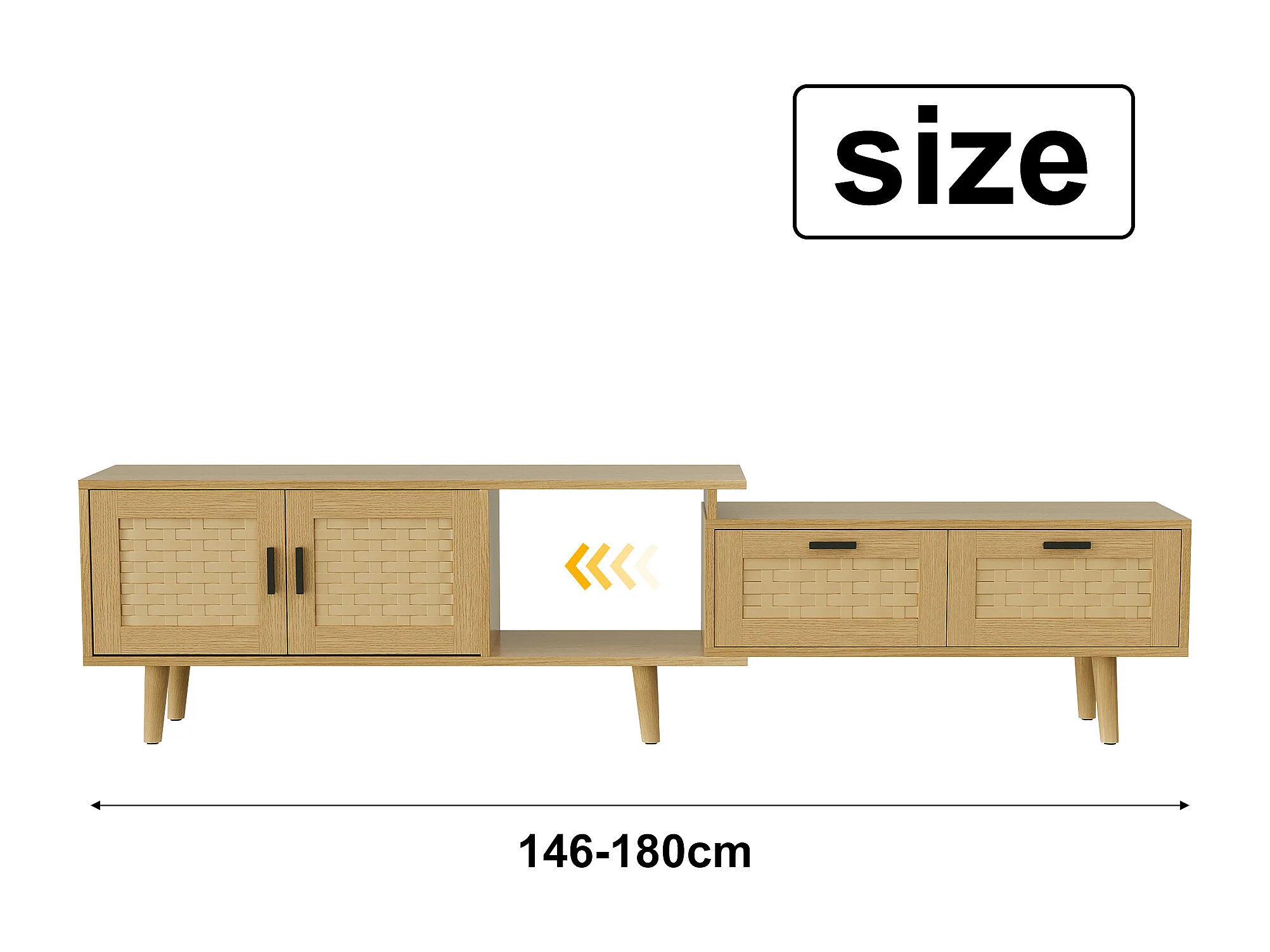 TV rétractable Stand-chêne couleur PVC Rattan TV Cabinet avec portes et tiroirs-console de stockage extensible pour le salon