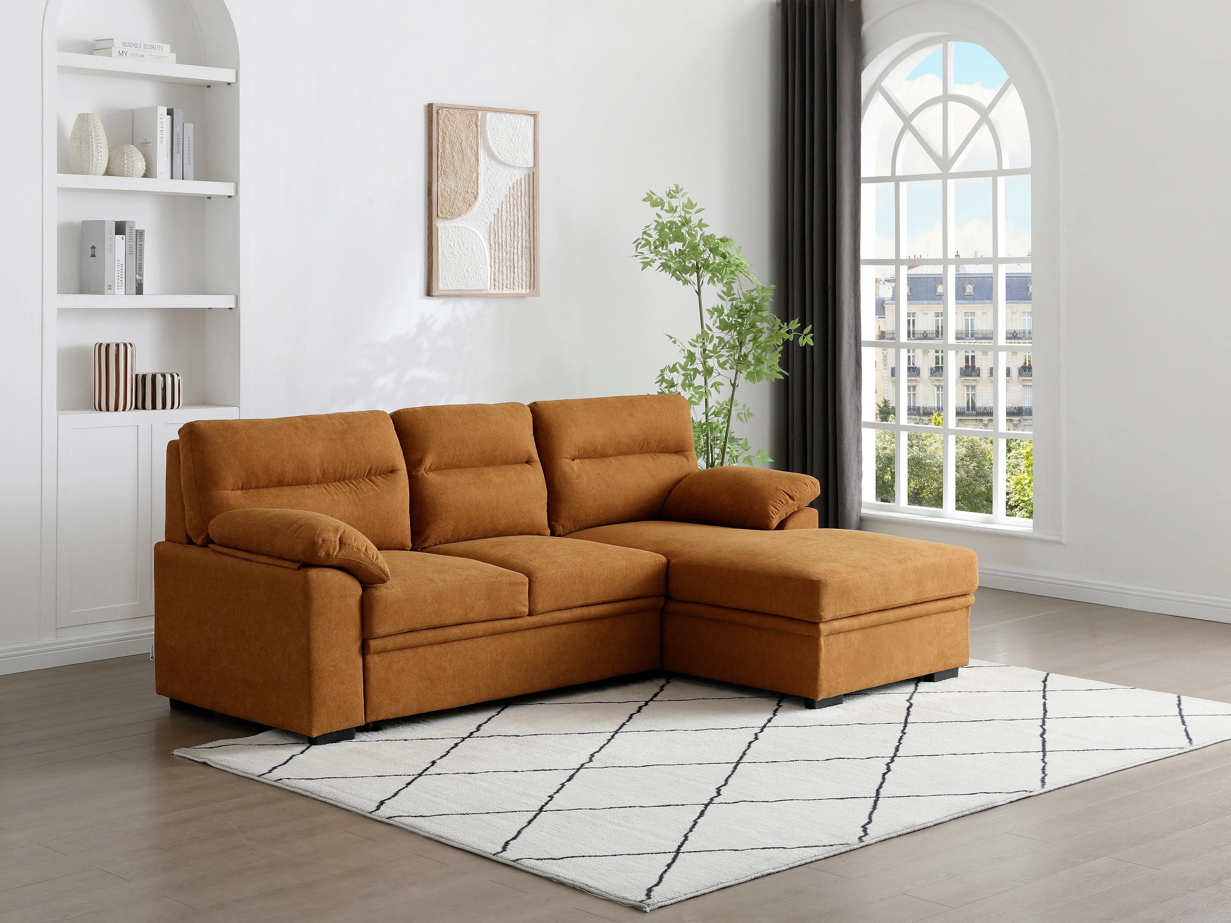 Canapé d'angle droit convertible en tissu terracotta avec tablette ULENIO