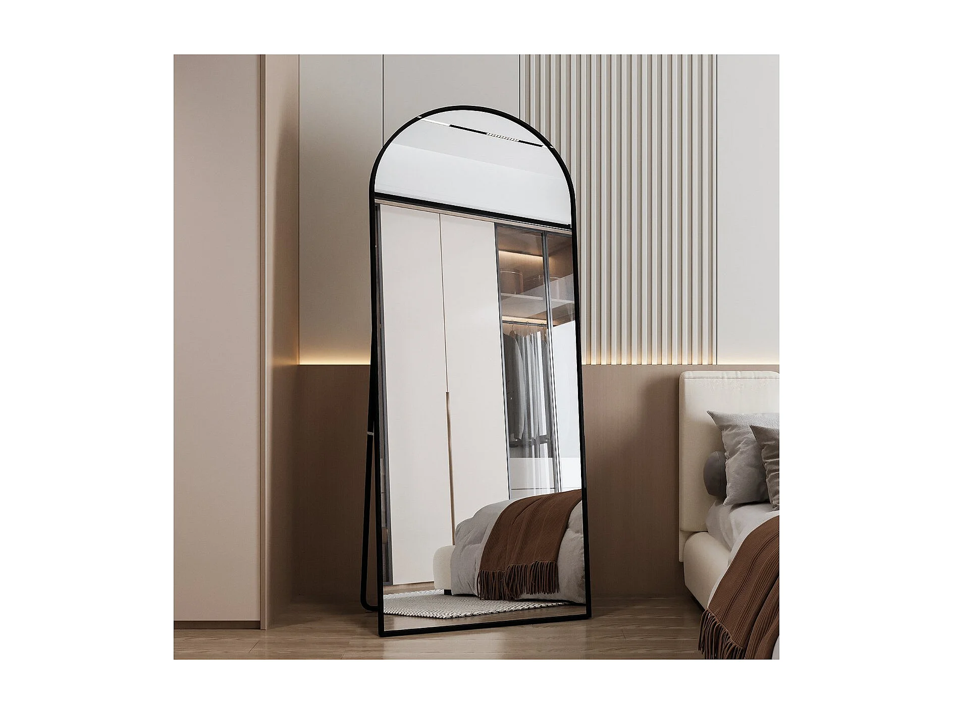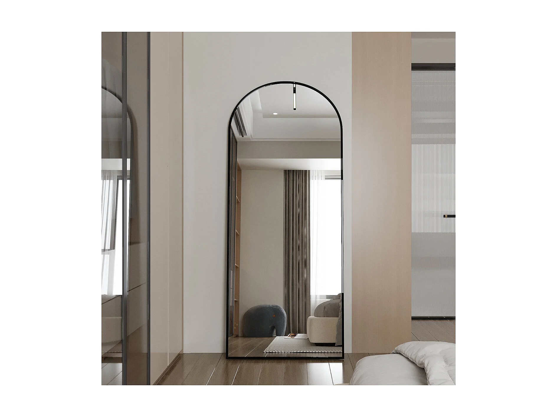 Un miroir arqué sur pied avec un cadre doré convient à une chambre de style moderne et minimaliste.