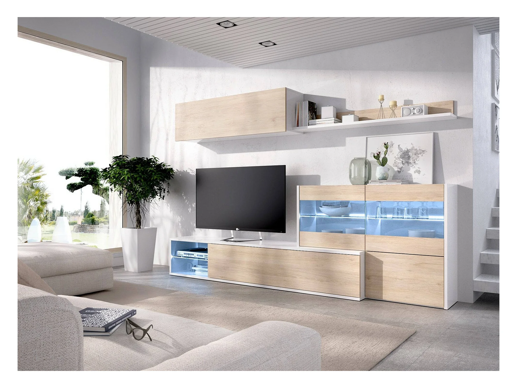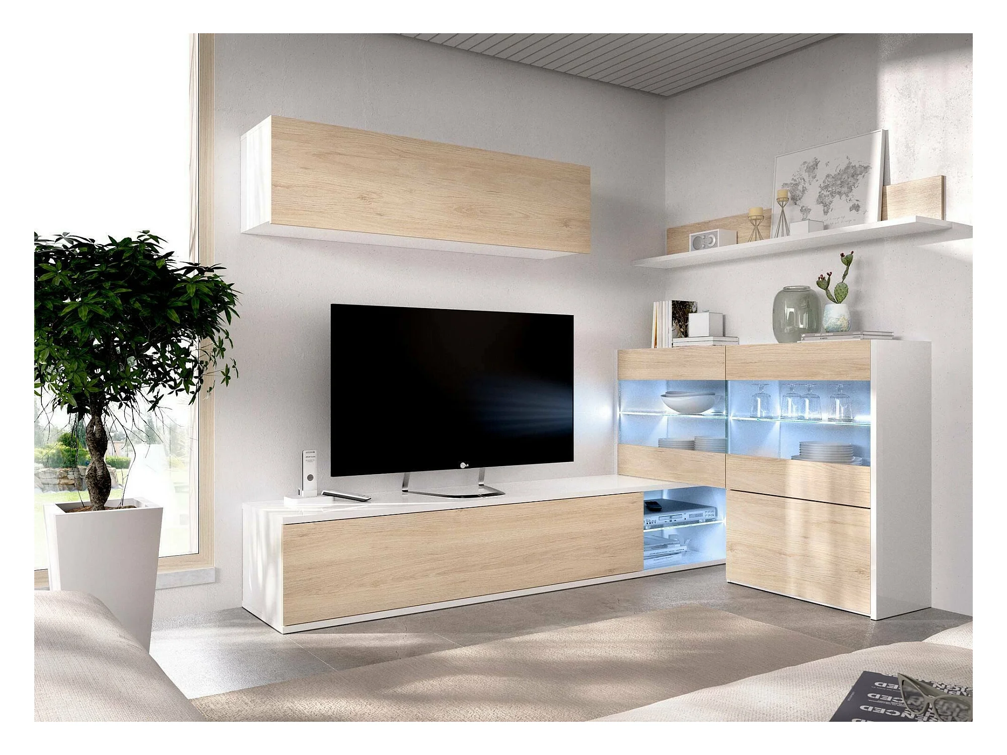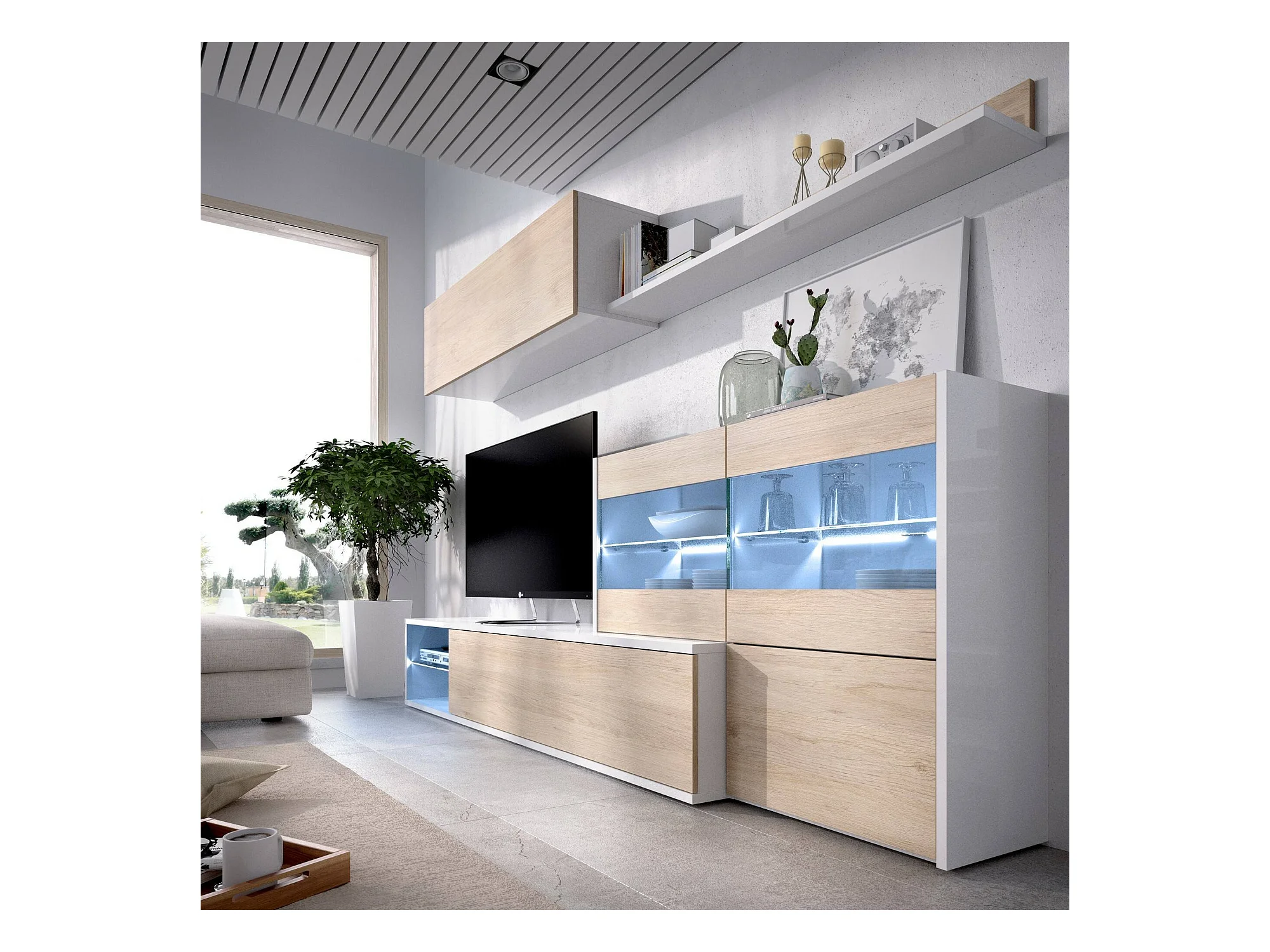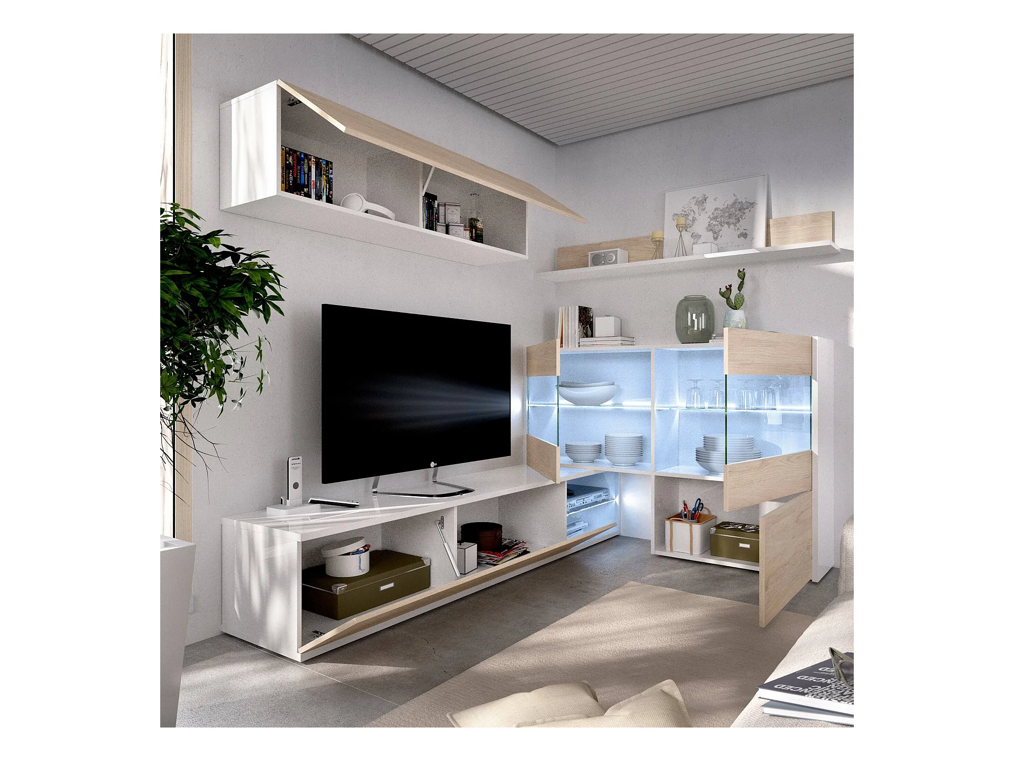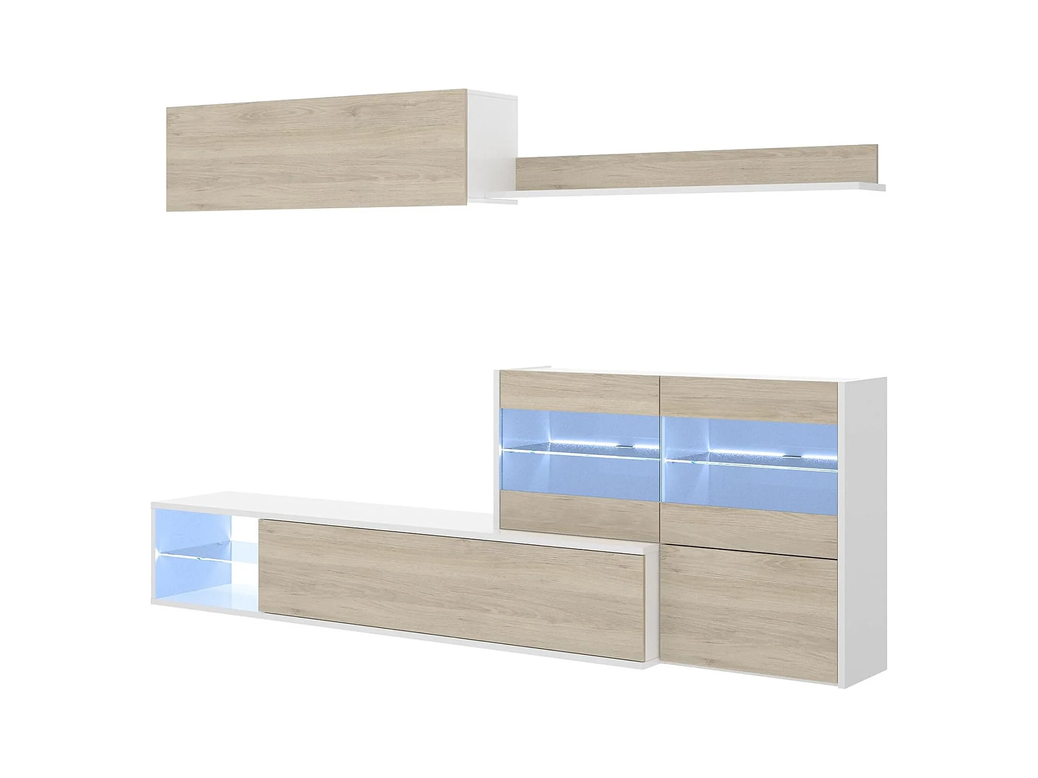 Système mural Adams, Ensemble de salon d'angle modulable, Meuble de salon multi-positions avec lumière LED, 260x41h180 cm, Chêne et Blanc