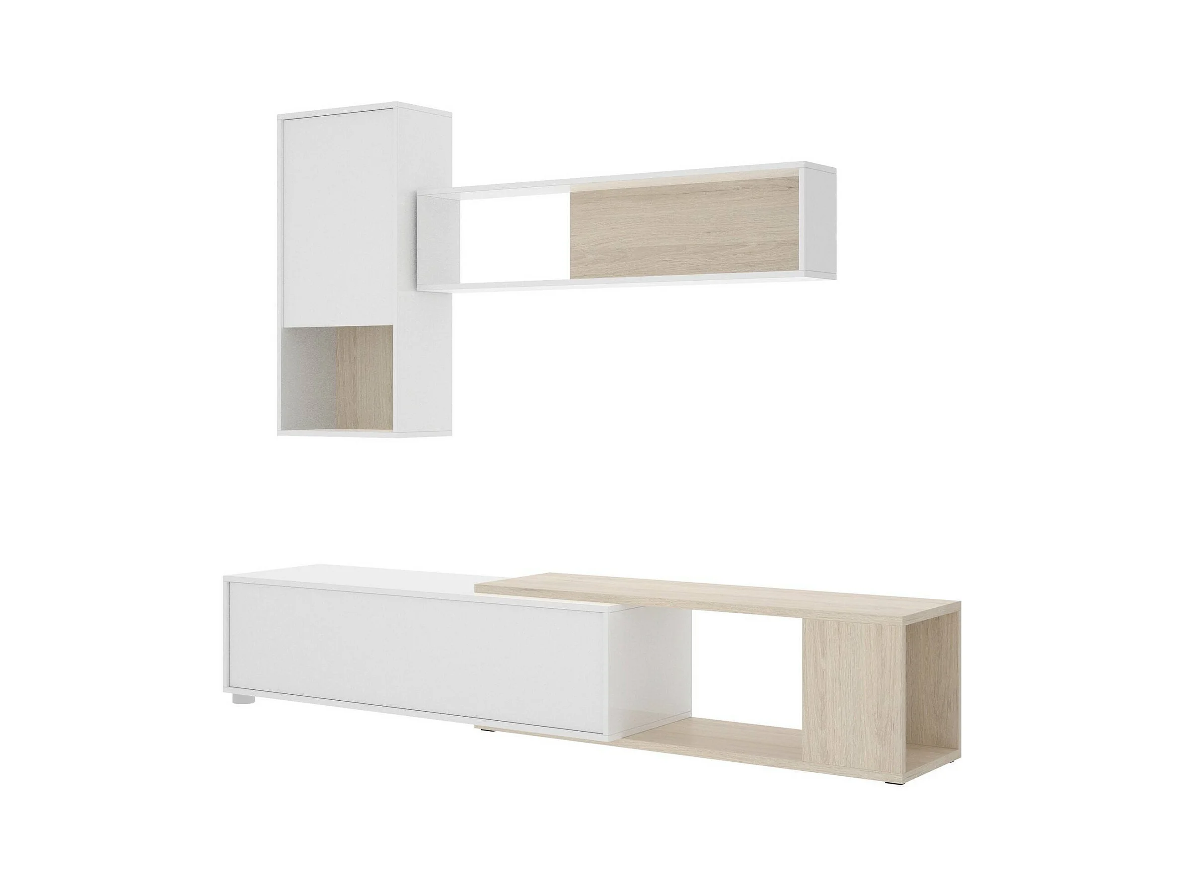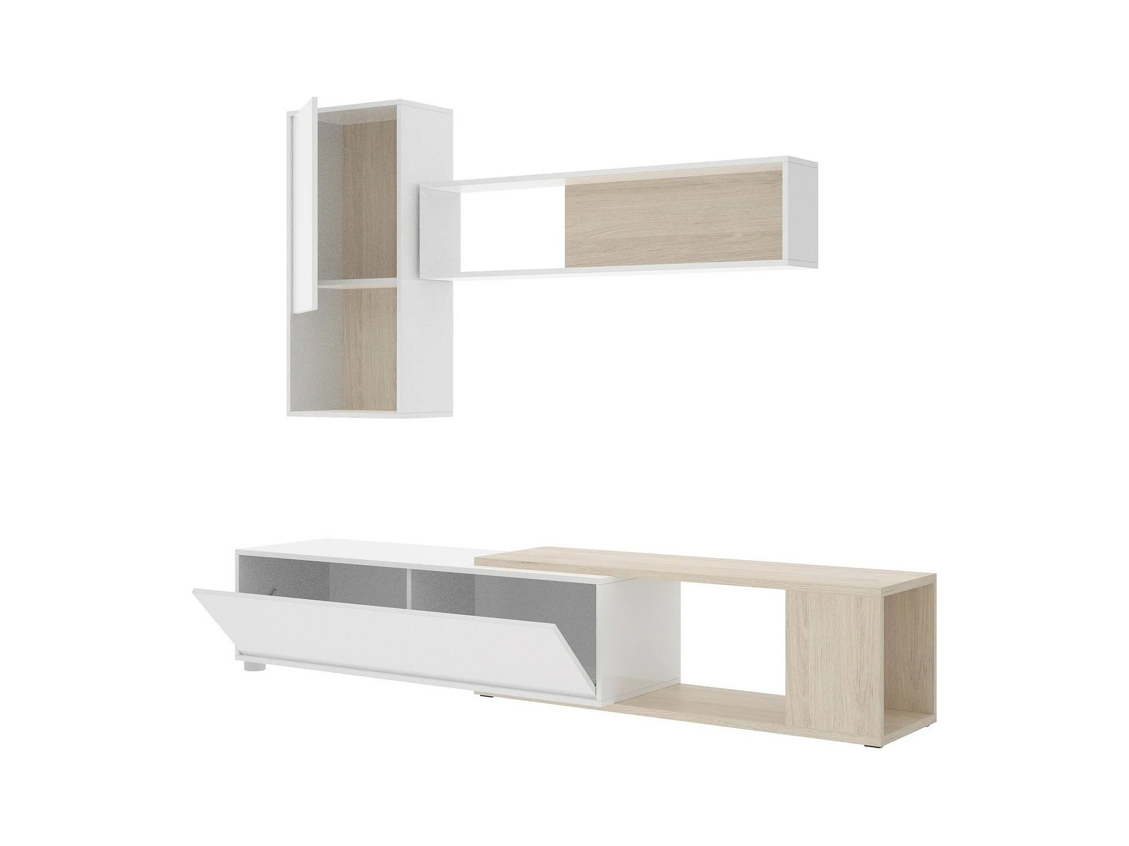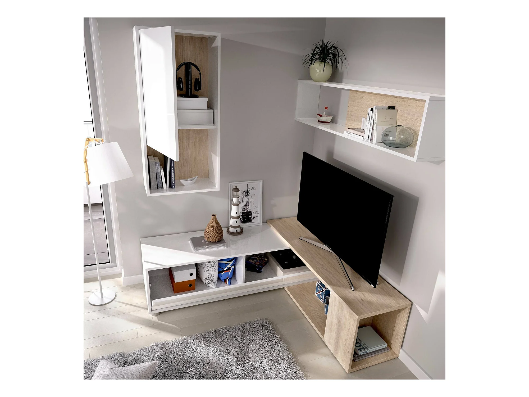 Système mural Legnone, Ensemble de salon d'angle modulable, Meubles de salon multi-positions, 230x41h180 cm, Blanc et Chêne