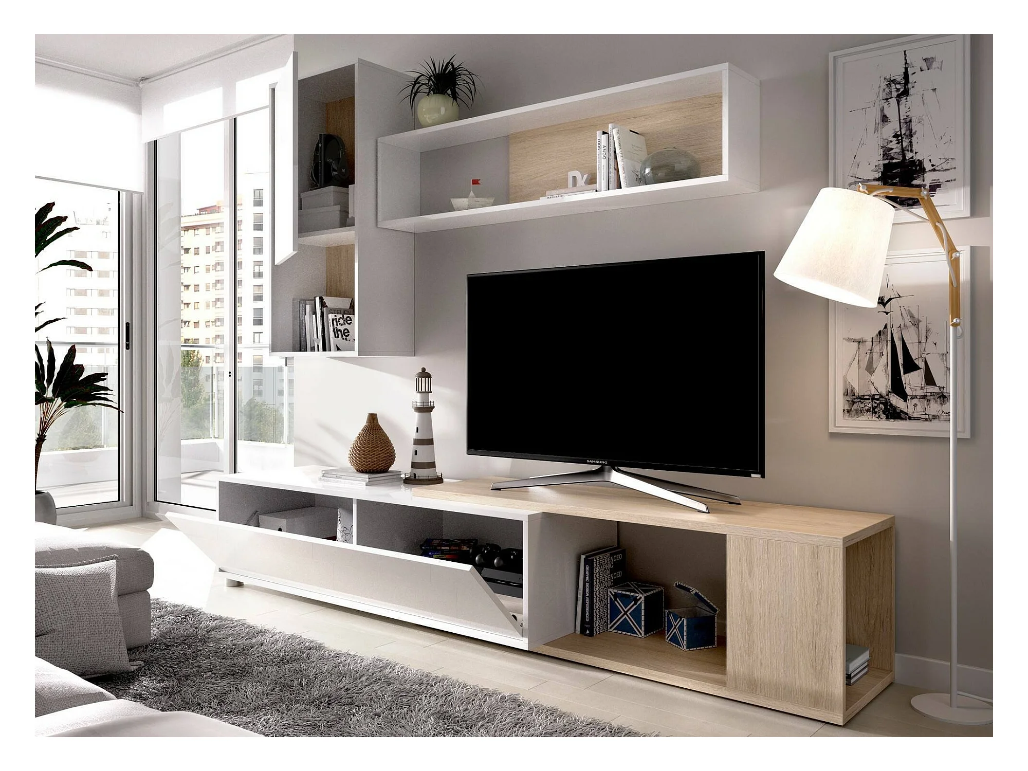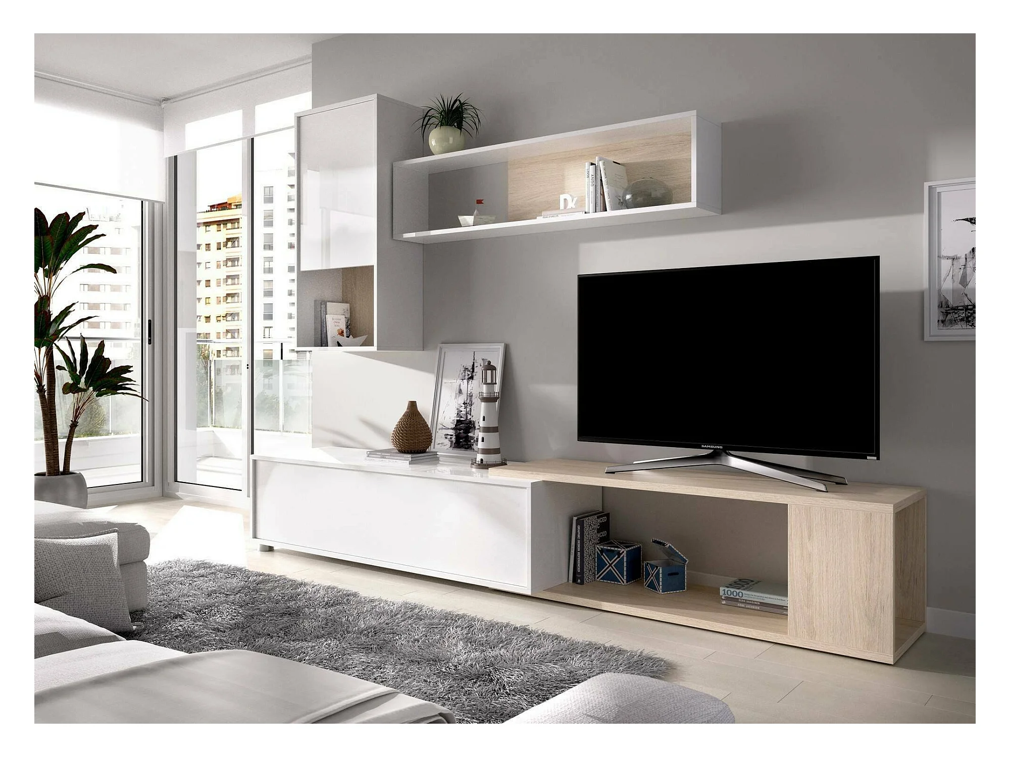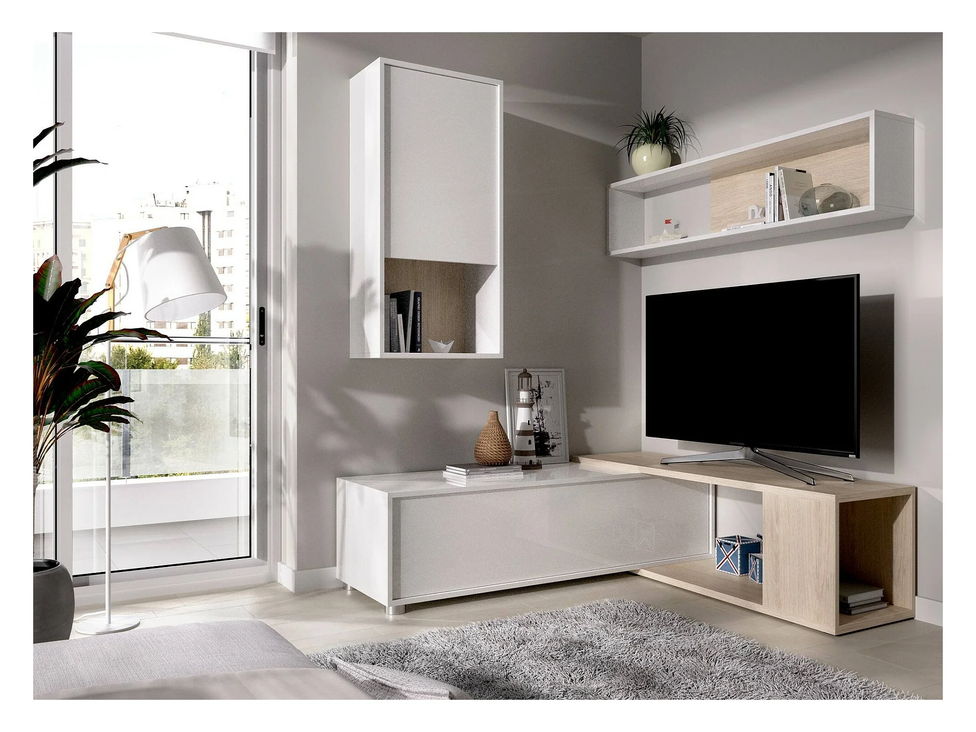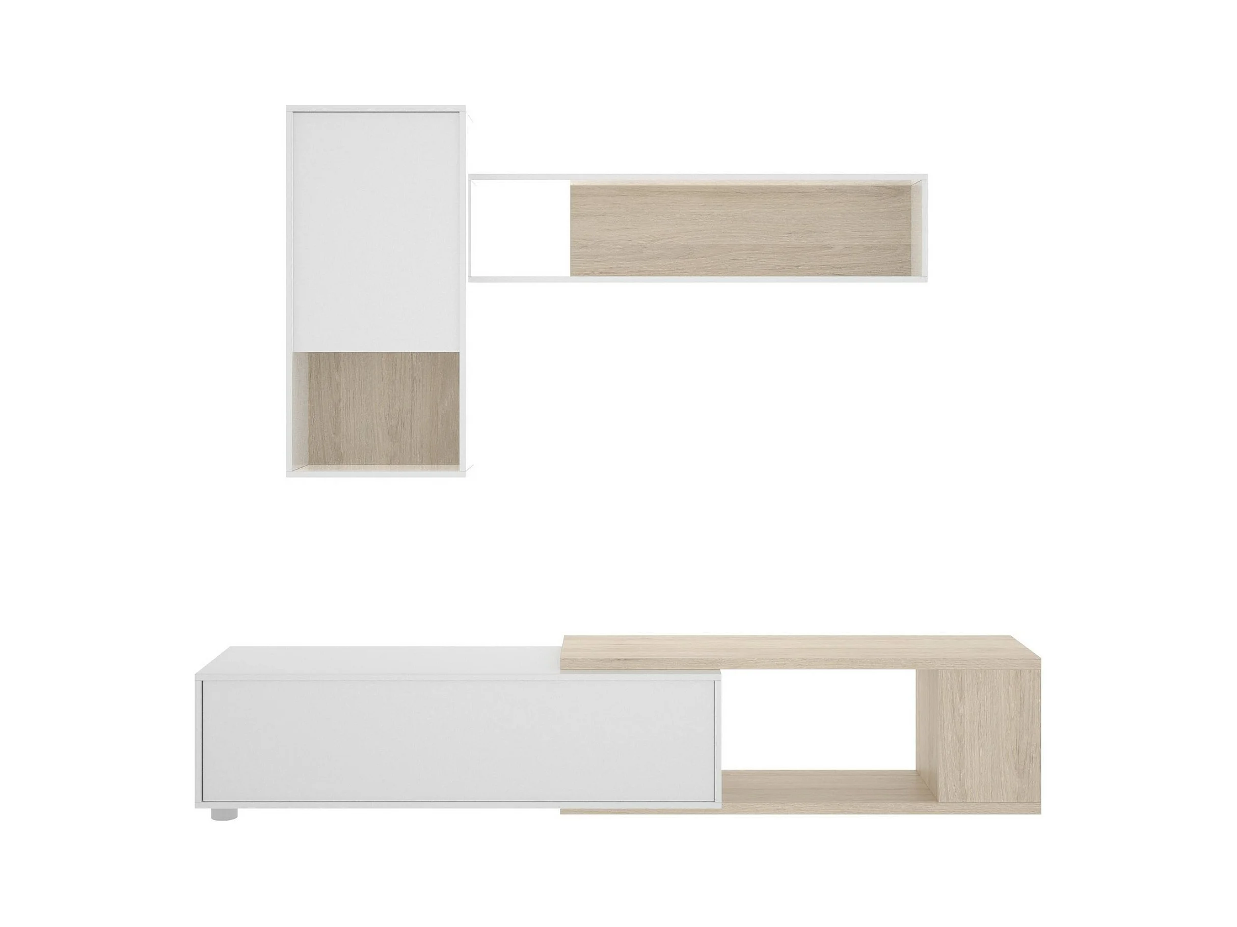 Système mural Legnone, Ensemble de salon d'angle modulable, Meubles de salon multi-positions, 230x41h180 cm, Blanc et Chêne
