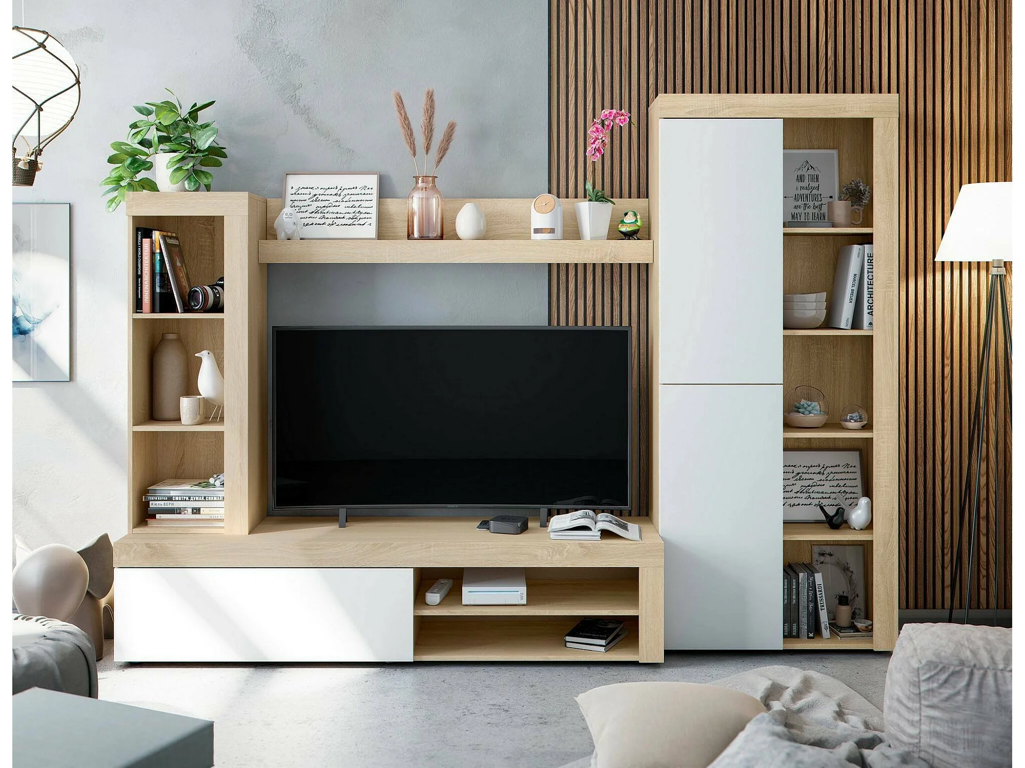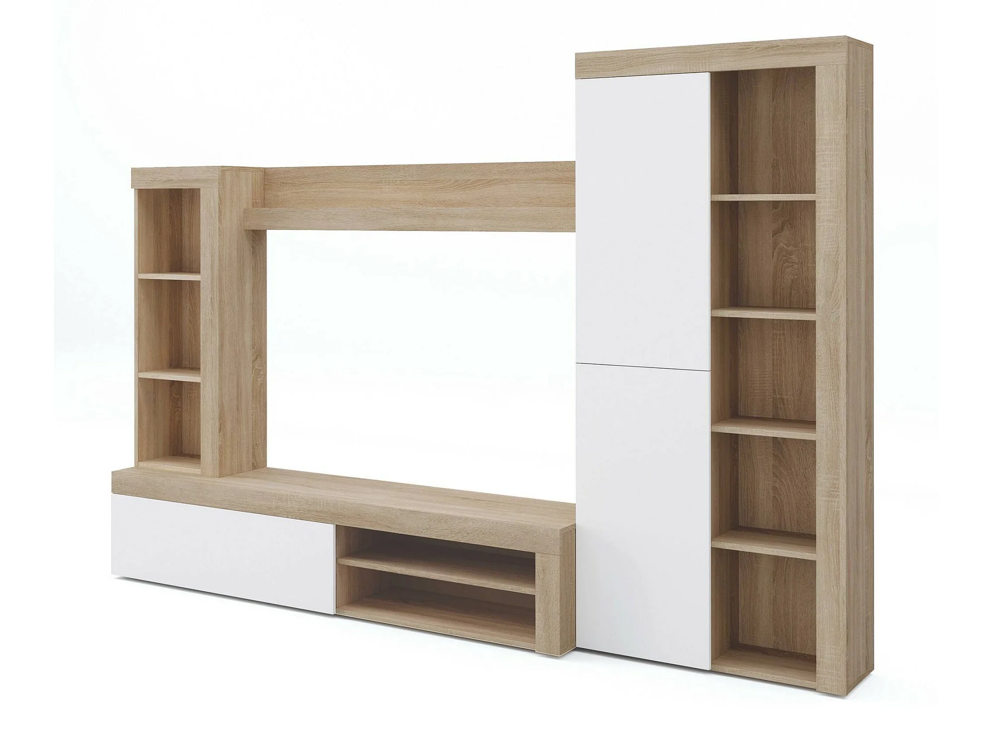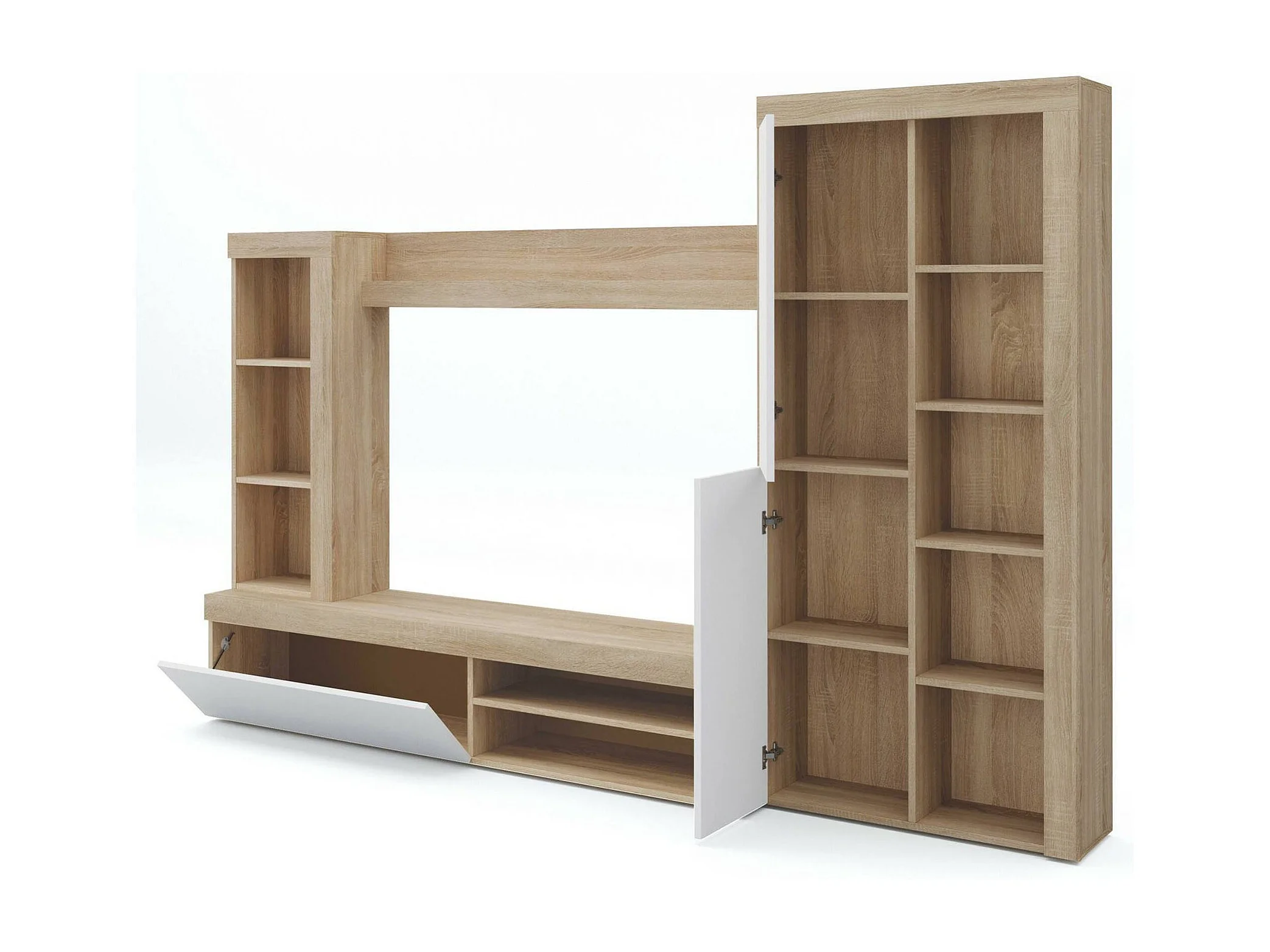Système mural Dmurar, Ensemble de salon moderne, Meubles de salon polyvalents, 240x30h175 cm, Blanc et Chêne