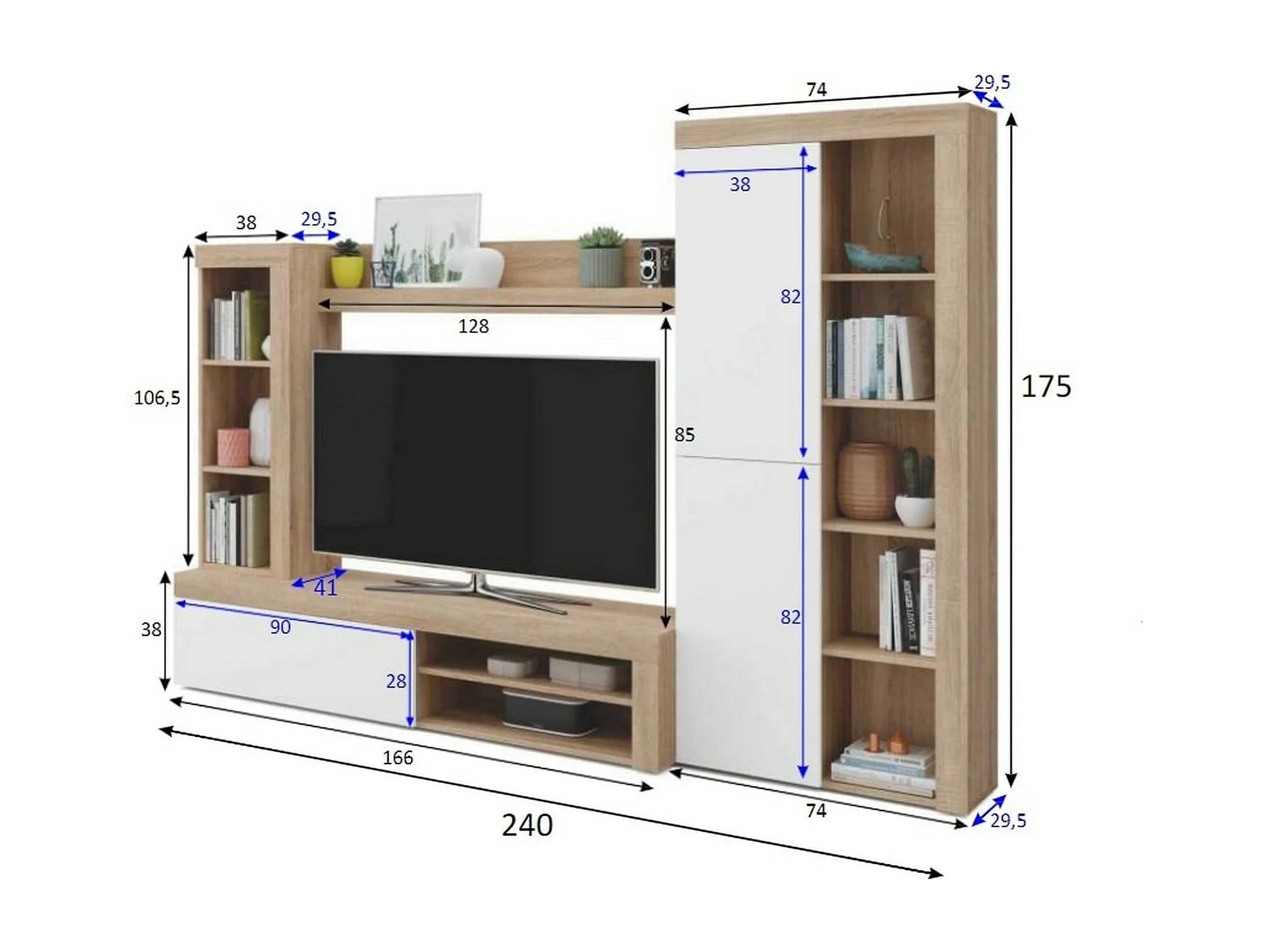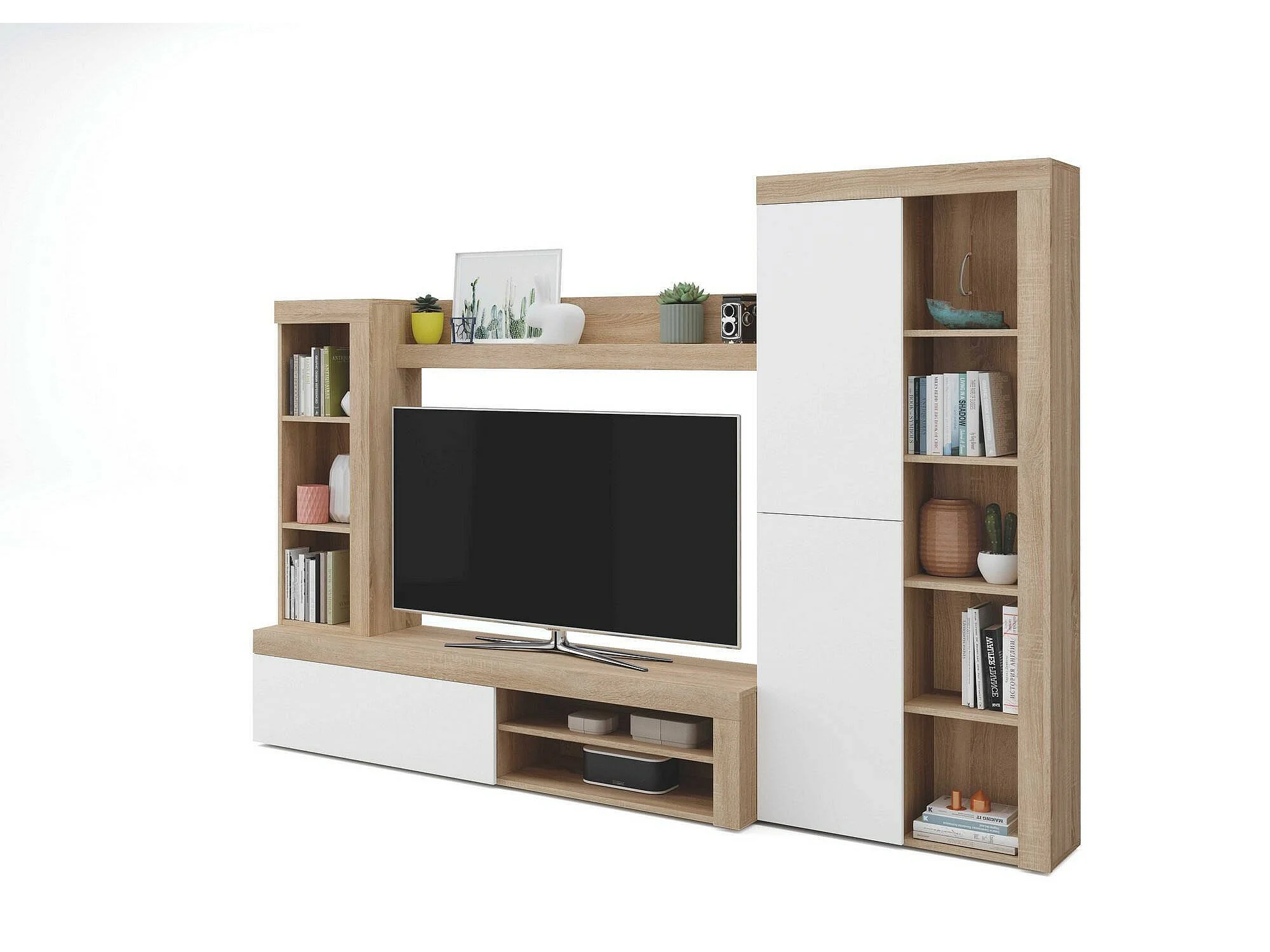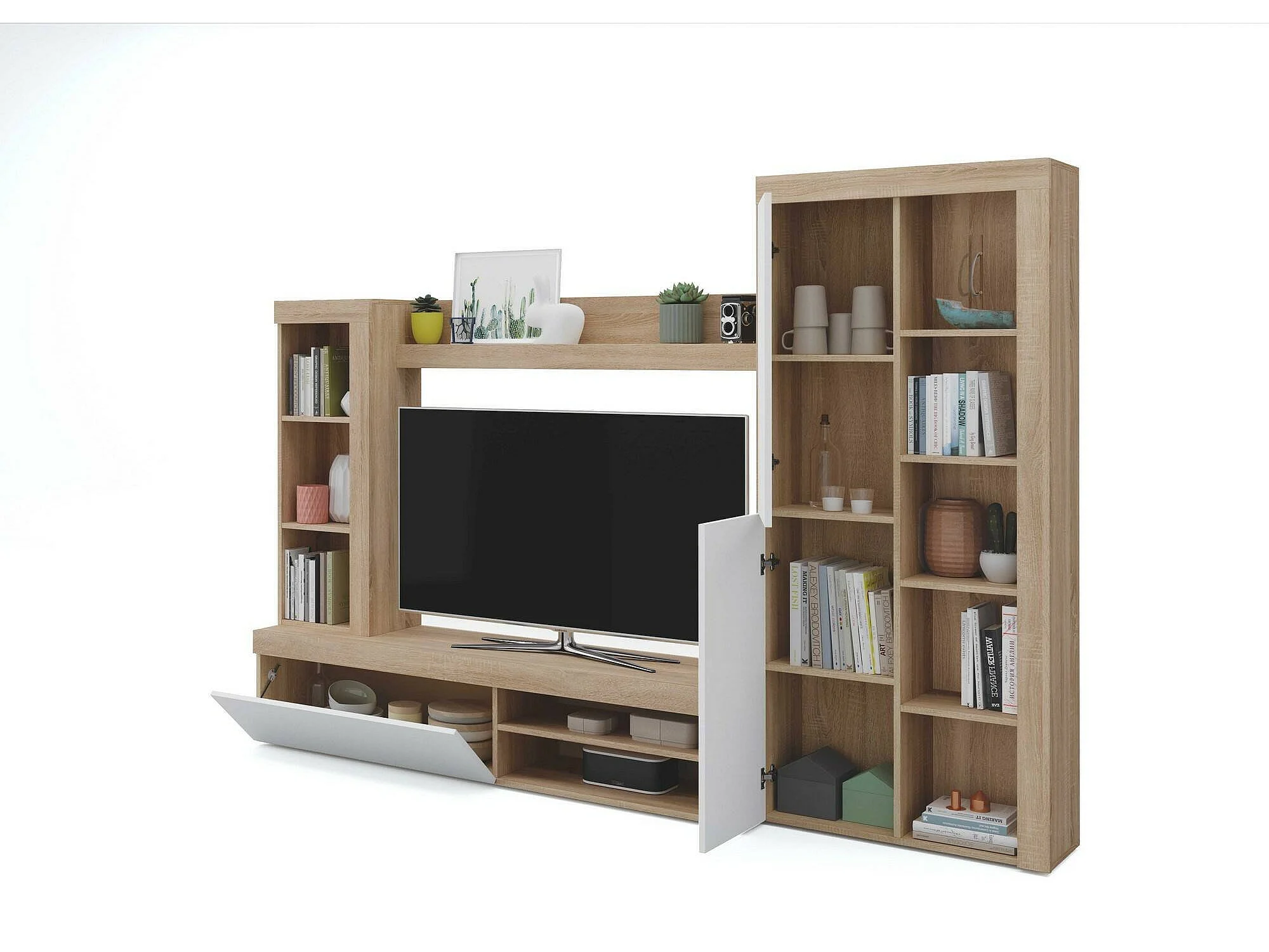 Système mural Dmurar, Ensemble de salon moderne, Meubles de salon polyvalents, 240x30h175 cm, Blanc et Chêne