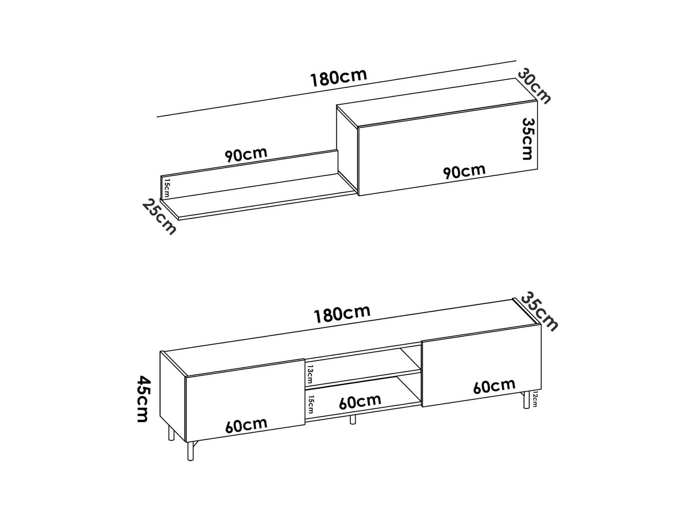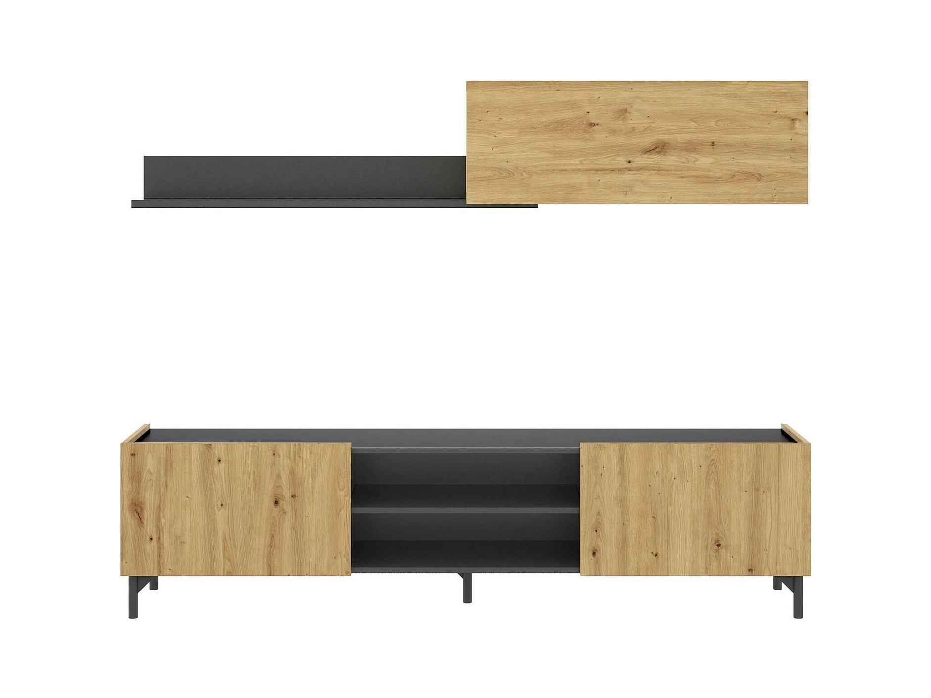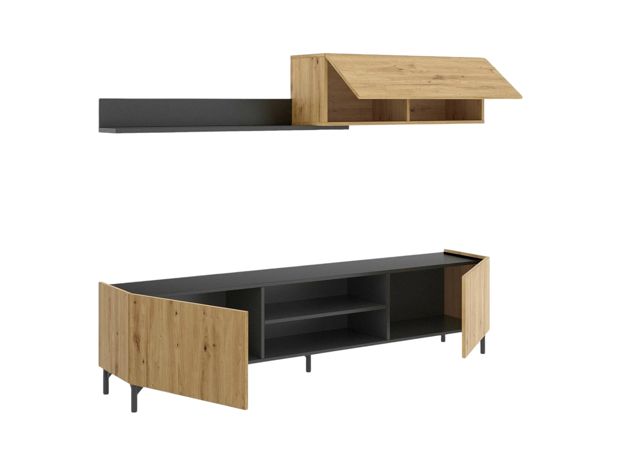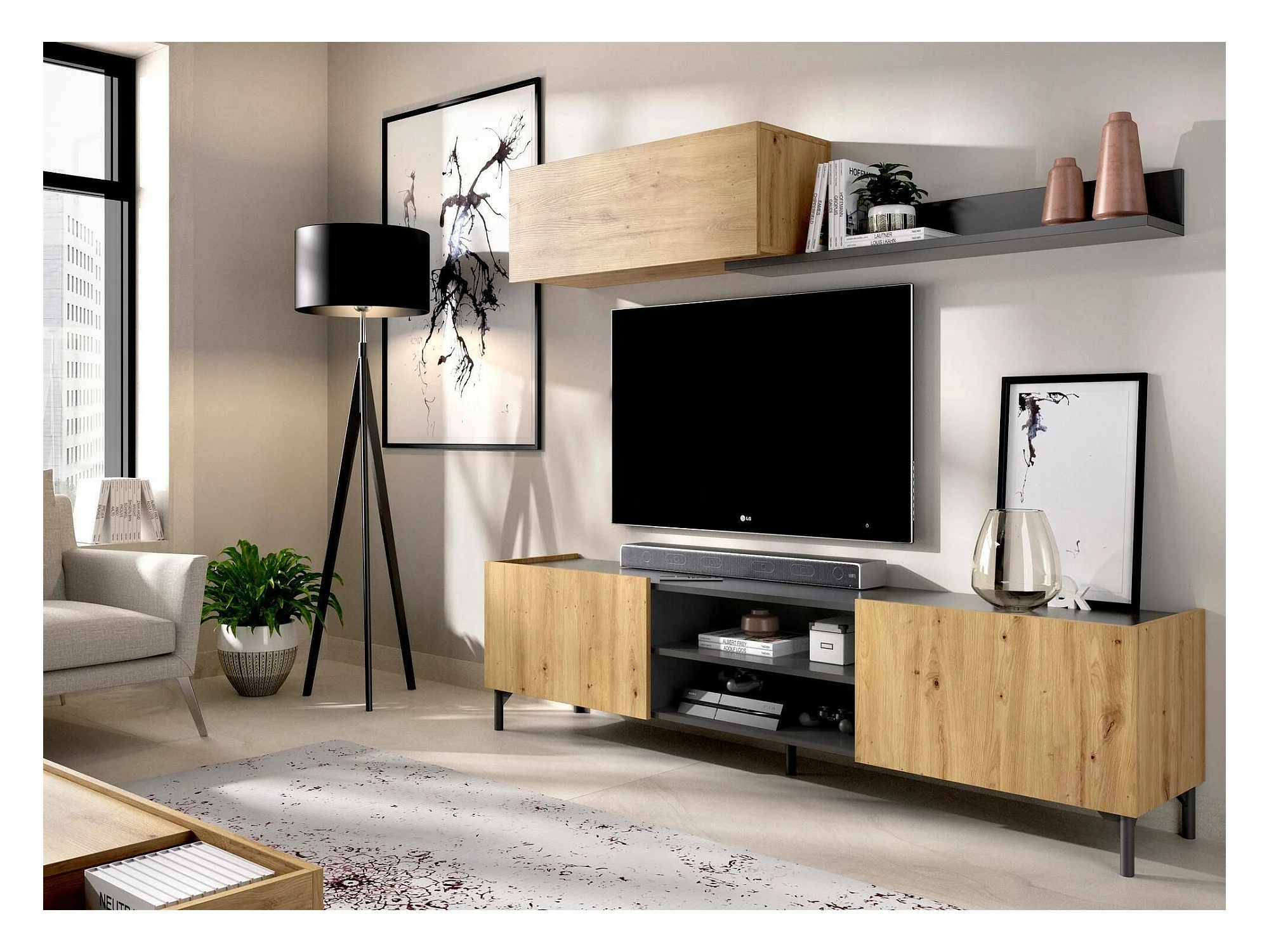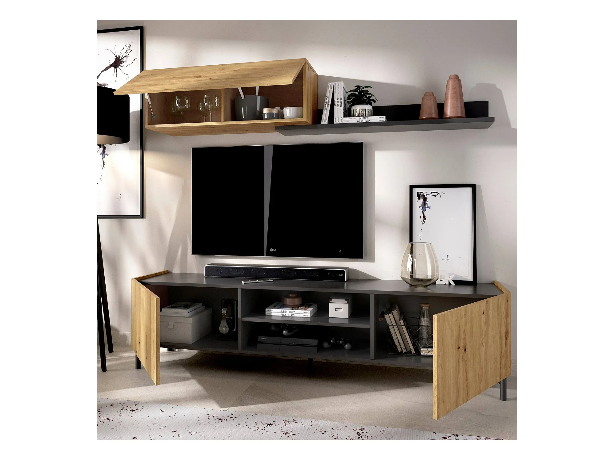 Système mural Korab, ensemble de salon meuble TV, meuble de salon polyvalent, 182x35h180 cm, Chêne noué et Anthracite
