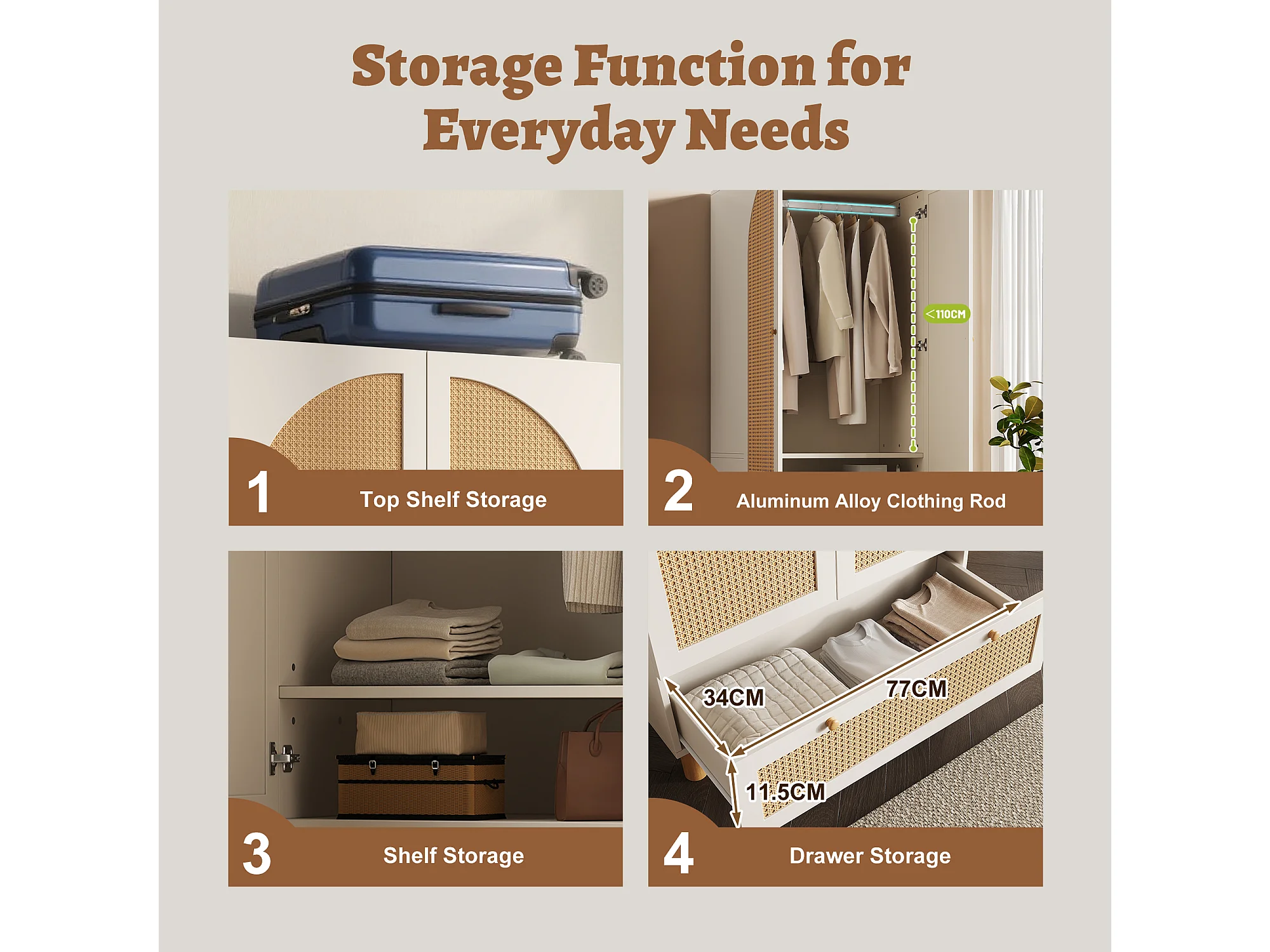 URBAN MEUBLE Armoire style champêtre 2 portes et tiroir en rotin, penderie et étagères ajustables
