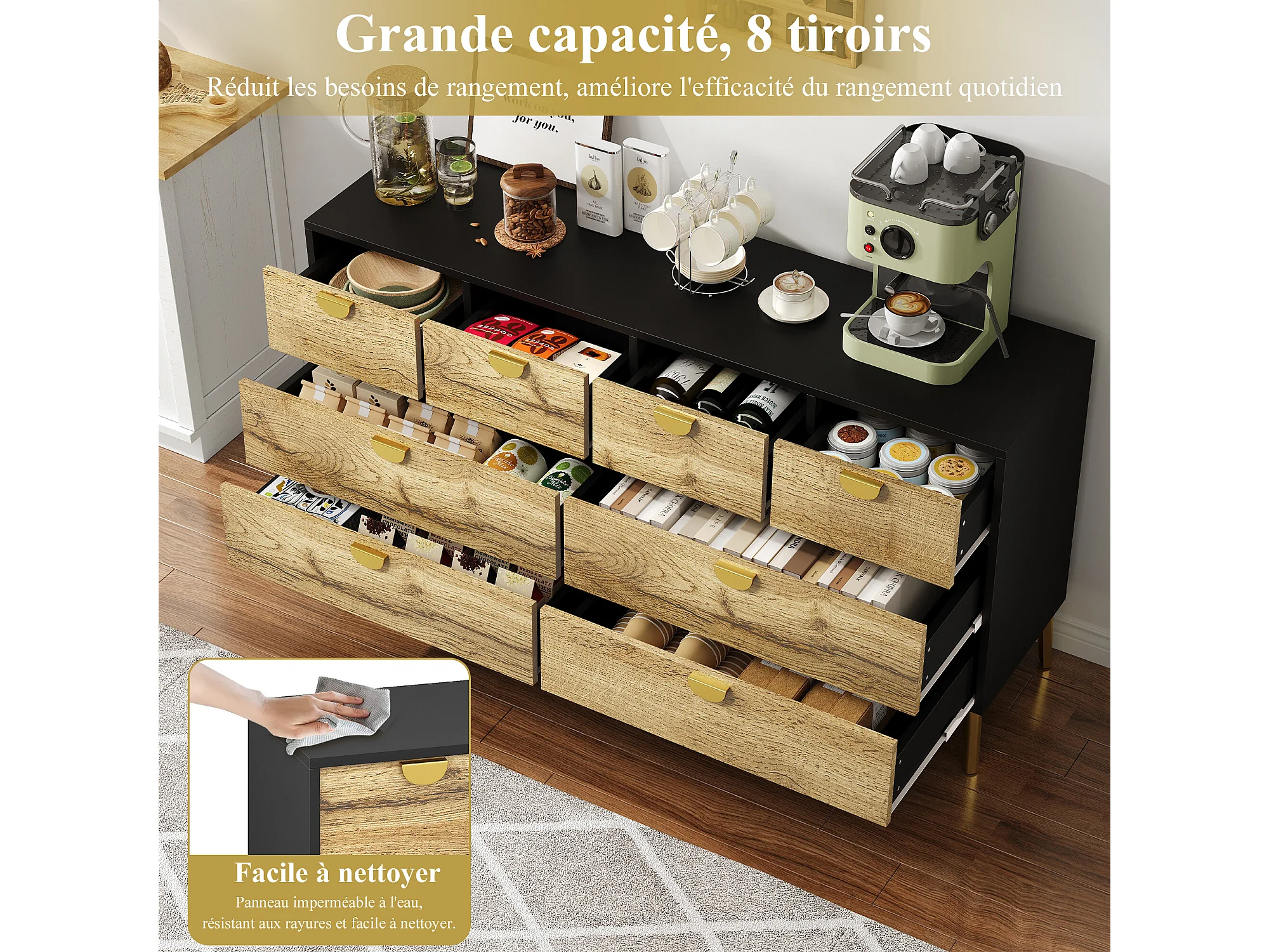 URBAN MEUBLE Buffet effet bois et noir avec 8 tiroirs poignée et pieds dorés 150*40*78cm