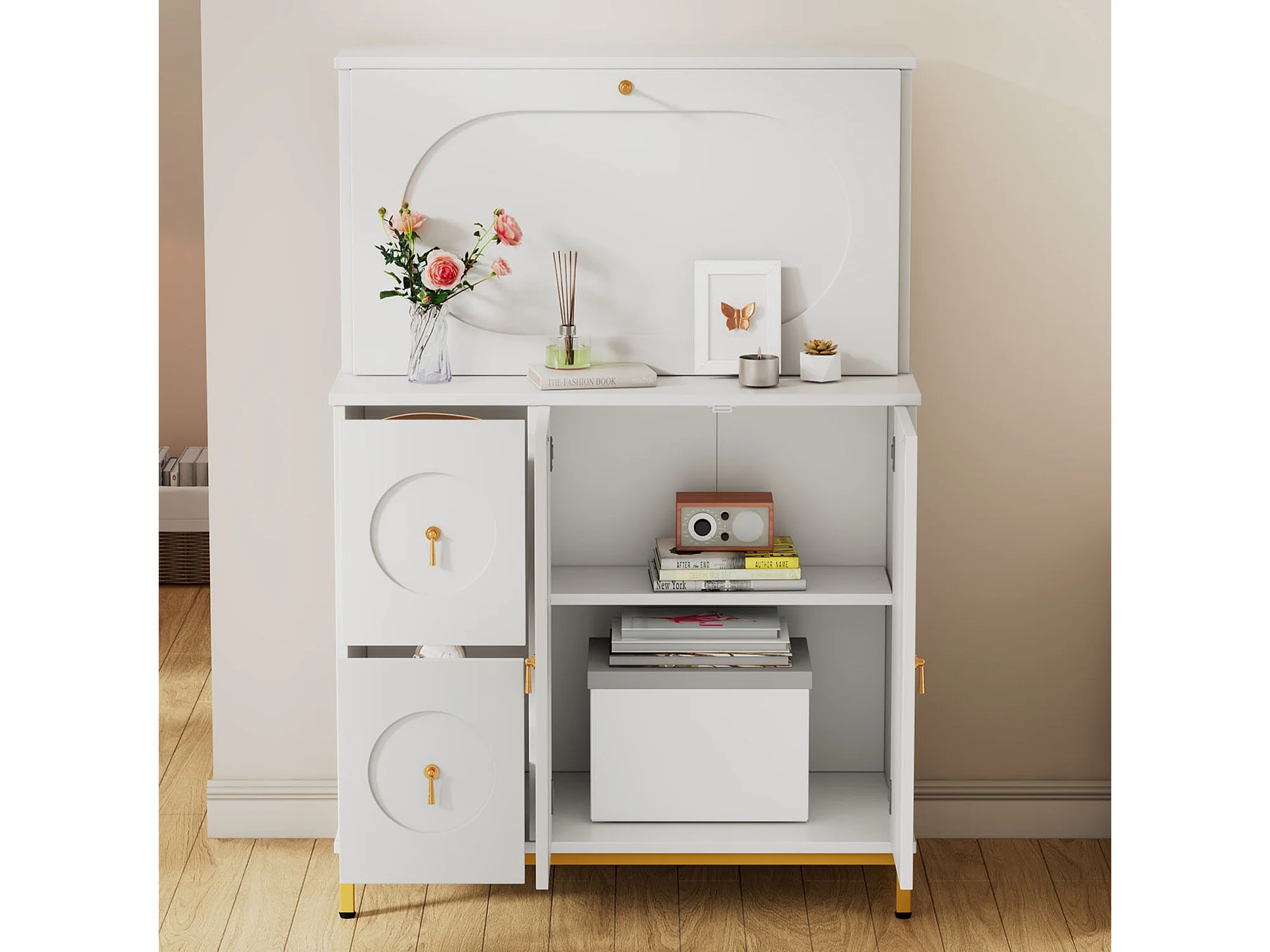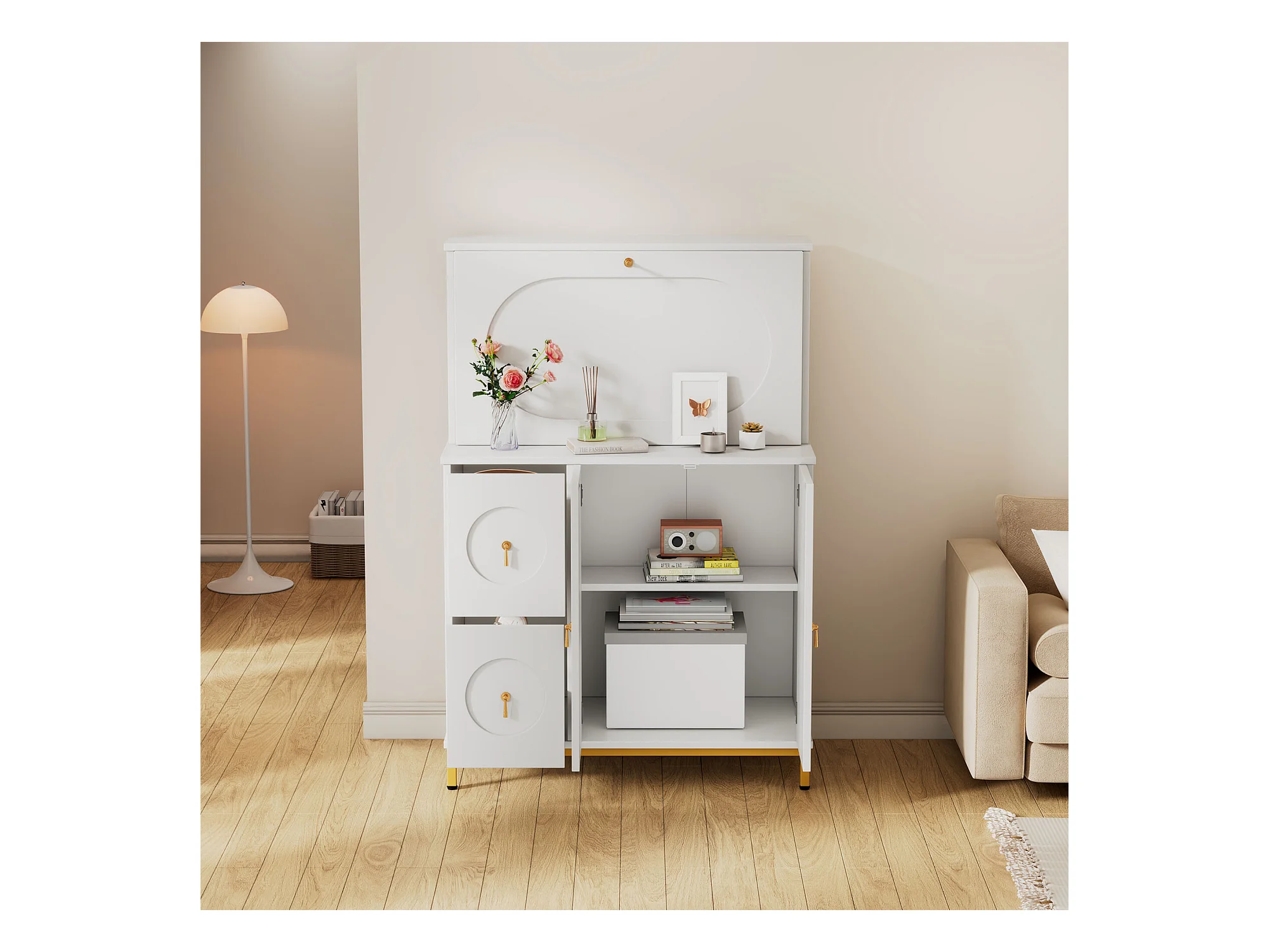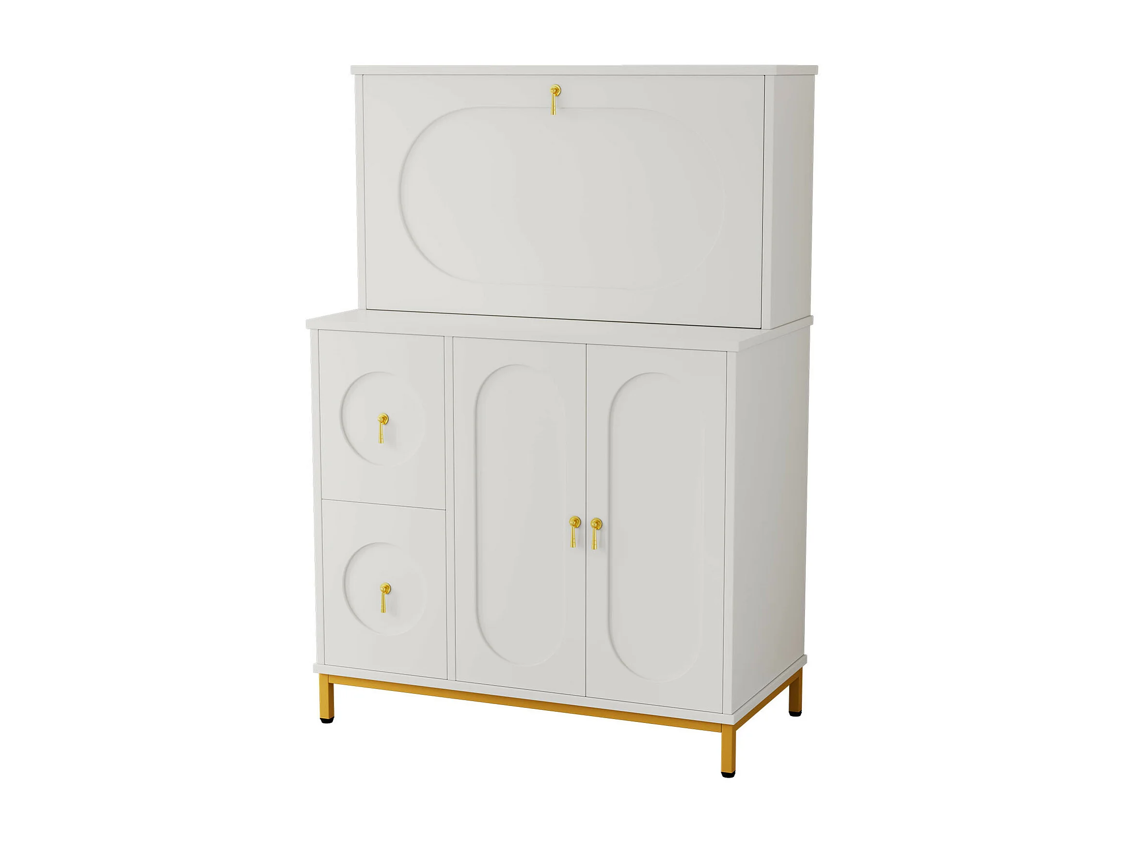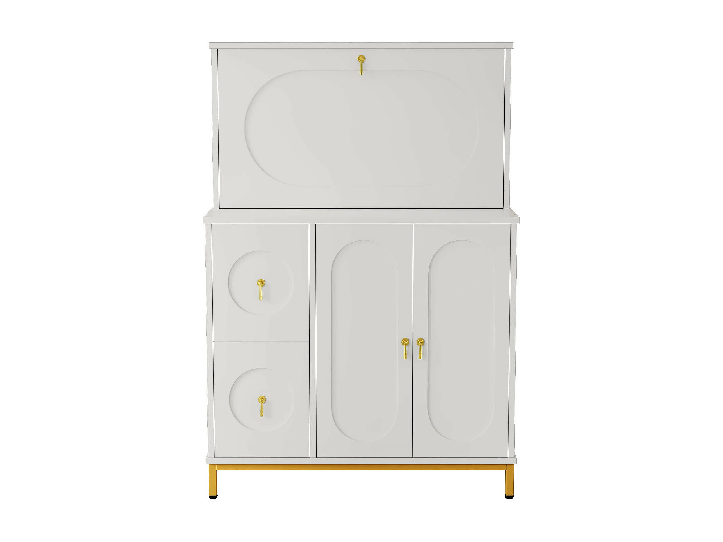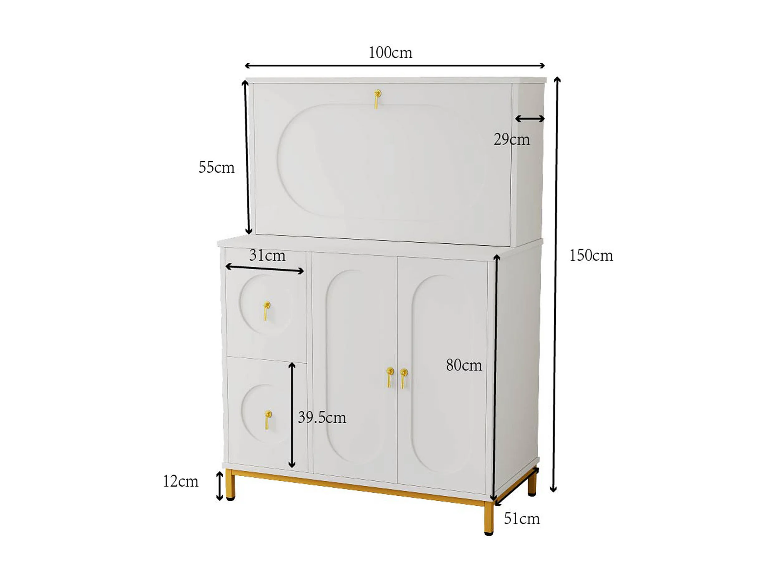 URBAN MEUBLE Buffet haute bureau blanc étagère tablette retractable poignets dorés 100*51*150cm