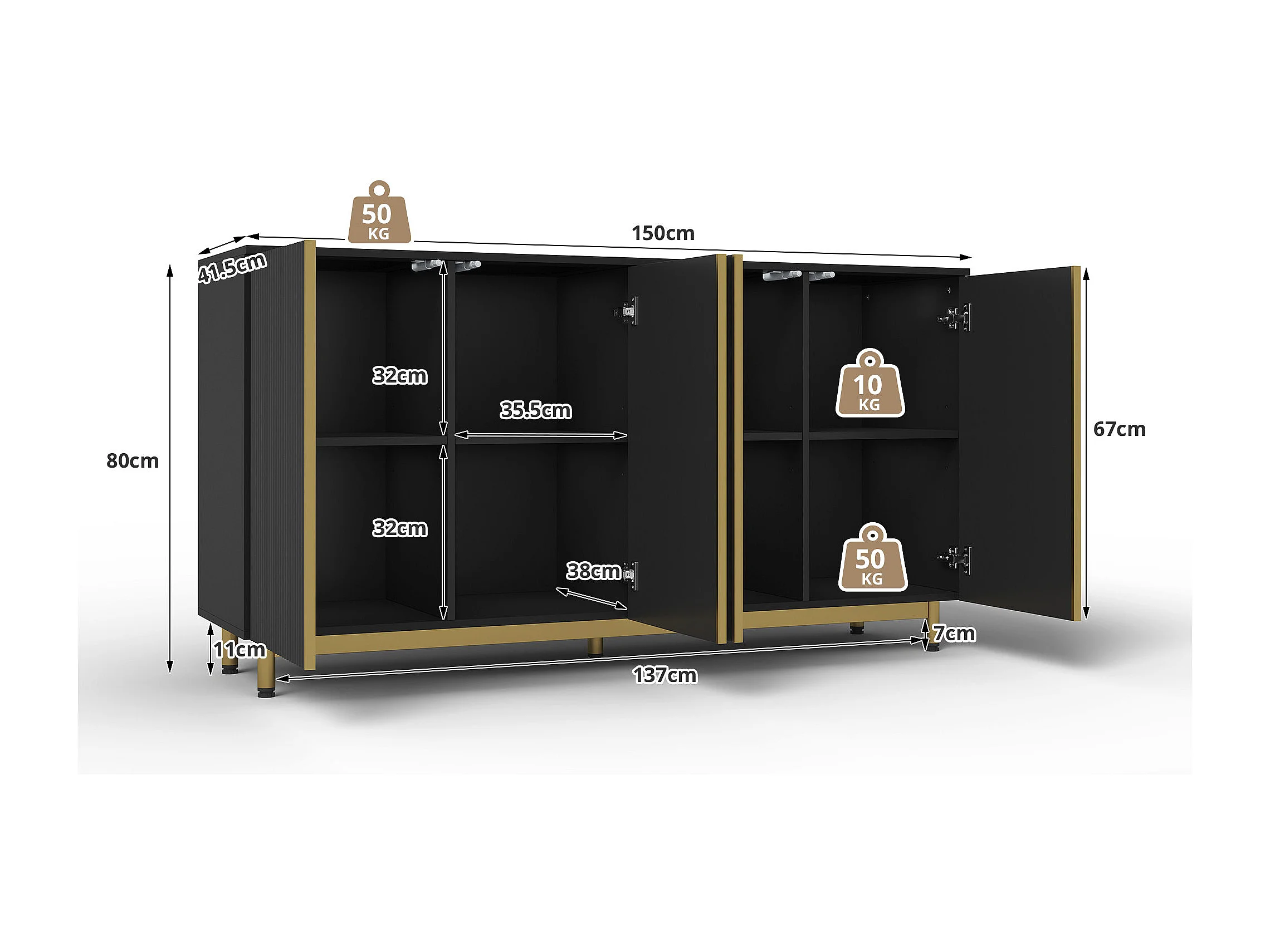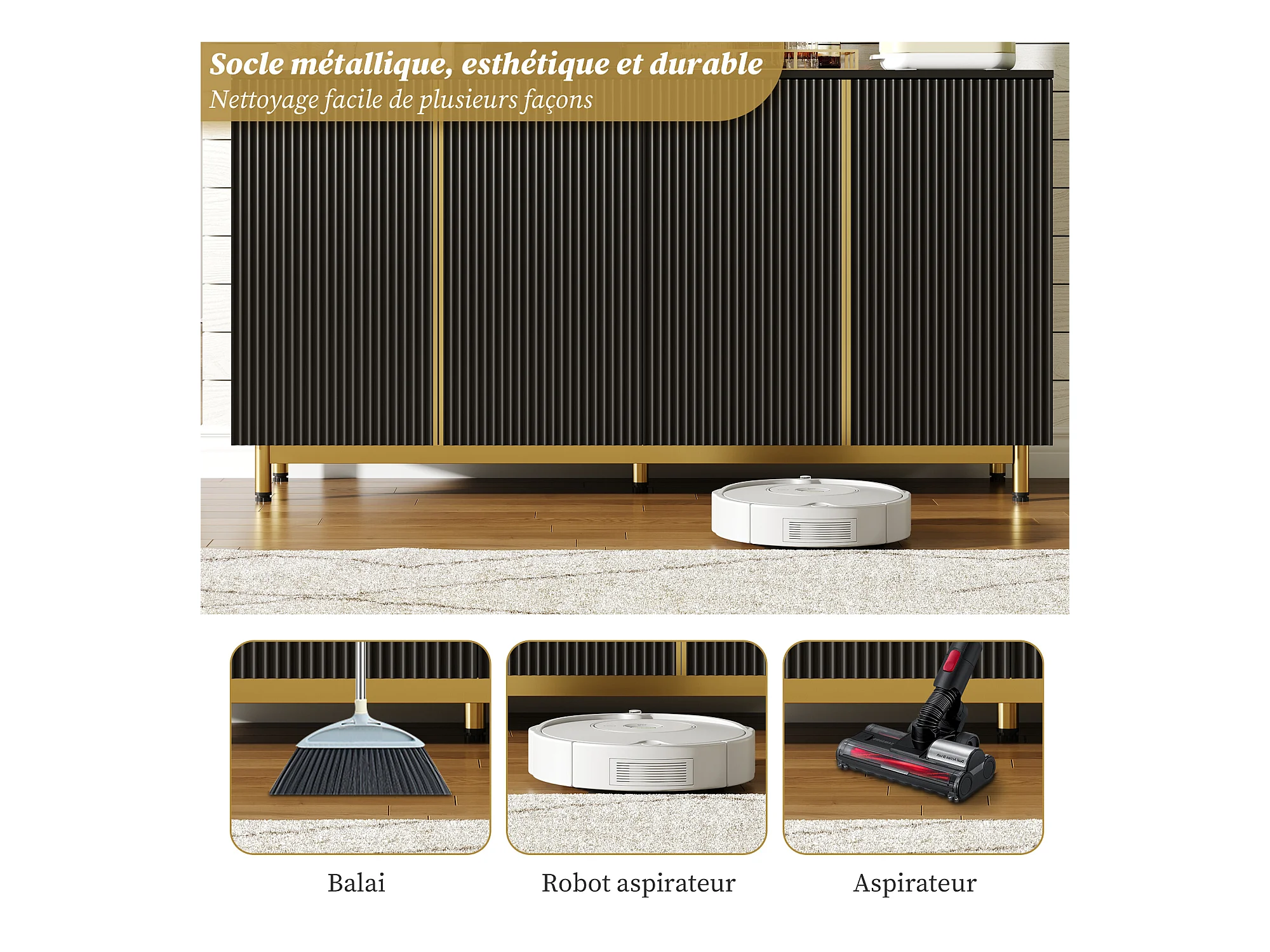 URBAN MEUBLE Buffet moderne noir 4 portes texturés et accents dorés